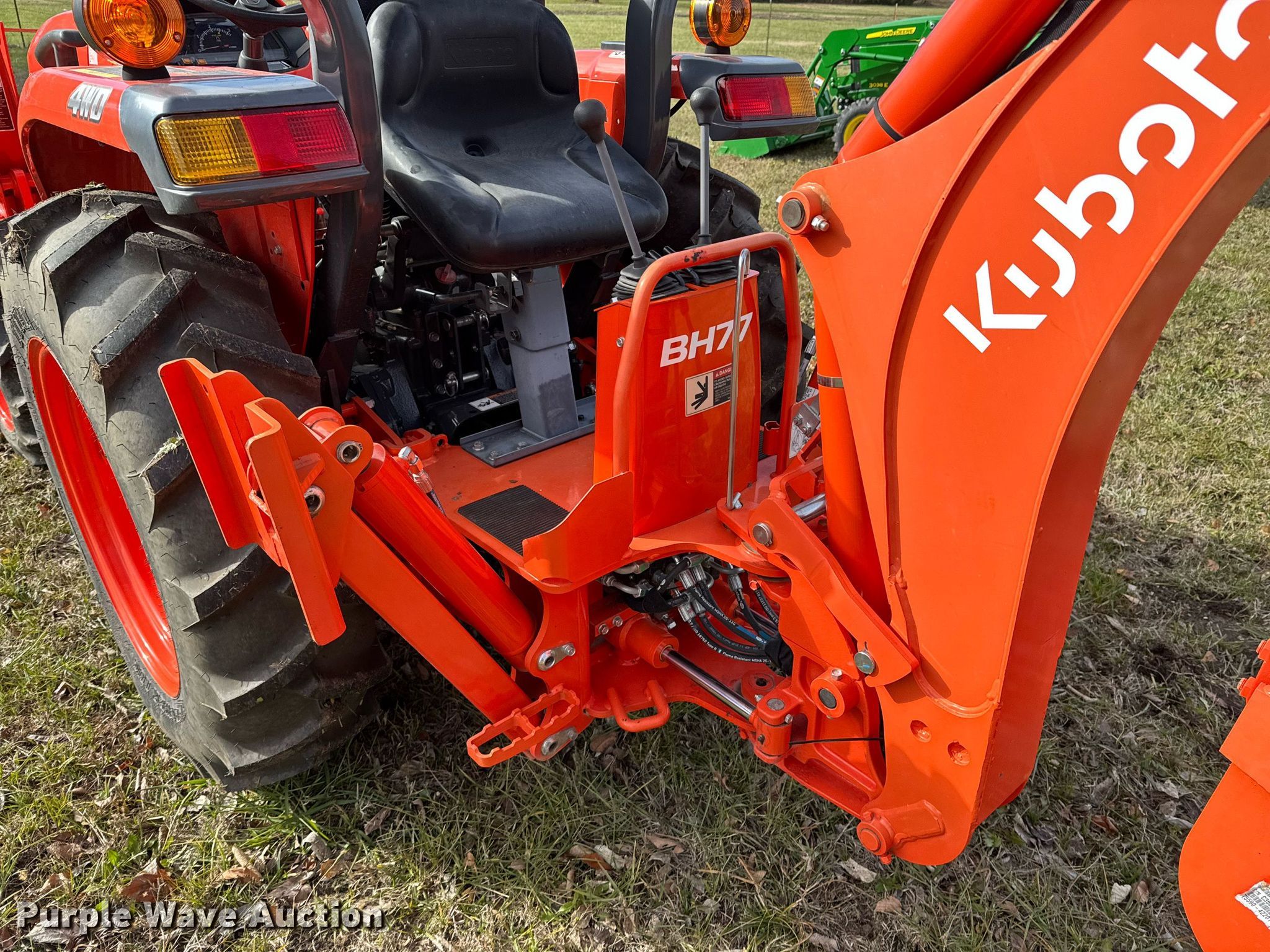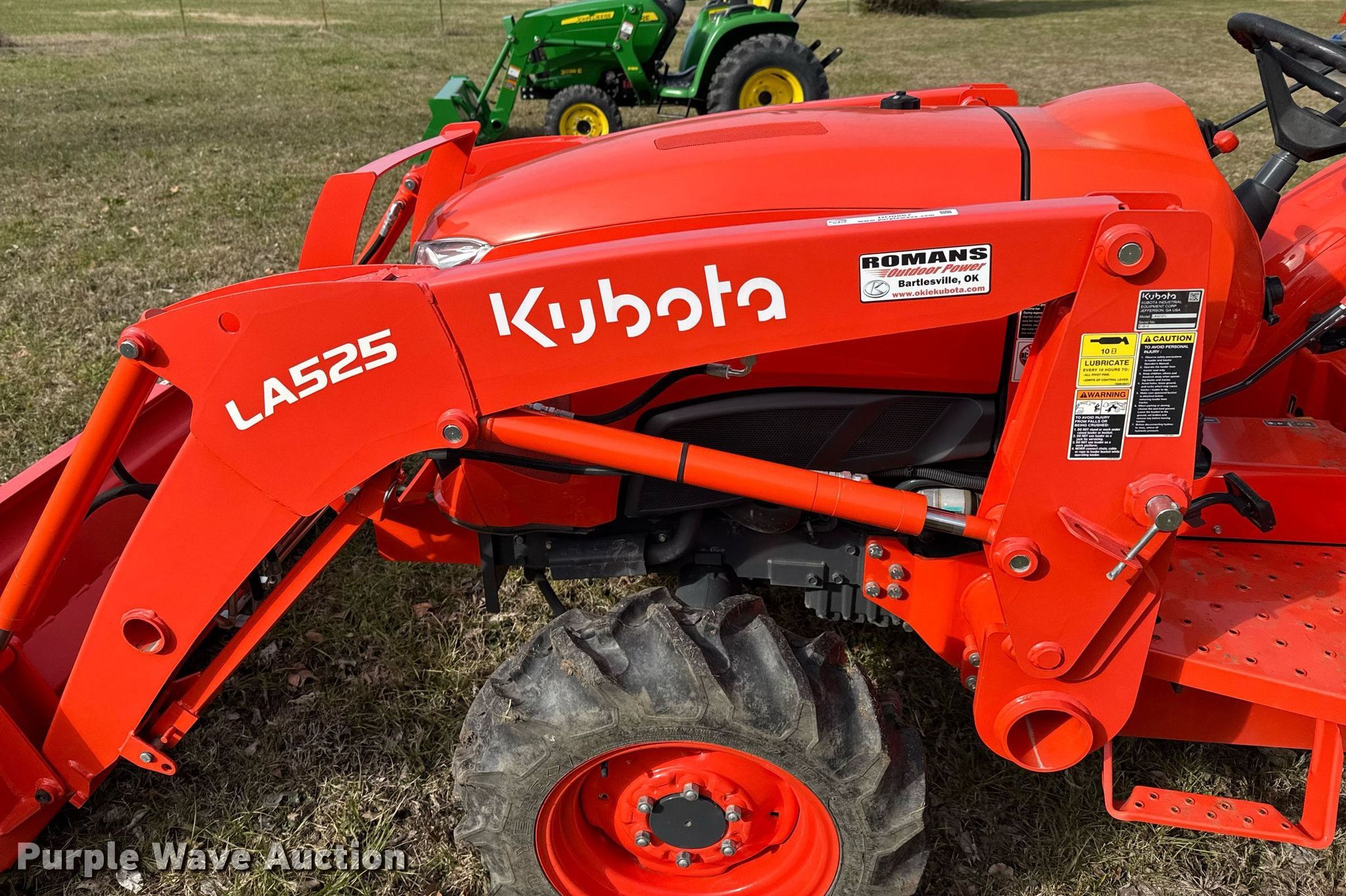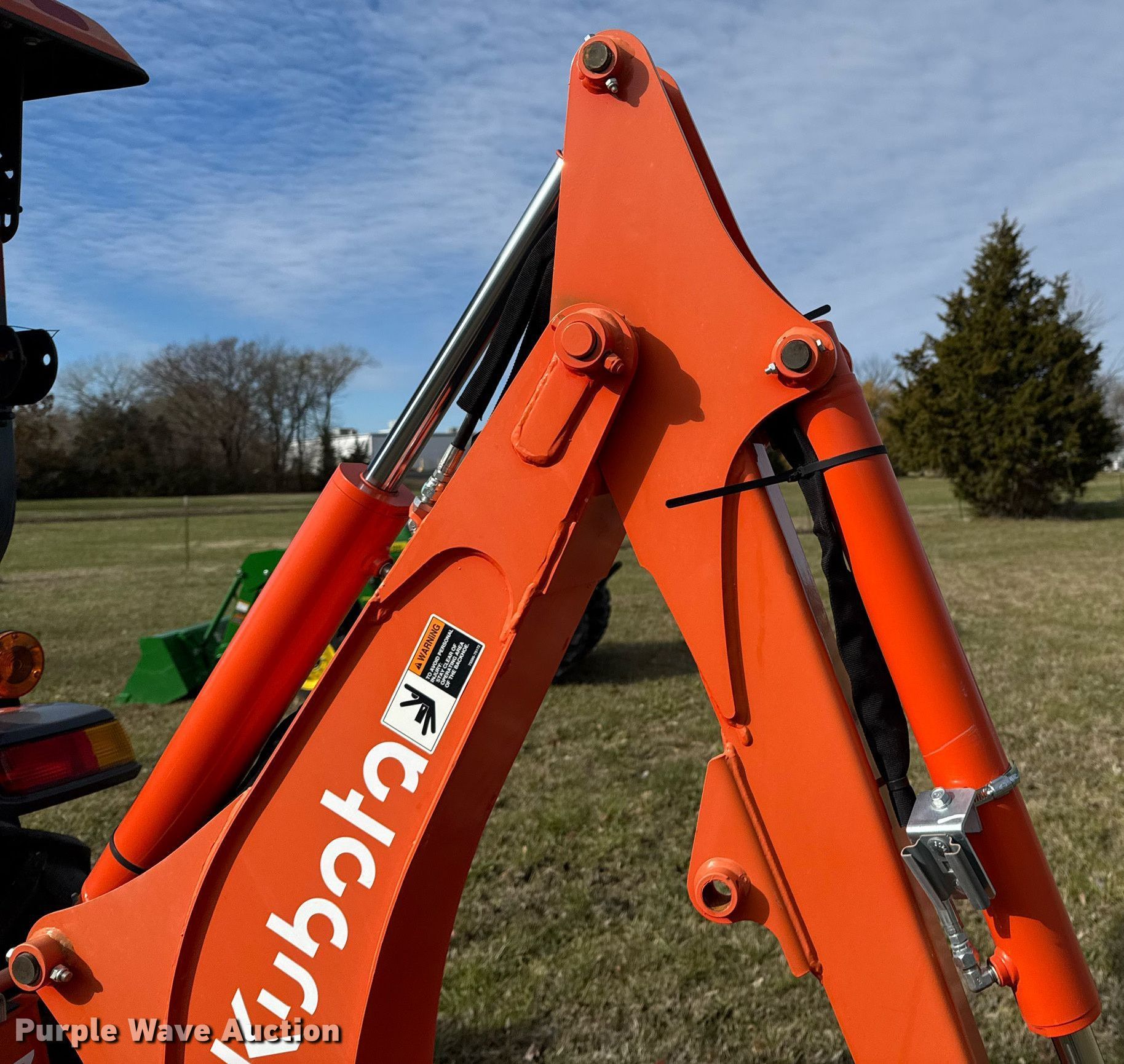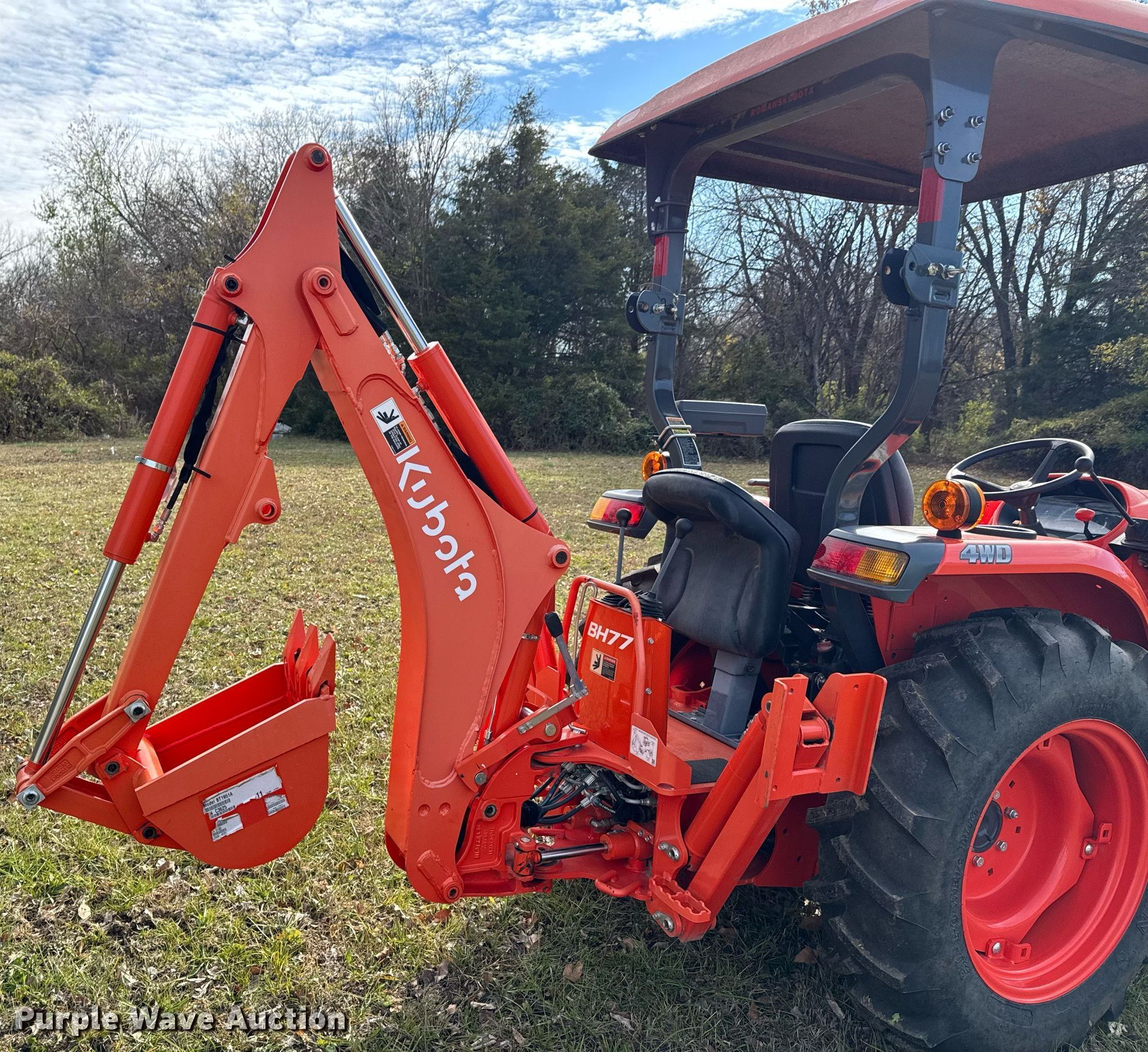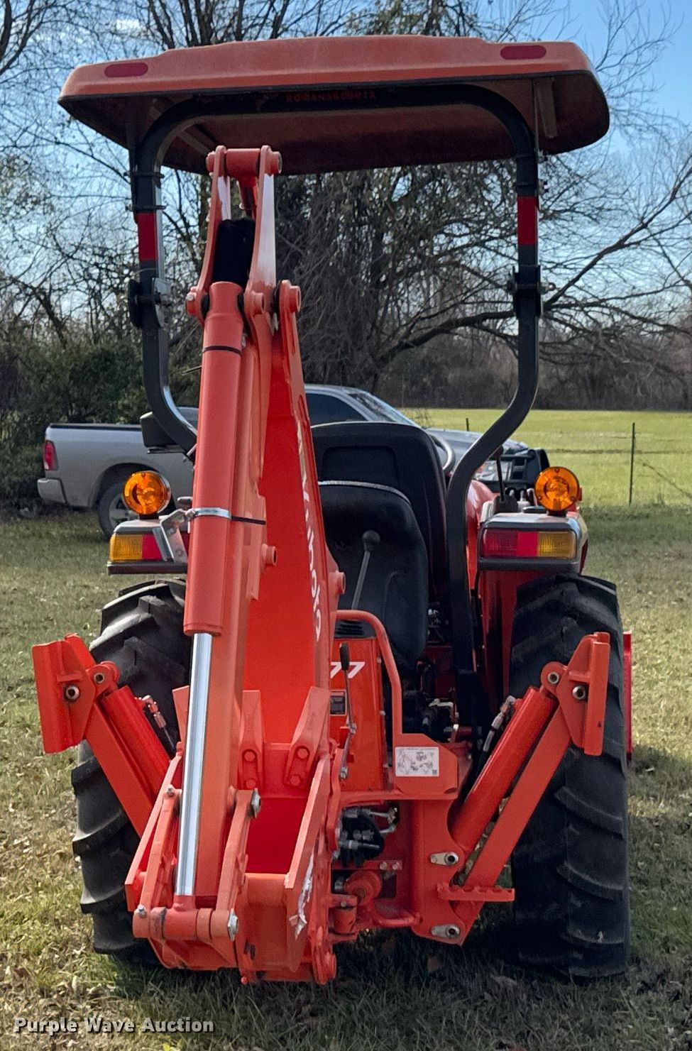 Kubota L3901D MFWD tractor. Hours: 24 on meter, Serial: KBUL4BDRPMJB94072. Engine Kubota, Cylinders: 3, Fuel type: Diesel. Transmission Synchro, 8F - 8R. Chassis Four wheel drive. Features Three point, Hydraulic remote sets Rear: 1, Loader Kubota LA525, Controls: Joystick, Bucket Width: 60", Cutting edge: Weld-on, Kubota BH77 backhoe attachment Backhoe controls: Wobble stick / two stick, Bucket Width: 12", Teeth: 3.. Tires Front: 7.2-16, Rear: 11.2-24. Romans Outdoor Power, Inc.. Independence, KS 67301