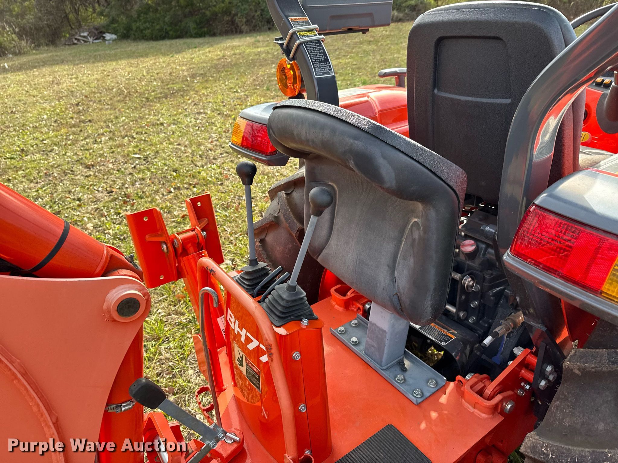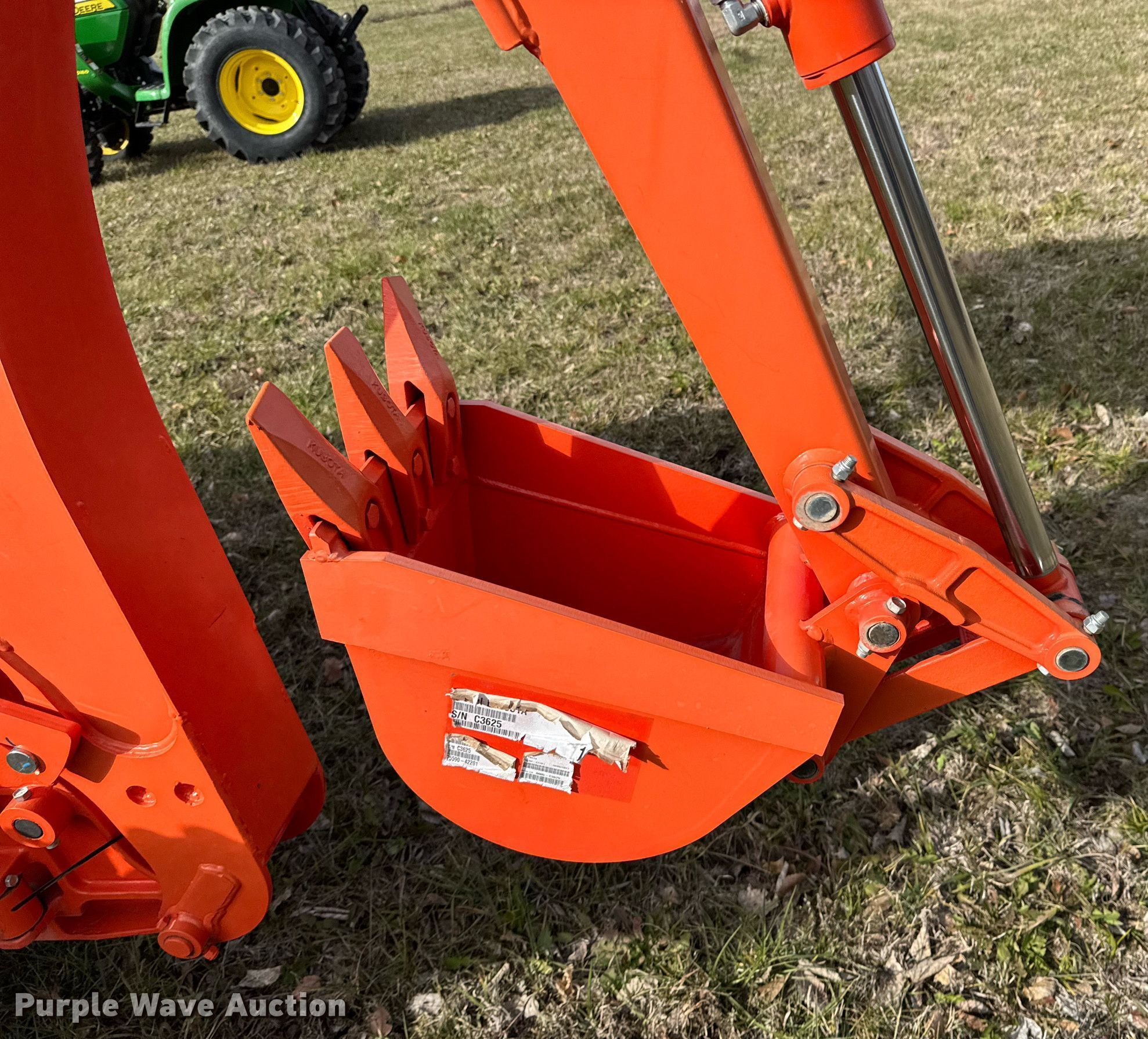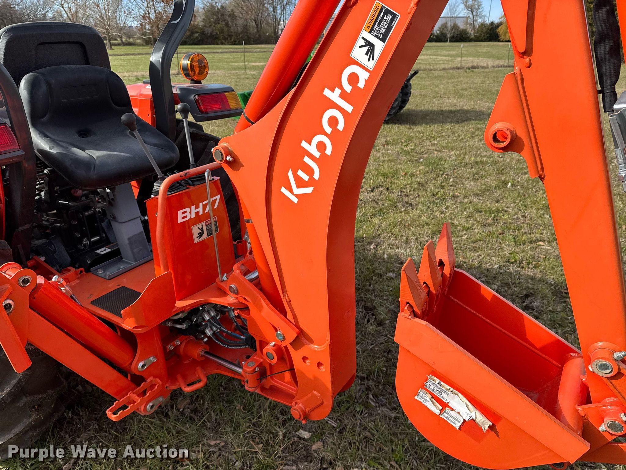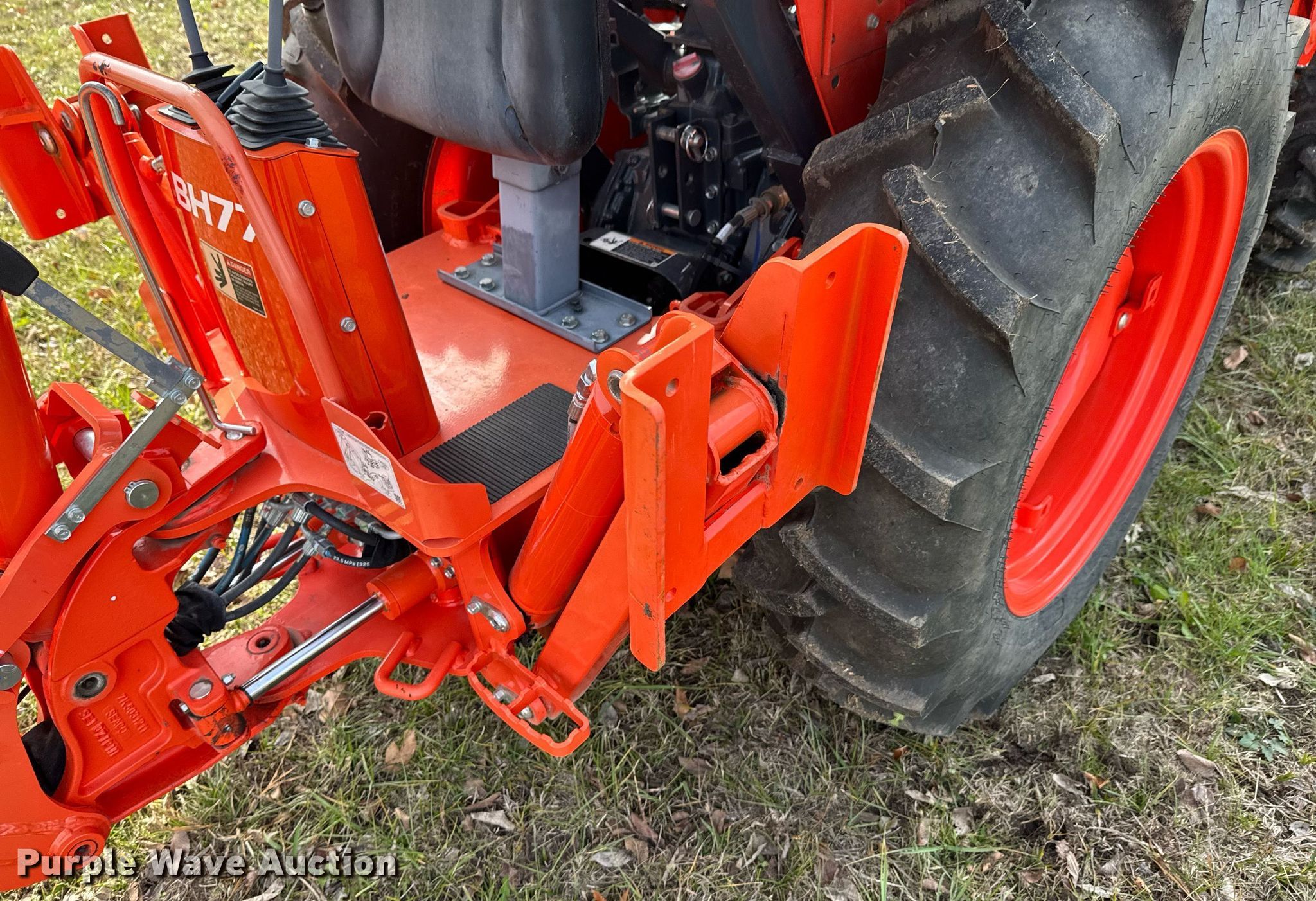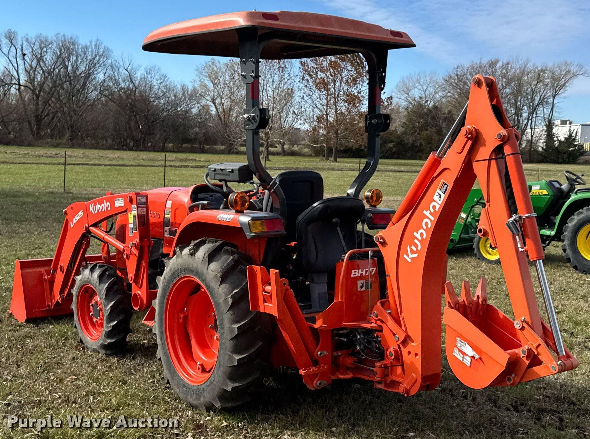 Kubota L3901D MFWD tractor. Hours: 24 on meter, Serial: KBUL4BDRPMJB94072. Engine Kubota, Cylinders: 3, Fuel type: Diesel. Transmission Synchro, 8F - 8R. Chassis Four wheel drive. Features Three point, Hydraulic remote sets Rear: 1, Loader Kubota LA525, Controls: Joystick, Bucket Width: 60", Cutting edge: Weld-on, Kubota BH77 backhoe attachment Backhoe controls: Wobble stick / two stick, Bucket Width: 12", Teeth: 3.. Tires Front: 7.2-16, Rear: 11.2-24. Romans Outdoor Power, Inc.. Independence, KS 67301