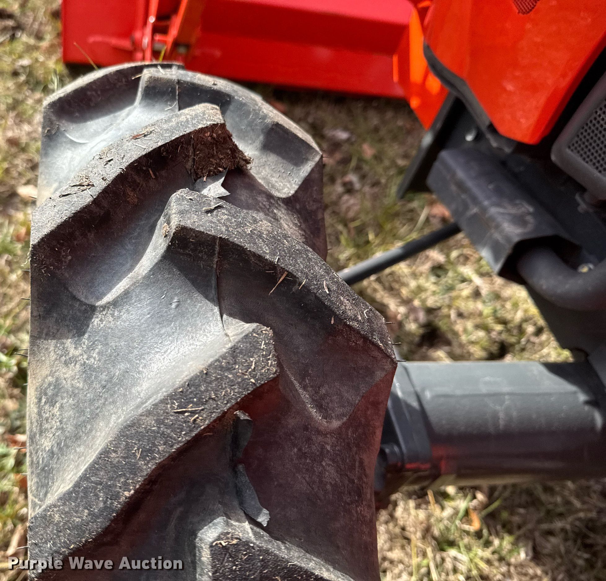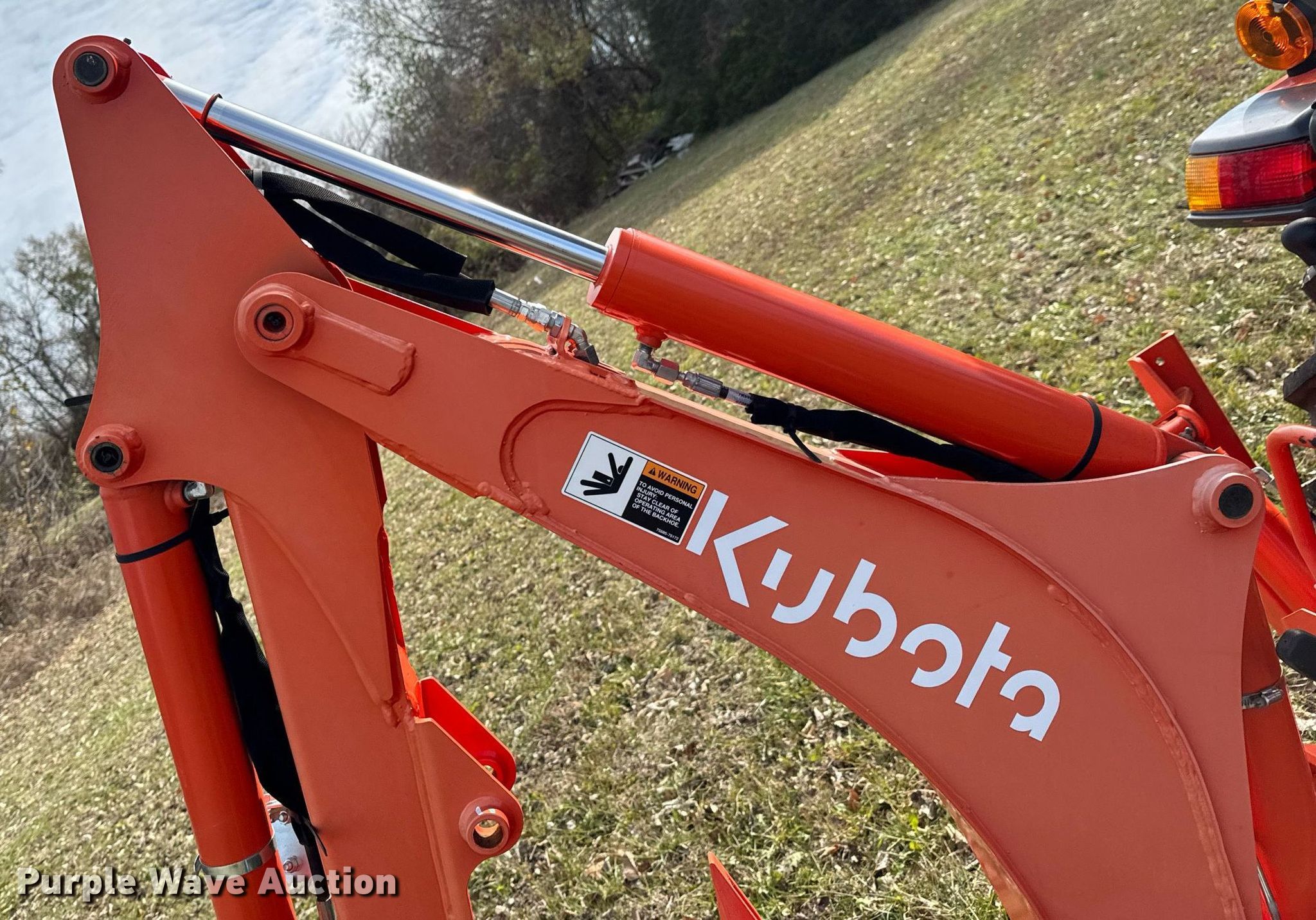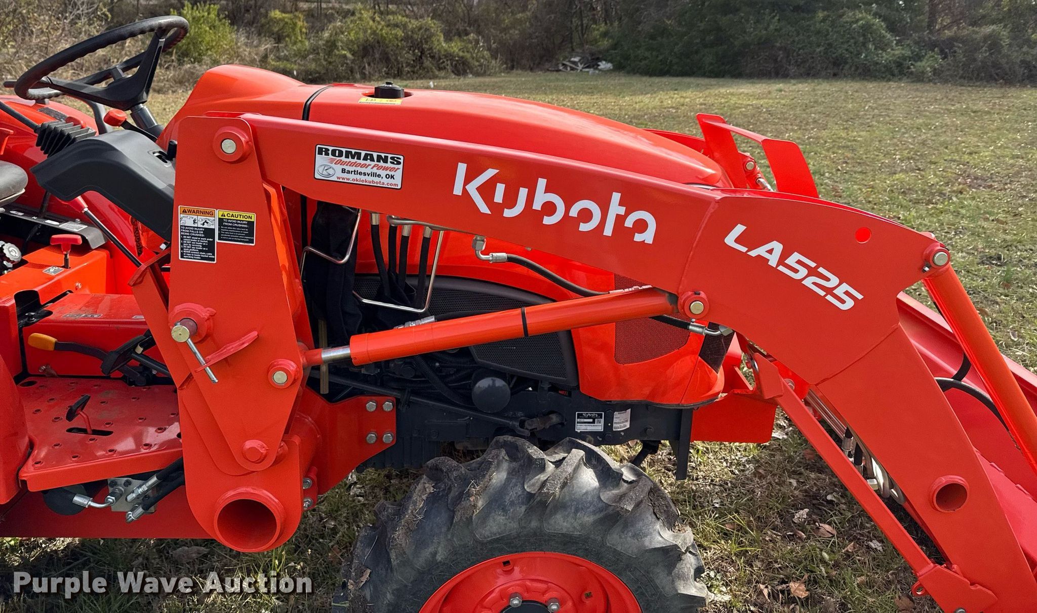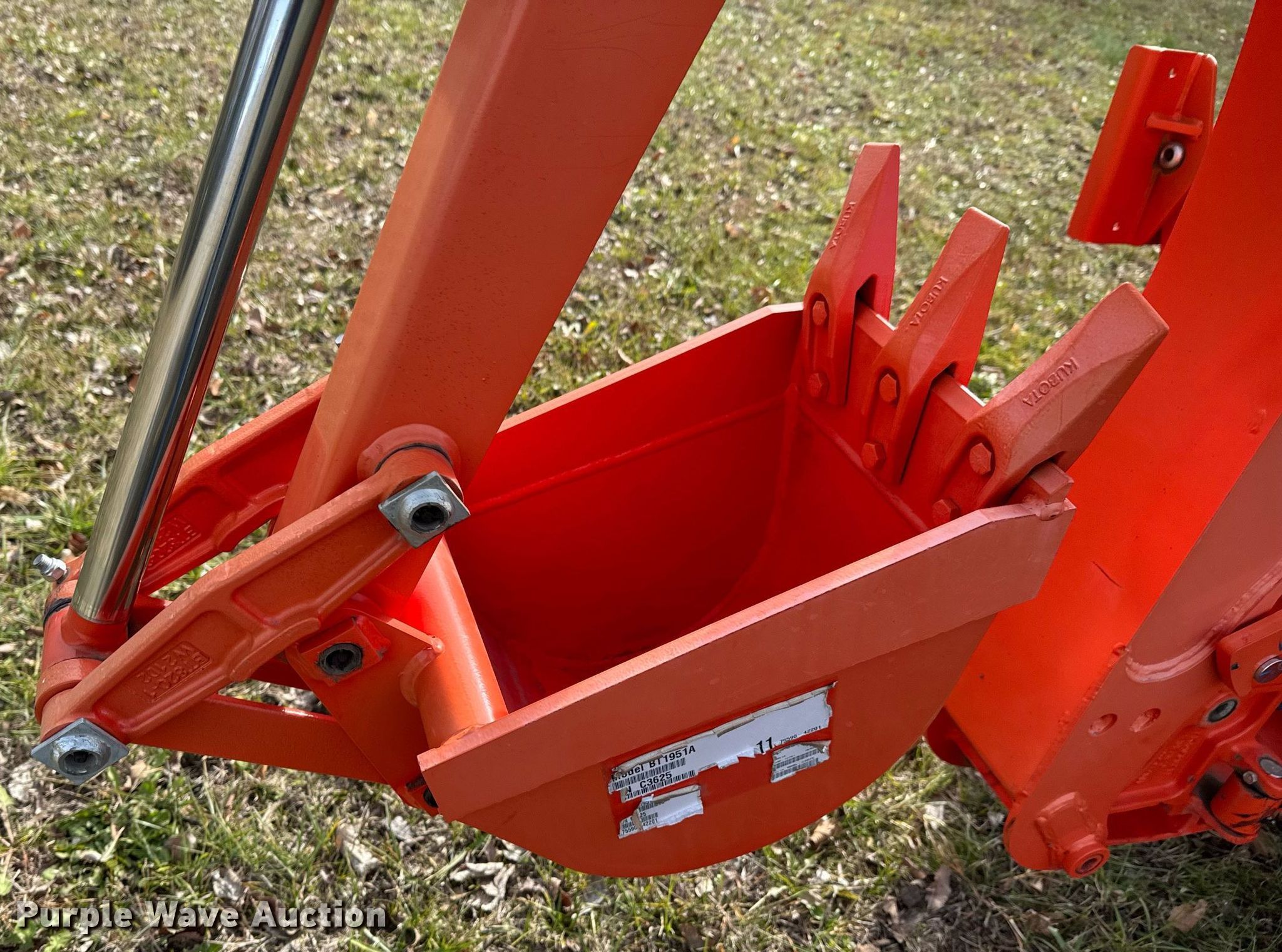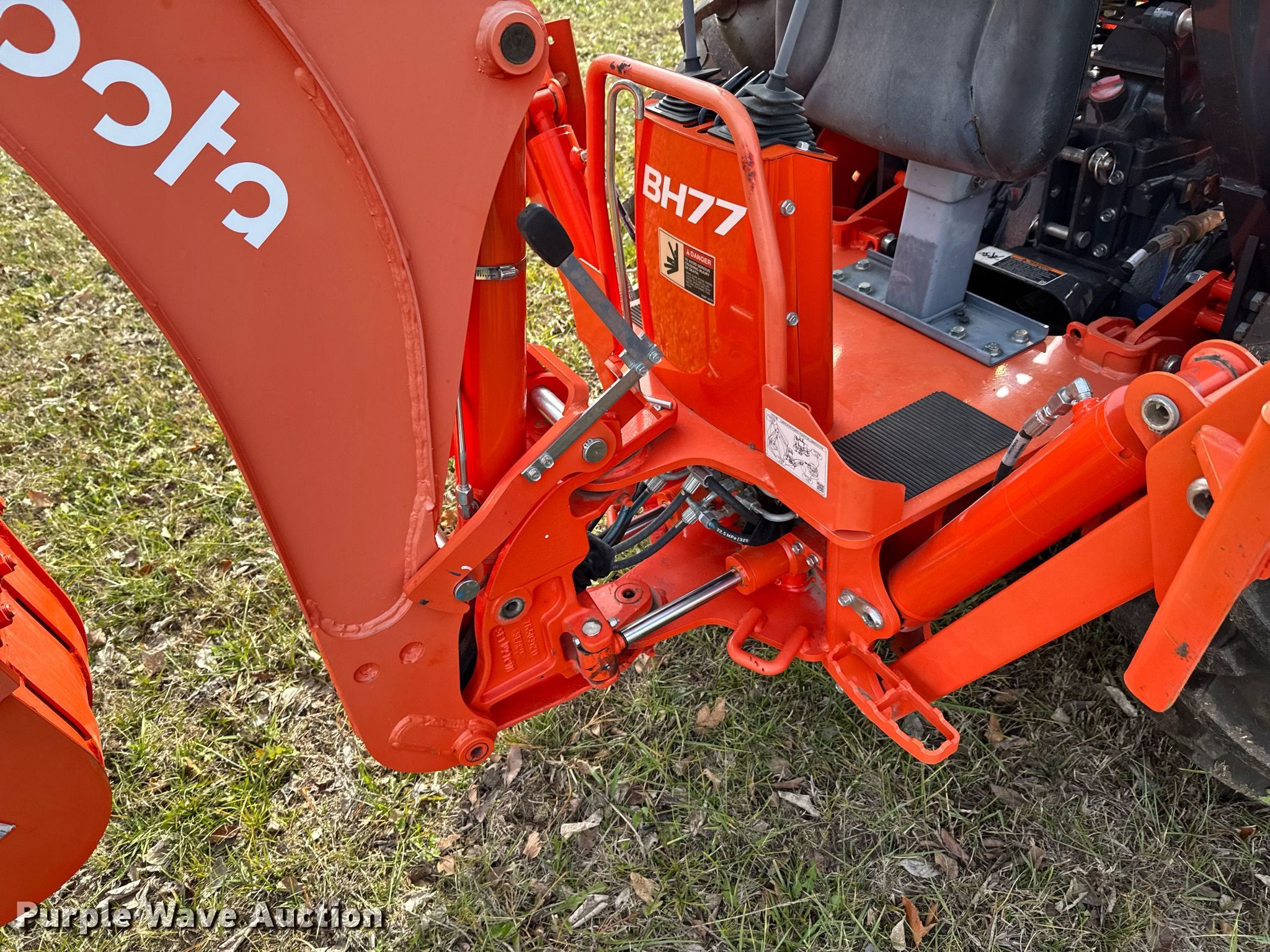 Kubota L3901D MFWD tractor. Hours: 24 on meter, Serial: KBUL4BDRPMJB94072. Engine Kubota, Cylinders: 3, Fuel type: Diesel. Transmission Synchro, 8F - 8R. Chassis Four wheel drive. Features Three point, Hydraulic remote sets Rear: 1, Loader Kubota LA525, Controls: Joystick, Bucket Width: 60", Cutting edge: Weld-on, Kubota BH77 backhoe attachment Backhoe controls: Wobble stick / two stick, Bucket Width: 12", Teeth: 3.. Tires Front: 7.2-16, Rear: 11.2-24. Romans Outdoor Power, Inc.. Independence, KS 67301