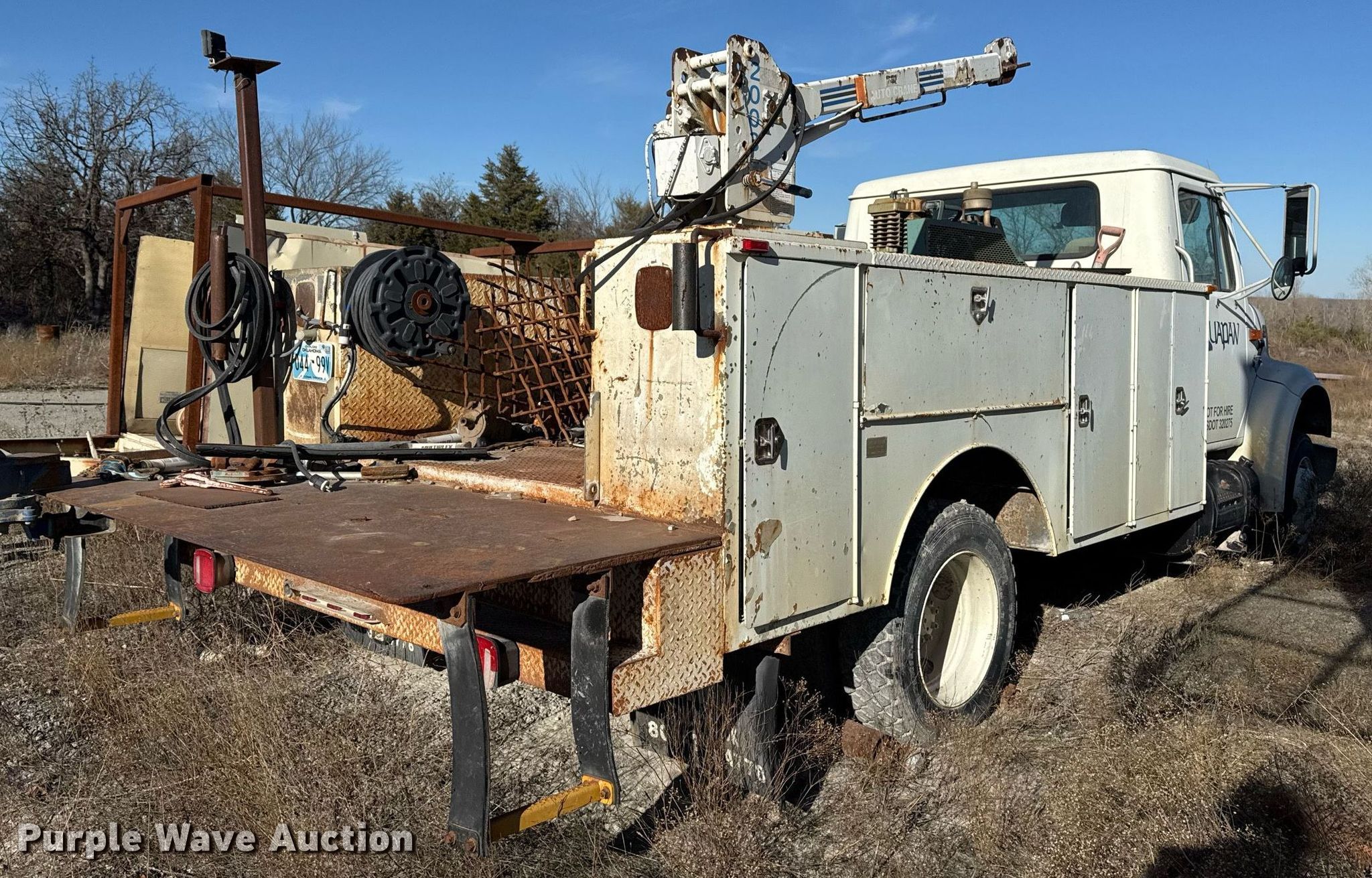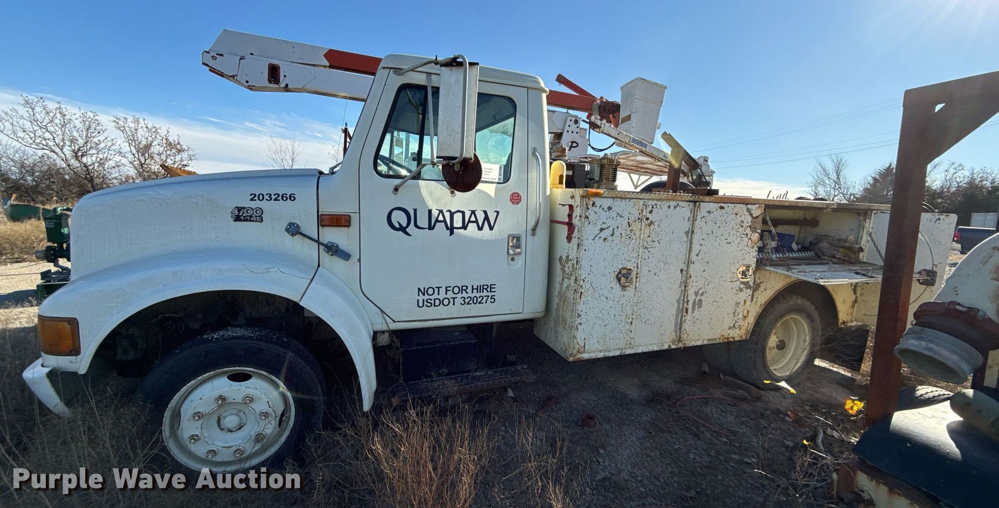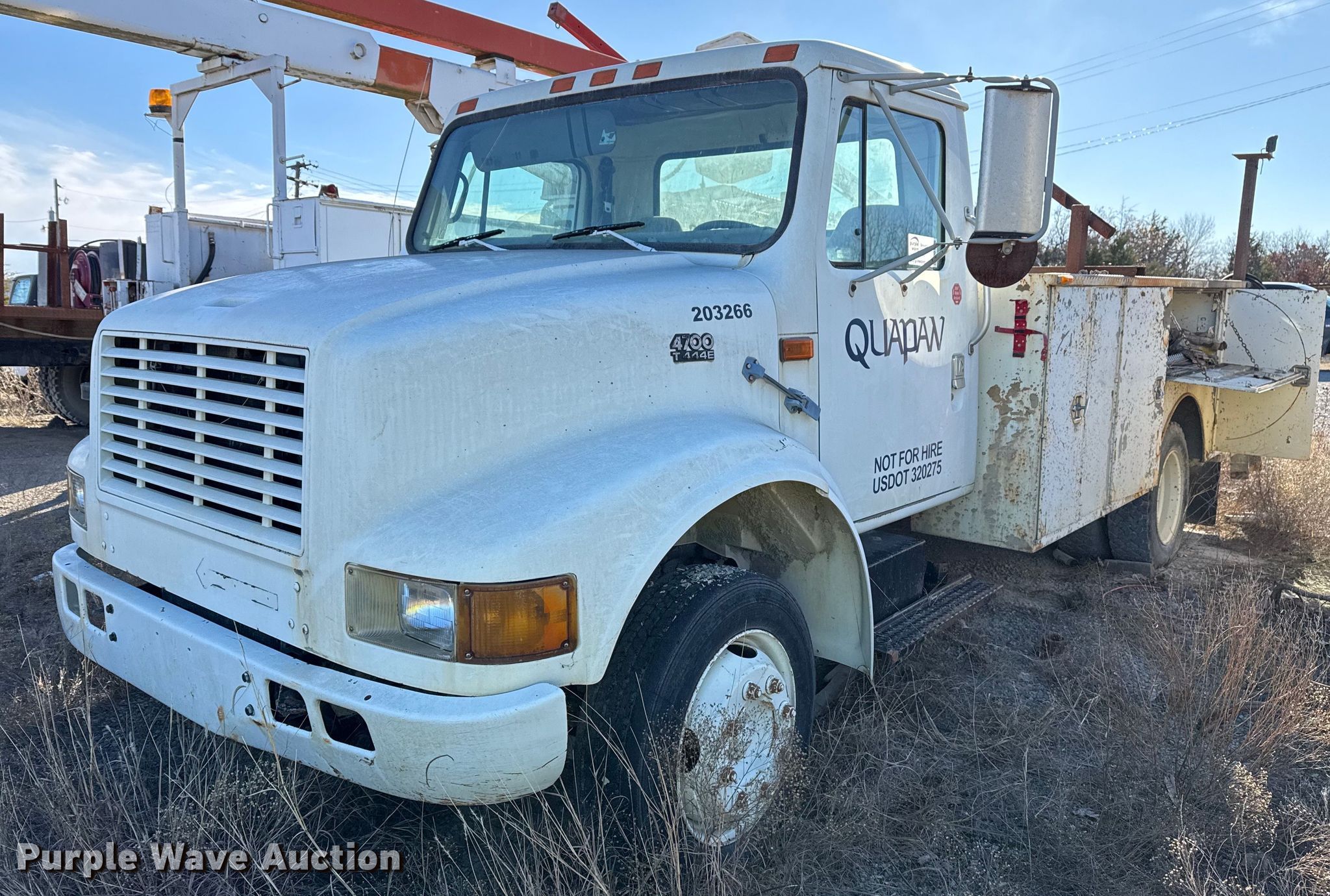 1998 International 4700 utility / service truck. Miles: 127,539 on odometer, Hours: 16,701 on meter, VIN: 1HTSLABK2WH492208, Unit #: 203226. Engine International T444E, Displacement: 7.3L, Cylinders: 6, Fuel type: Diesel. Transmission Automatic. Chassis Axles: Single, Suspension: Spring, Brakes: Hydraulic. Interior AC, Heat, Cruise control, Brake controller. Features Bed 11' L x 94" W, Air compressor Kohler, Crane Auto Crane 2003, Maximum boom length: 9' Maximum lift capacity: 2,000 lbs.. Tires Front: 225/70R19.5, Rear: 245/70R19.5. Notes Contents included, Non-operational air compressor, Non-operational crane, Non-operational unit. Oklahoma title. Title distribution may be delayed up to 30 days from verification of funds. Dolese Bros. Co.. 49066 Oklahoma 33. Drumright, OK 74030