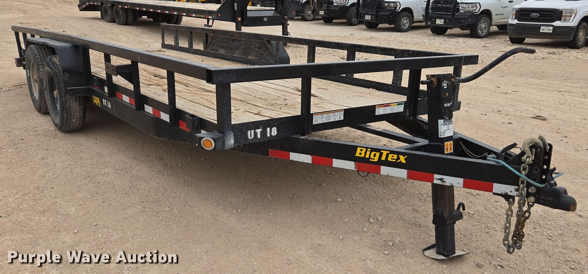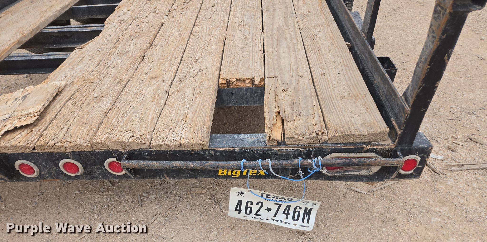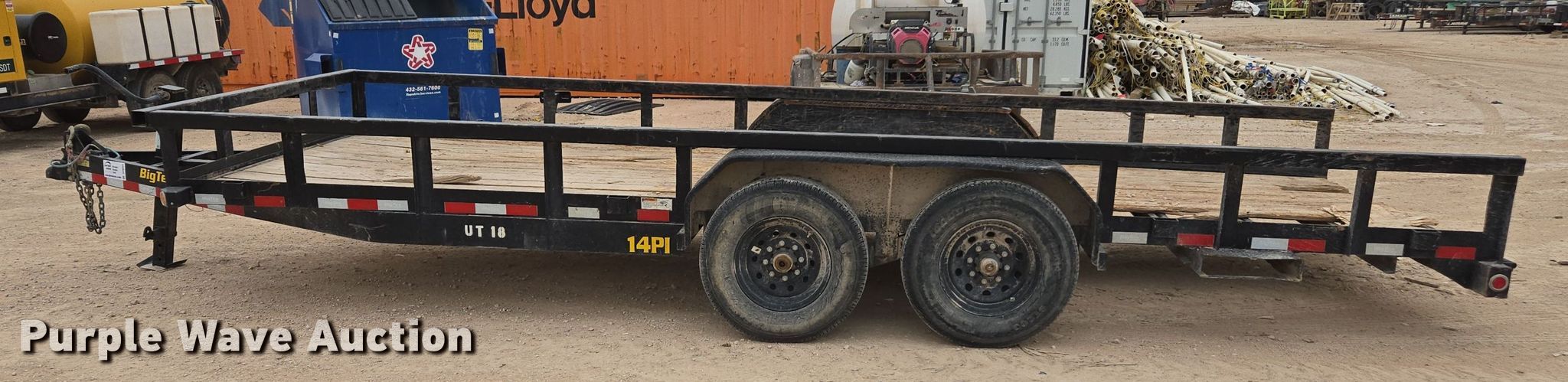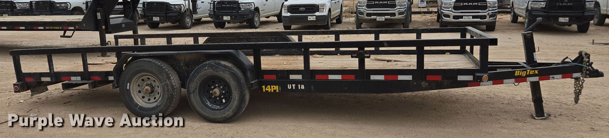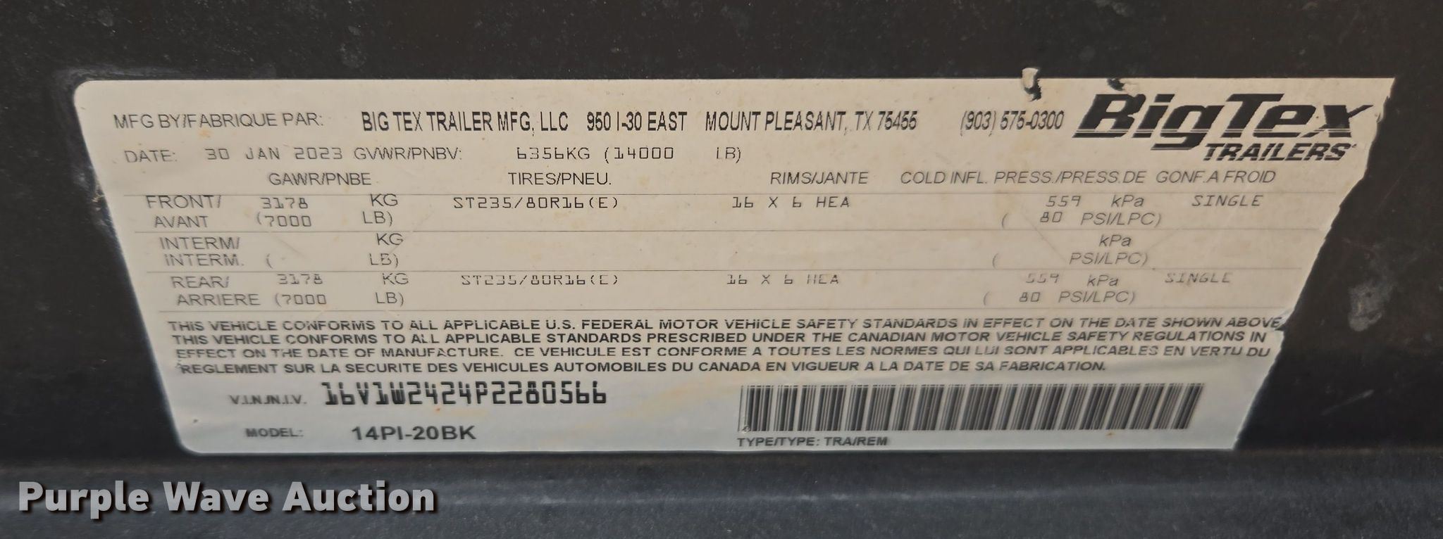 2023 Big Tex 14PI-20BK utility trailer. VIN: 16V1W2424P2280566. Dimensions Overall: 24' L x 102" W, Deck: 20' L x 84" W. Features Deck type: Wood. Chassis Ball hitch: 2 5/16", Landing gear: Single, Suspension: Spring, Brakes: Electric, Axles: Tandem, GVWR: 14,000 lbs. Tires Steel wheels, Size: 235/80R16. Notes Deck boards damaged. Texas title. Title has a lien that will be released following the close of the auction. Title distribution may be delayed up to 30 days from verification of funds. Flow Tx Energy West Texas Region. Midland, TX 79707