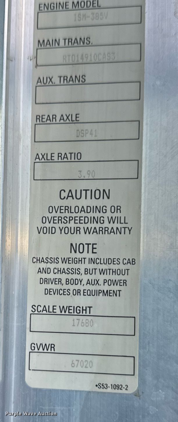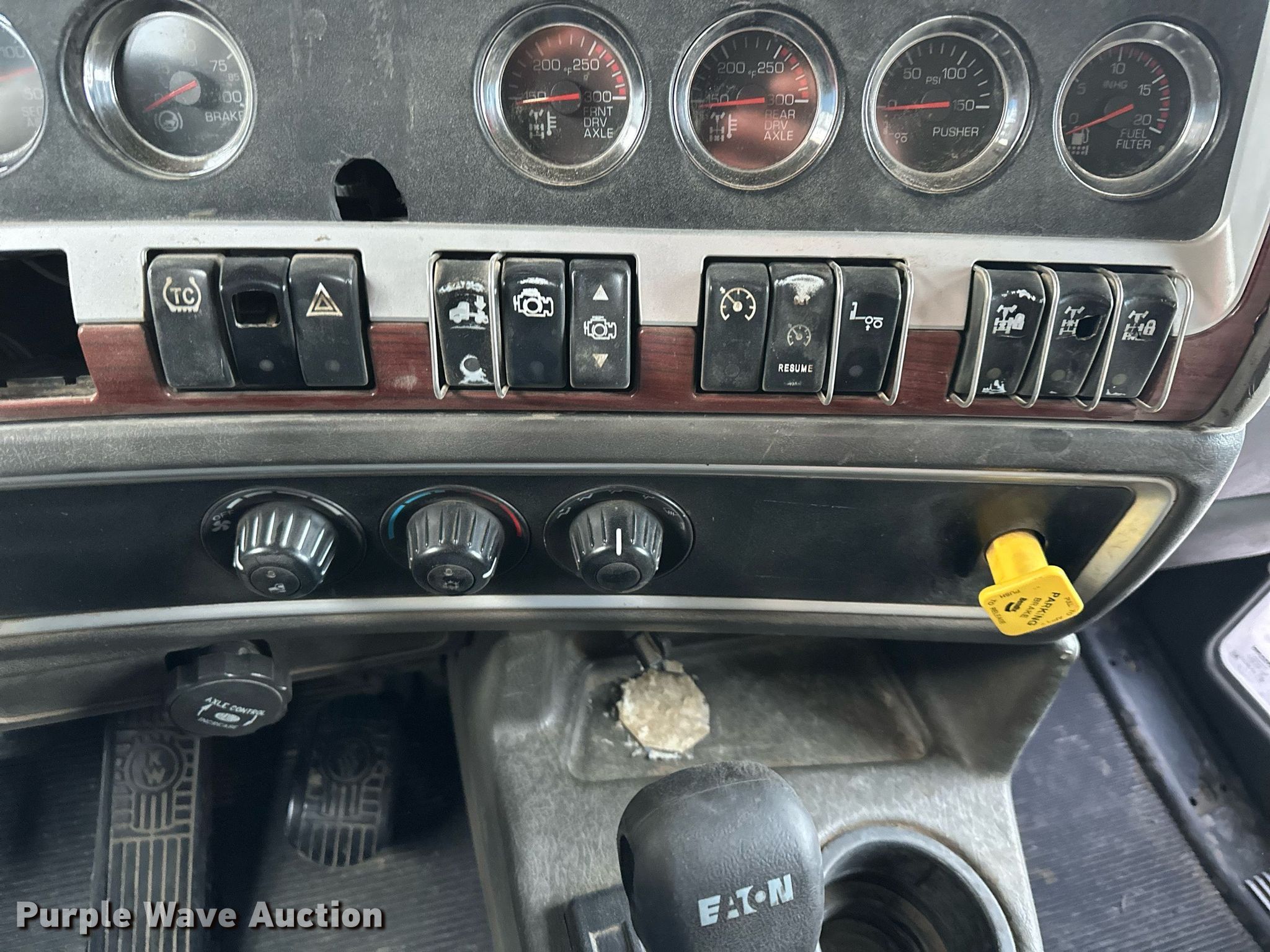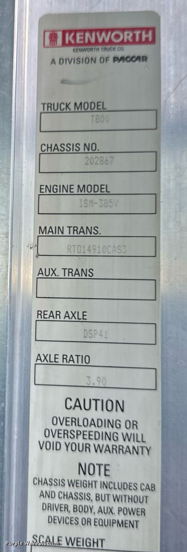 2007 Kenworth T800 dump truck. Miles: 391,195 on odometer, Hours: 18,401 on meter, VIN: 1NKDX00X27J202867. Engine Cummins ISM 385V, Displacement: 10.8L, Cylinders: 6, Fuel type: Diesel, Engine brake. Transmission Eaton Fuller, Automated manual. Chassis Axles: Triple, Pusher axle Steerable, Gear ratio: 3.90, Differential lock: Full, Suspension: Air Dump valves, Brakes: Air, PTO. Interior AC, Heat. Features Dump bed 18' L x 96" W, Side height: 48", Bed type: Steel, Barrel, Roll tarp, Ram: Single, End gate: Air operated. Tires Front: 425/65R22.5, Rear: 11R22.5, Lift axle: 255/70R22.5. Kansas title. Title distribution may be delayed up to 14 days from verification of funds. Concrete Unlimited. Topeka, KS 66607