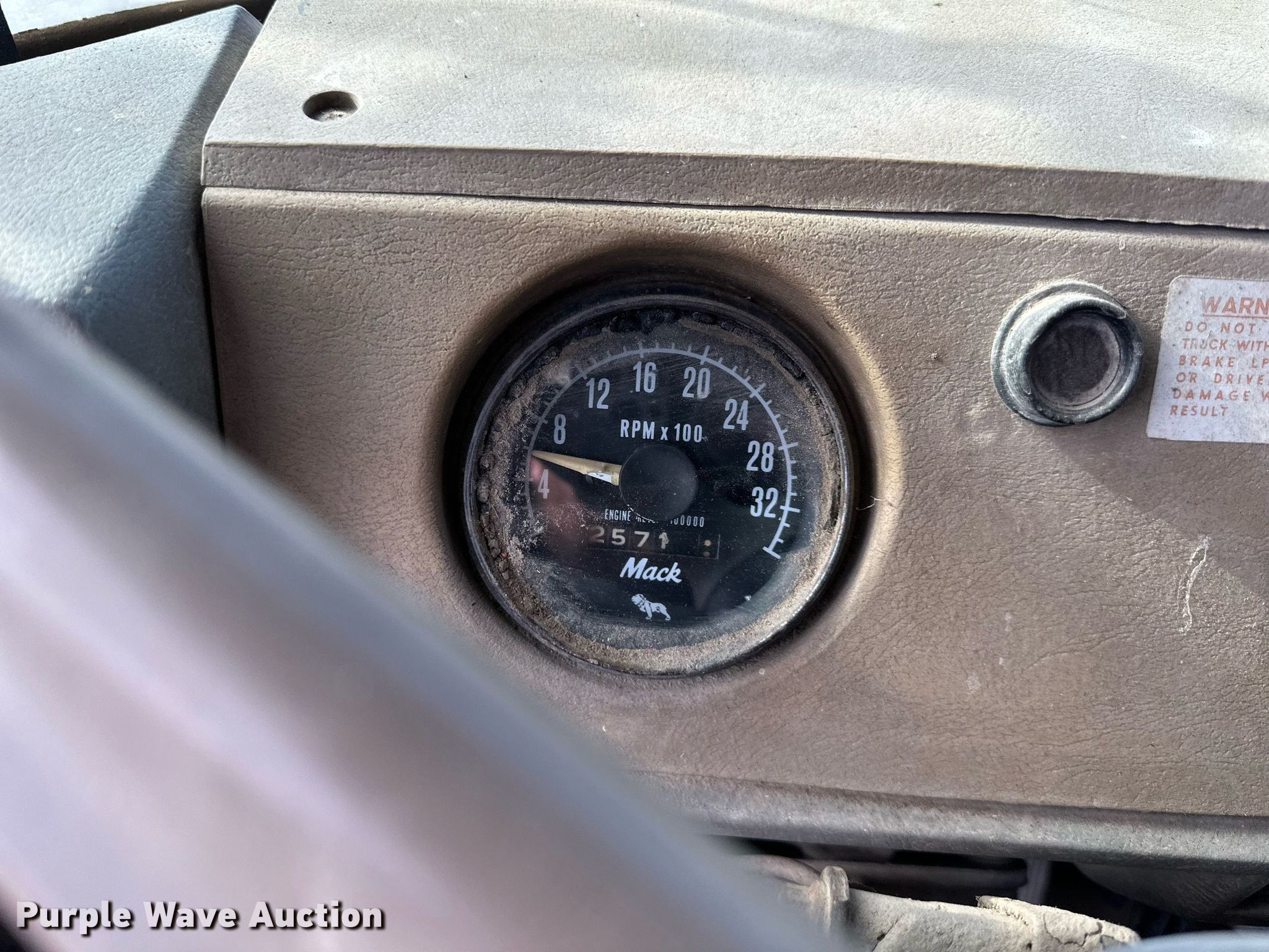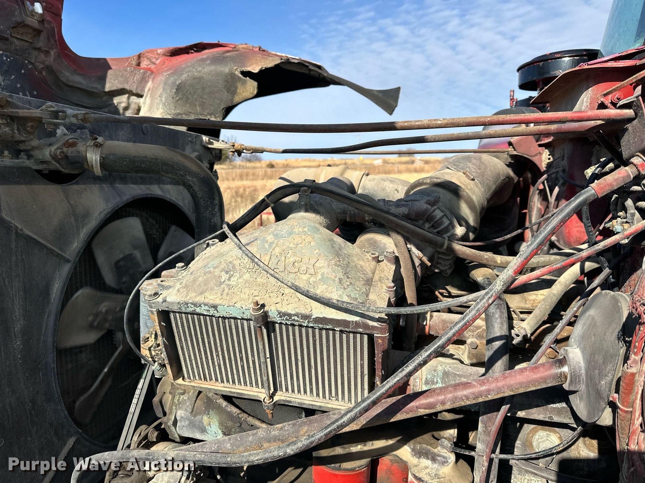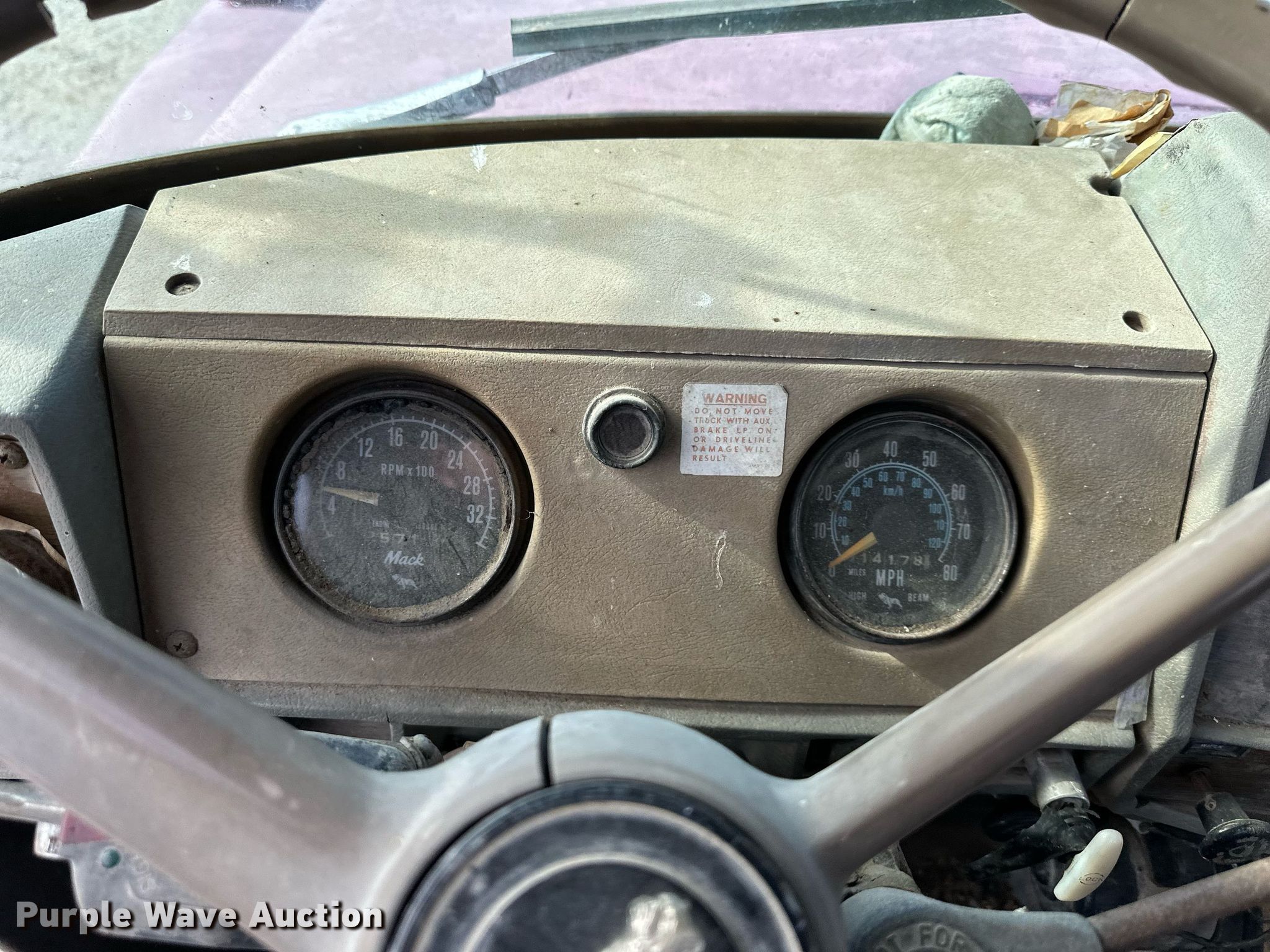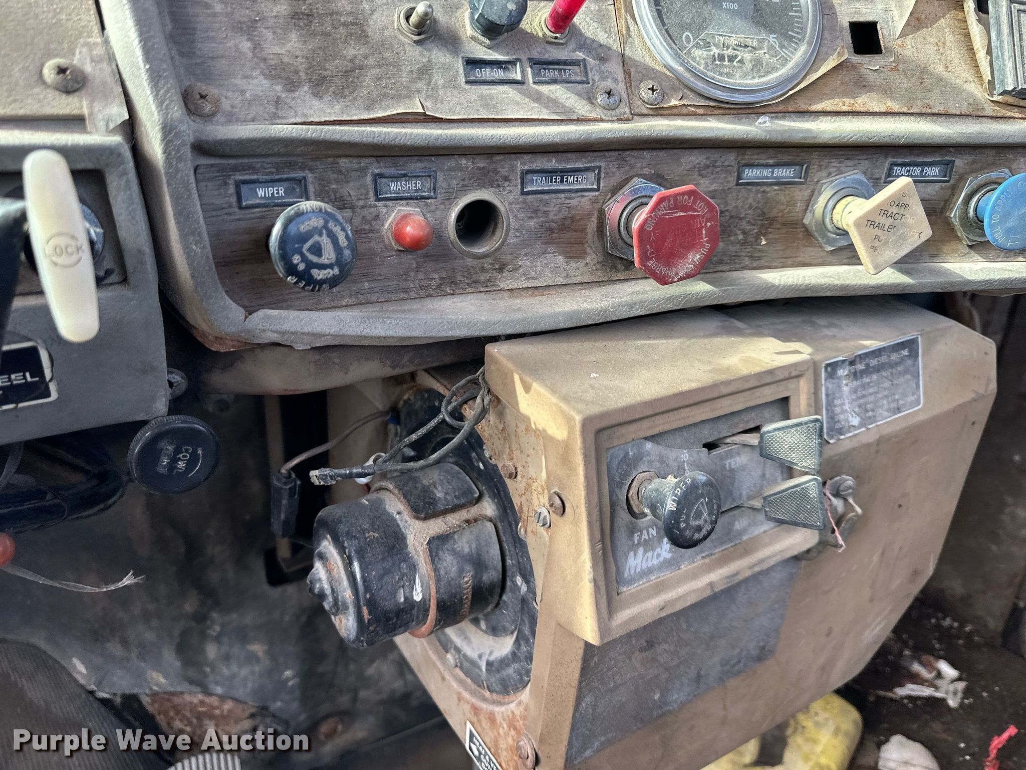 1978 Mack R686 semi truck. Miles: 814,178 on odometer, VIN: R686ST20138. Engine Mack, Cylinders: 6, Fuel type: Diesel. Transmission Mack, Manual. Chassis Axles: Tandem, Suspension: Camelback, Brakes: Air, PTO, Wet kit. Interior Heat. Features Fifth wheel type: Fixed, Fuel tank: Dual. Tires Size: 11R22.5. Notes Engine oil leak. Kansas antique title. Title distribution may be delayed up to 14 days from verification of funds. Onaga, KS 66521
