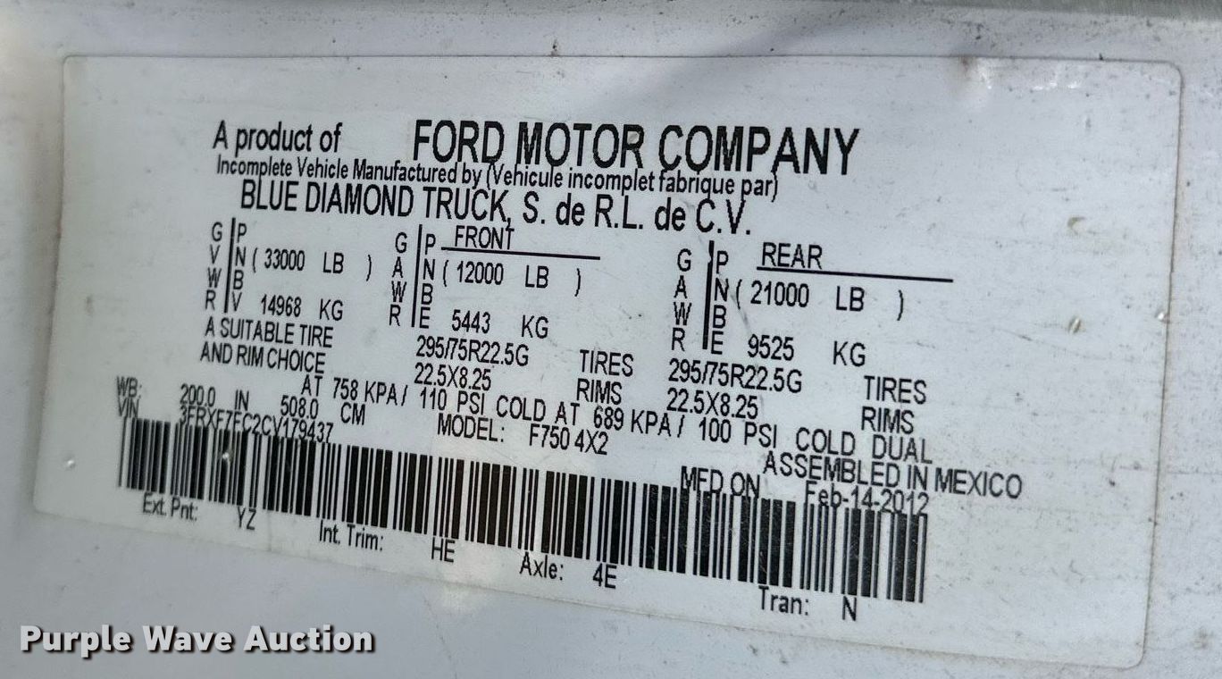 2012 Ford F750 Super Duty dump truck. Miles: Unknown, VIN: 3FRXF7FC2CV179437, Unit #: 300397. Engine Cummins, Displacement: 6.7L, Cylinders: 6, Fuel type: Diesel. Transmission Manual. Chassis Axles: Single, Suspension: Spring, Brakes: Air, PTO. Interior AC, Heat. Features Dump bed Magna, 14' L x 96" W, Side height: 14", Side board height: 6", Bed type: Steel, Roll tarp, Ram: Dual, End gate: Manual. Tires Size: 11R22.5. Notes Emissions issues, Possible collision damage, Dead battery, Non-operational unit. Titles will be distributed after confirmation of payment and removal. Kansas title. Mileage has not been verified. Odometer discrepancy will be marked on the title. Title distribution may be delayed up to 30 days from verification of funds. NPL Construction. Topeka, KS 66608
