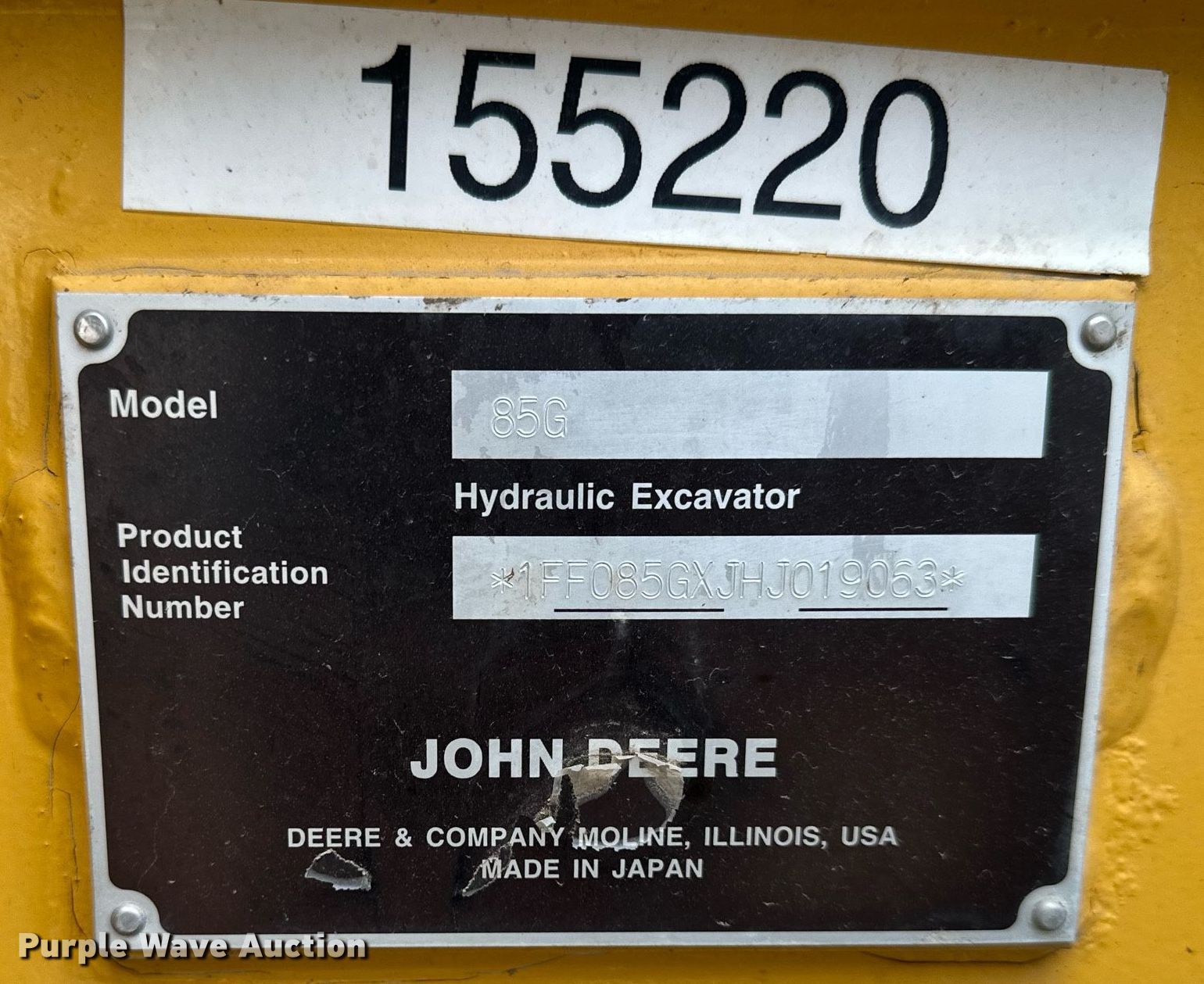 Purple Wave is selling a used Mini Excavator in Kansas. This item is a 2017 John Deere 85G excavator with the following: Hours: 1,867 on meter, Serial: 1FF085GXJHJ019063