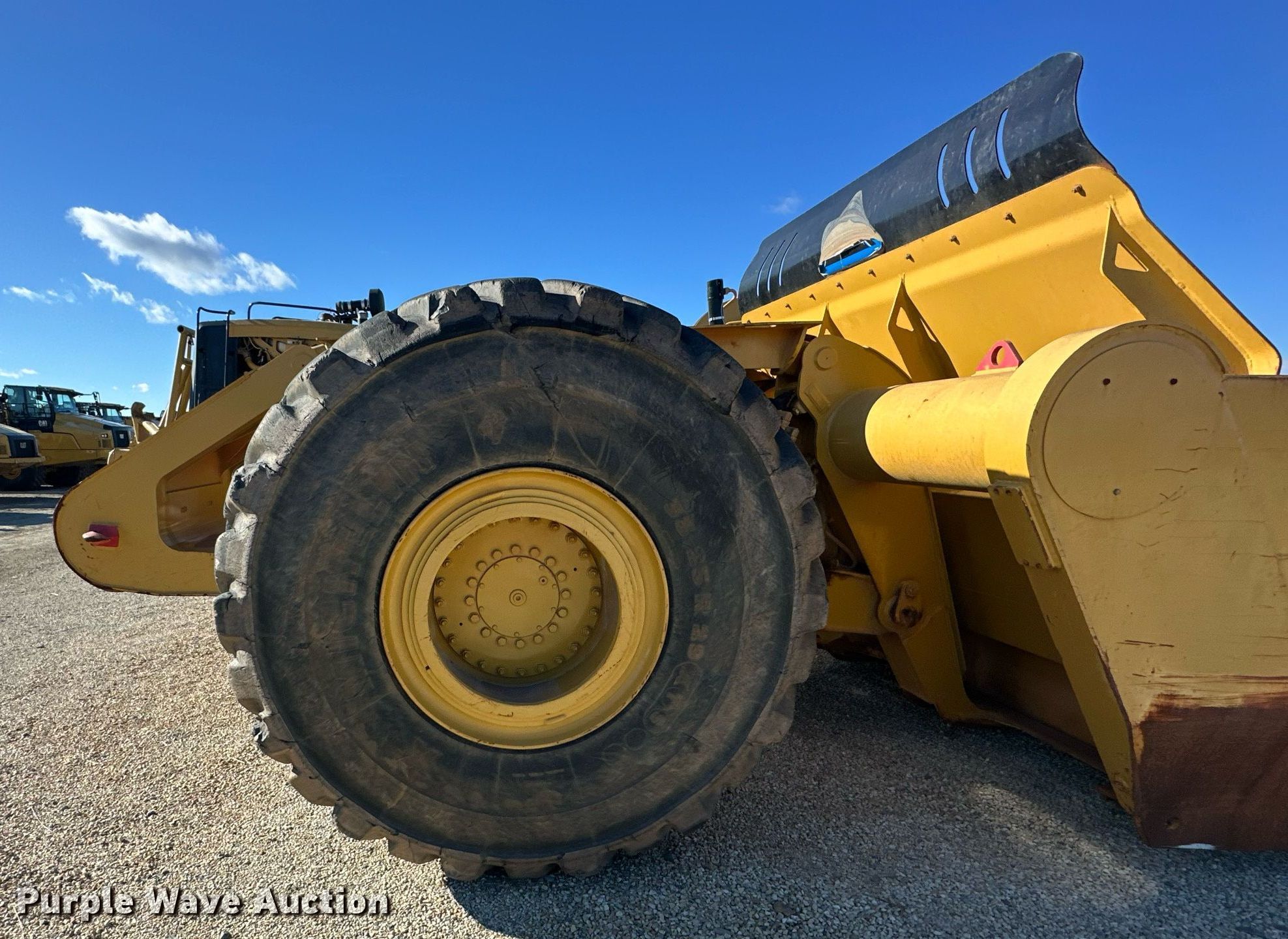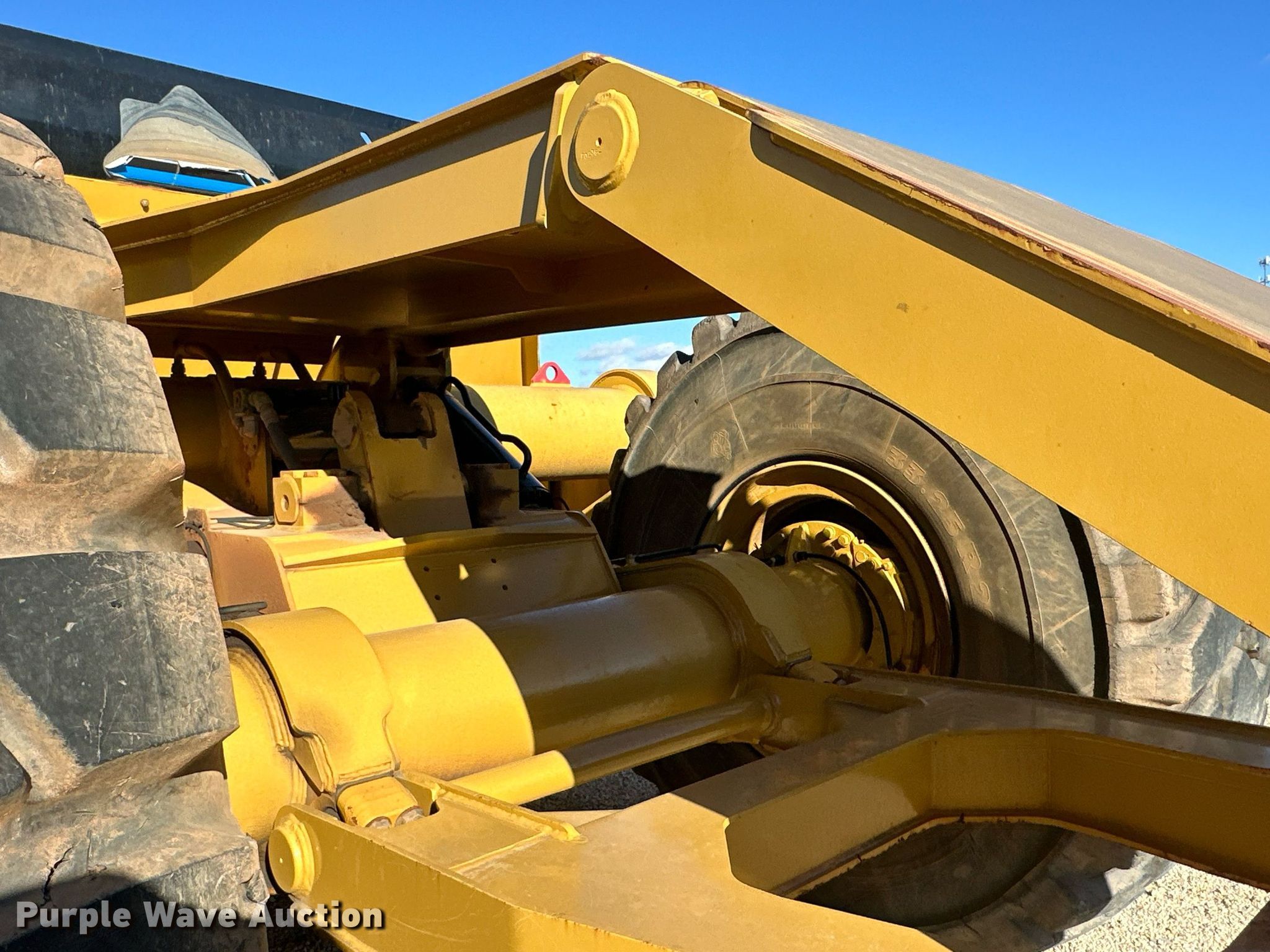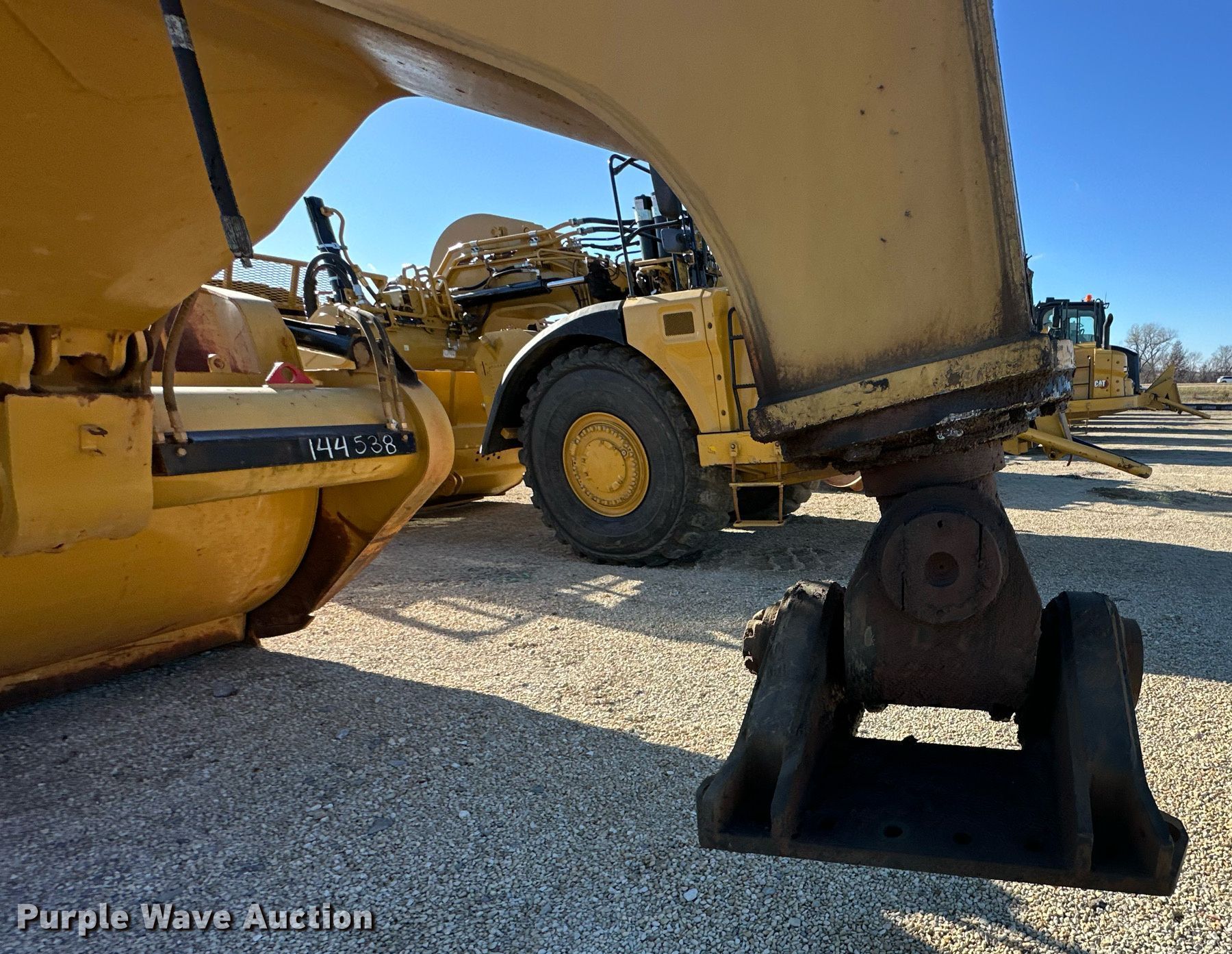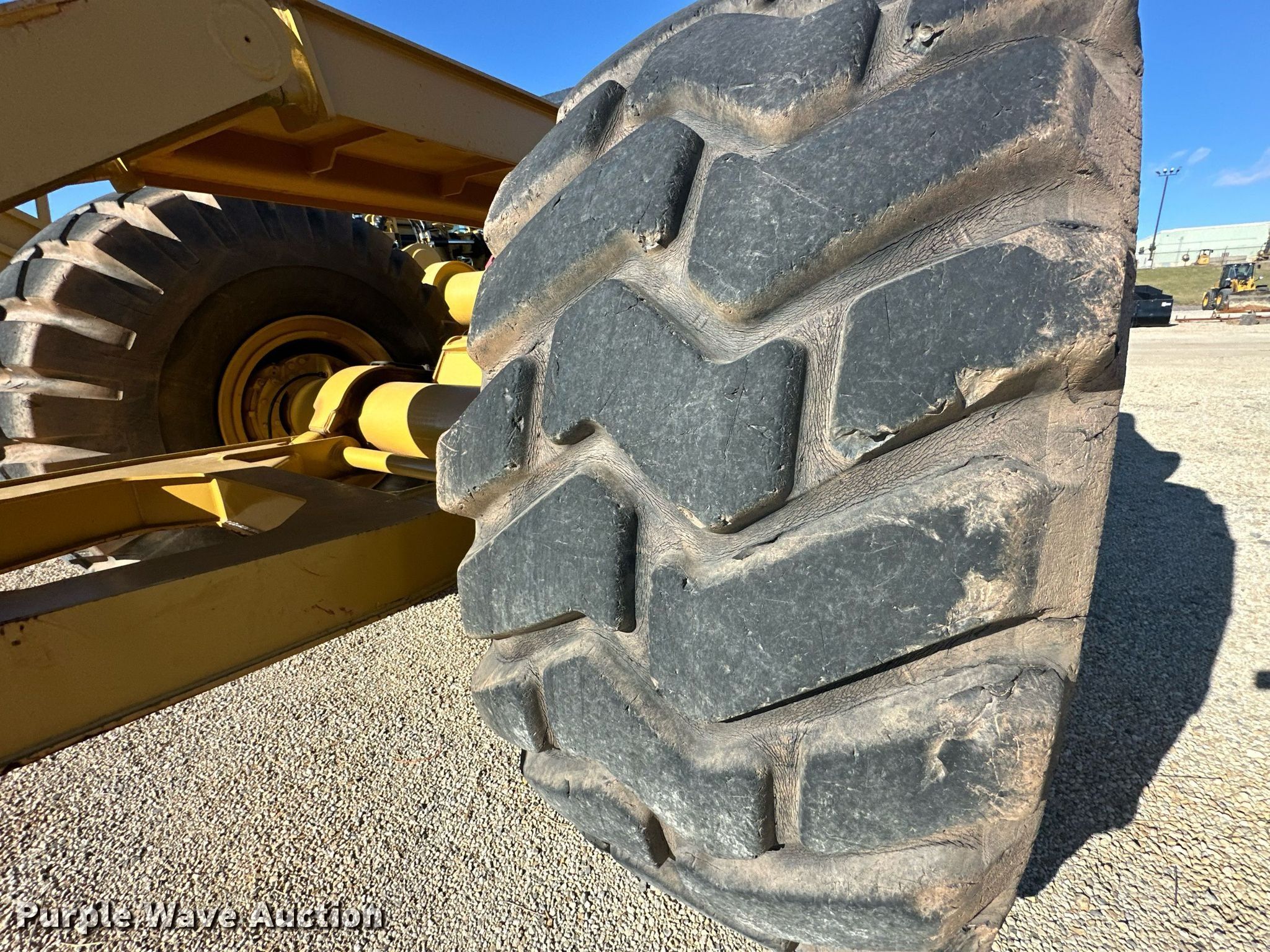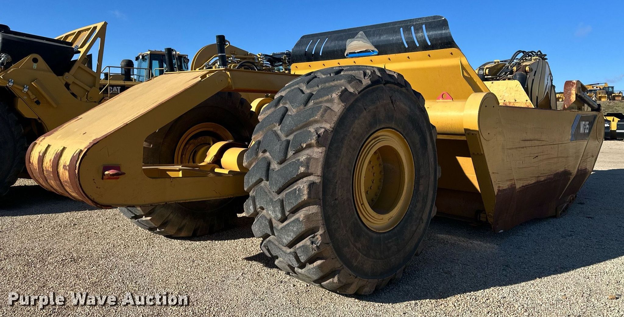 MTS MT-35 scraper. Serial: MT-35-2362-12. Chassis Brakes: Hydraulic. Features Bowl capacity: 35 cu.yd., Reversible cutting edge, Hydraulic lift, Rear push block. Tires Size: 33.25-29. Miller Springs Farm. Topeka, KS 66609