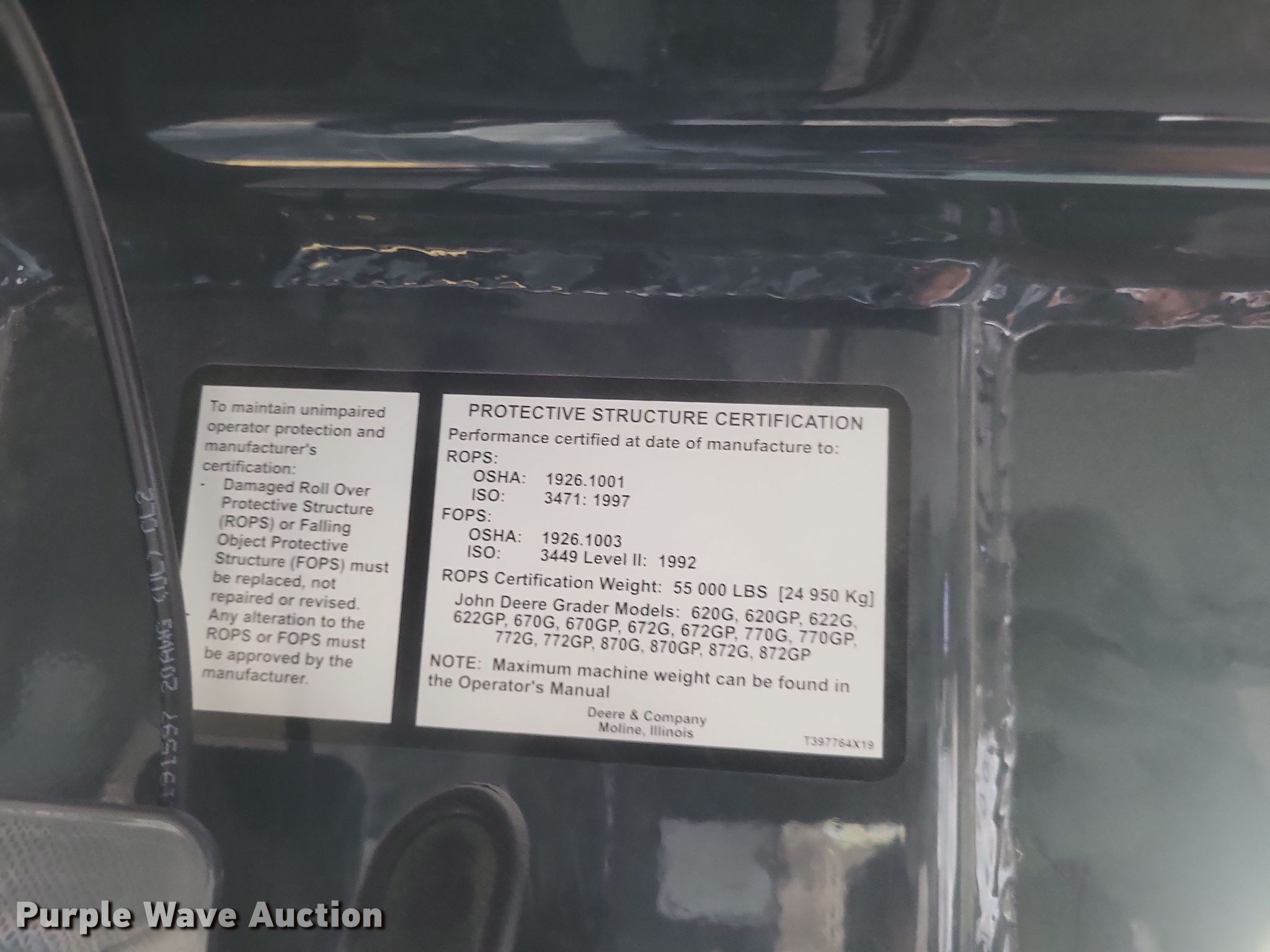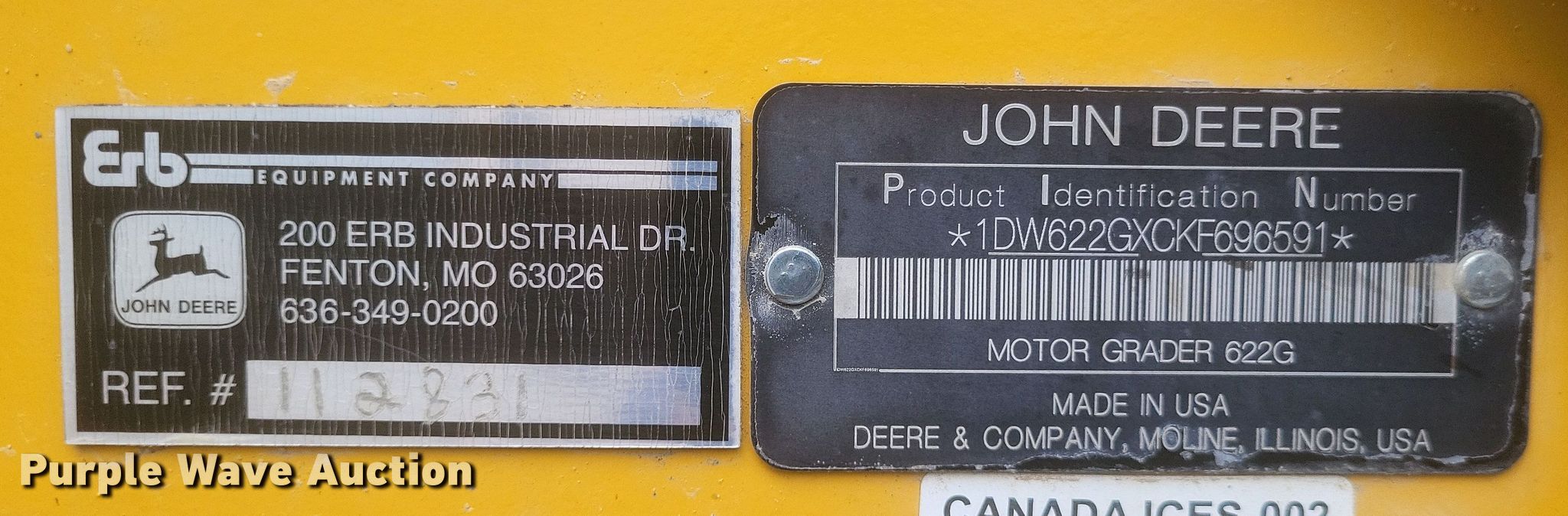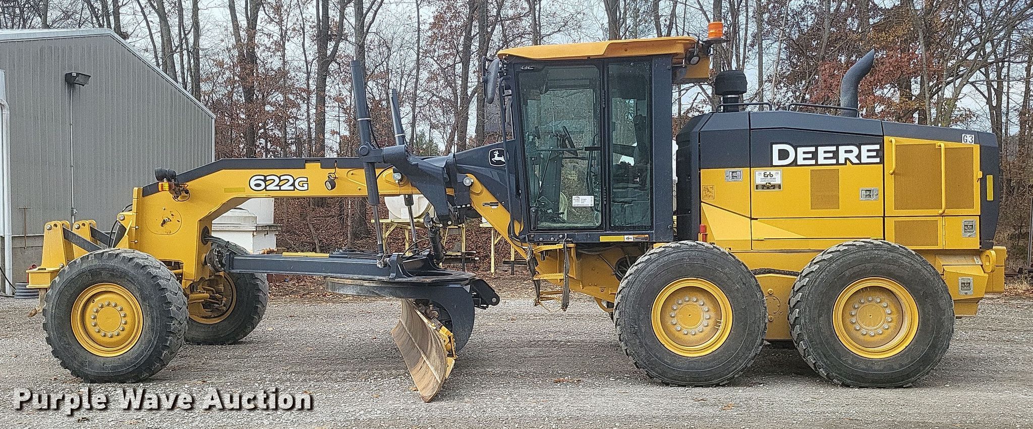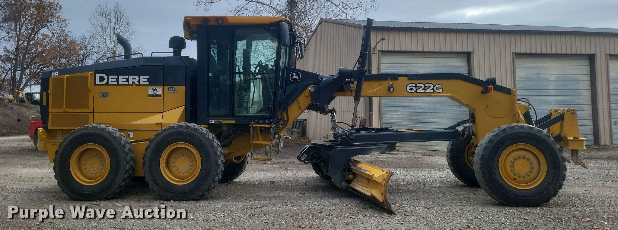 Purple Wave is selling a used Motor Grader in Missouri. This item is a 2019 John Deere 622G motor grader with the following: Hours: 2,435 on meter, Serial: 696591
