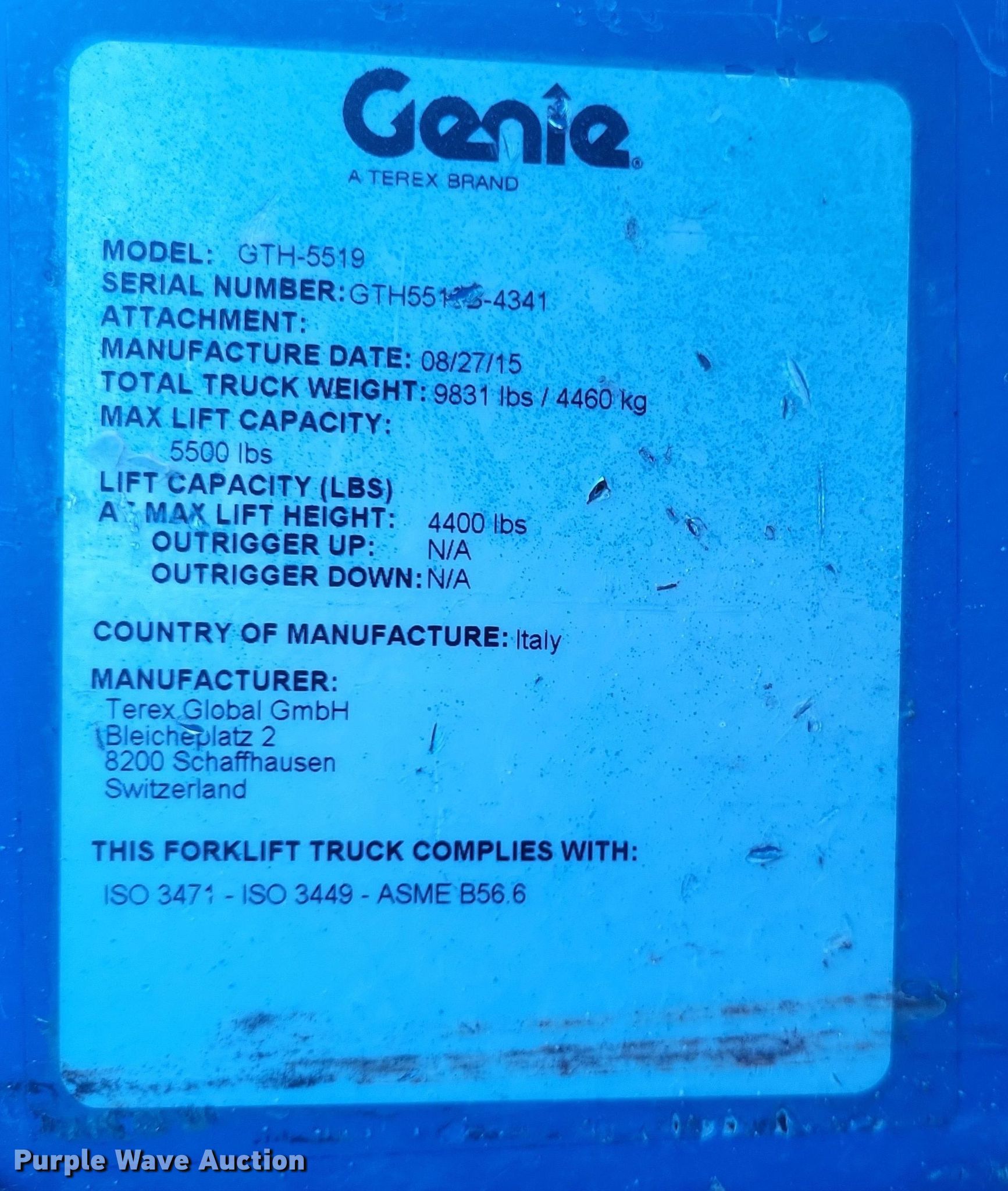 2015 Genie GTH-5519 telehandler. Hours: 1,114 on meter. Engine Deutz TD 2.9 L4, Displacement: 2.925L, Cylinders: 4, Fuel type: Diesel, HP: 74, kW: 55.4. Transmission Shuttle shift, 1F - 1R, Four wheel drive. Operators station OROPS, Canopy, Steering: Crab, Four wheel. Features Maximum lift capacity: 5,500 lbs, Maximum lift height: 19', Boom stages: 2, Fork length: 48", Quick attach: Manual. Tires Size: 33x12-20, Solid. Notes Engine was replaced with 688.3 hours on meter. View repairs. Mike Rentals. Sikeston, MO 63801