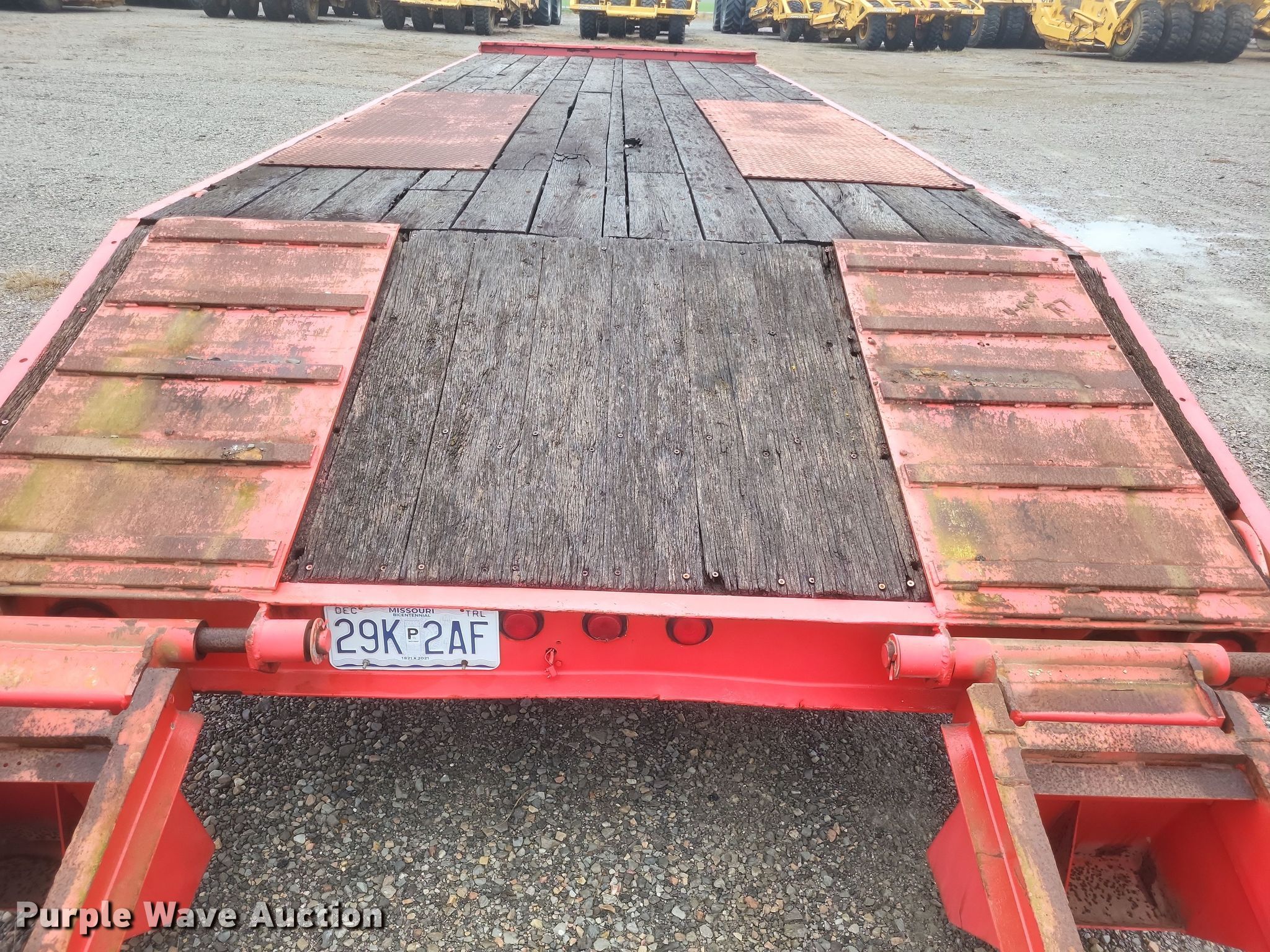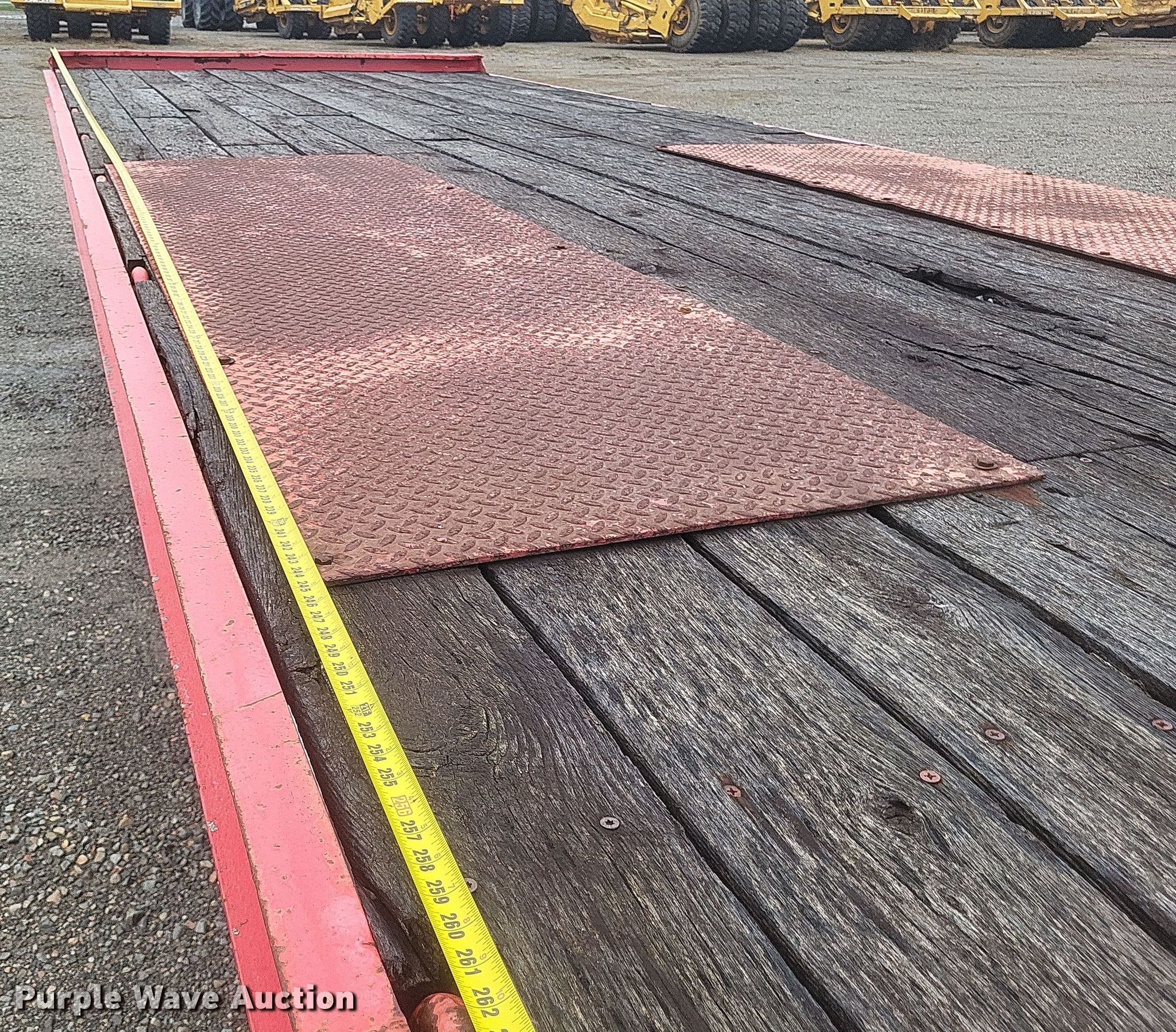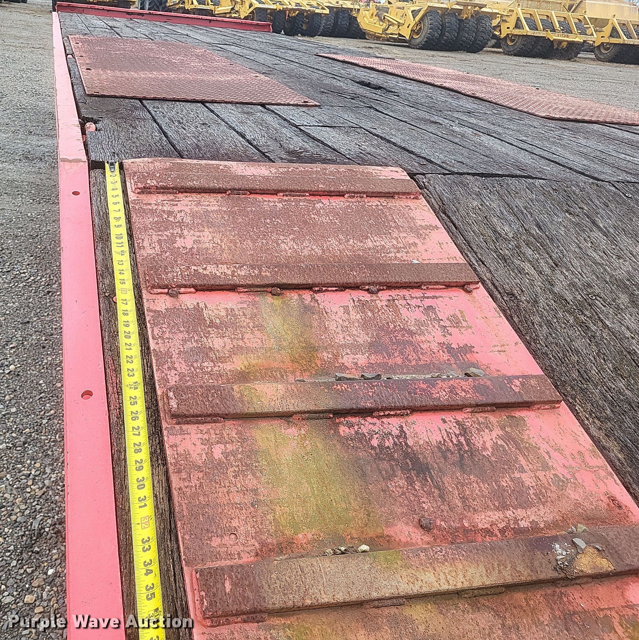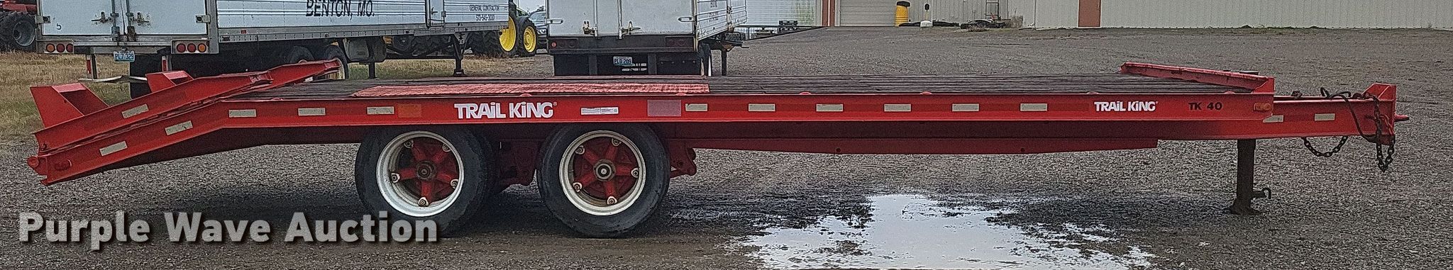 1987 Trail King TK40 equipment trailer. VIN: 1TKC02725HM108076. Dimensions Overall: 33' L x 102" W, Deck: 23' L x 102" W, Deck height: 40", Tail length: 4', Ramps: Manual Length: 5'. Features Deck type: Wood. Chassis Hitch: Pintle, Landing gear: Single, Suspension: Spring, Brakes: Air, Axles: Tandem. Tires Steel wheels, Size: 255/70R22.5. Missouri title. Title distribution may be delayed up to 30 days from verification of funds. Dumey Contracting Inc.. Benton, MO 63736