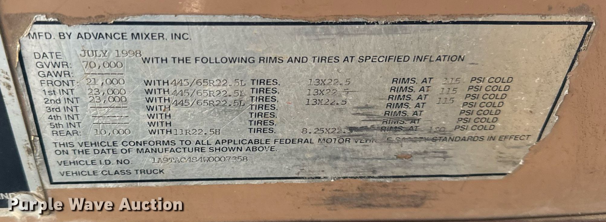 1998 Advance C10335AT6810 ready mix truck. Miles: 54,861 on odometer, Hours: 11,968 on meter, VIN: 1A9TAC4S4W0007358, Unit #: 24. Engine Caterpillar C10, Displacement: 10.3L, Cylinders: 6, Fuel type: Diesel. Transmission Automatic. Chassis Axles: Tandem, Tag axle, Differential lock: Inter-axle, Suspension: Spring over walking beam, Brakes: Air, PTO, GVWR: 70,000 lbs FAWR: 21,000 lbs, IAWR: 23,000 lbs, RAWR: 23,000 lbs. Interior Heat. Features Mixer McNeilus, Capacity: 10 cu.yd., Discharge: Front, In-cab controls, Water tank capacity: 120 gallons, Chute Extensions: 3, Chute type: Steel, Front mount drum controls. Tires Size: 445/65R22.5, Tag axle size: 11R22.5. Illinois title. Title distribution may be delayed up to 14 days from verification of funds. Fischer Bros Fresh Concrete. Ingleside, IL 60041