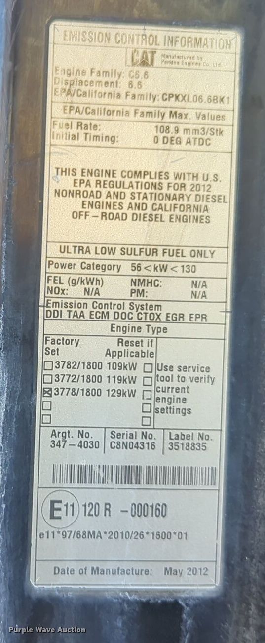 2012 Caterpillar 938K wheel loader. Hours: 11,653 on meter, Serial: CAT0938KESWL00676, Unit #: 206259. Engine Caterpillar C6.6, Serial: C8N04316, Displacement: 6.6L, Cylinders: 6, Fuel type: Diesel. Transmission Powershift, 4F - 4R. Operators station AC, Heat, Bucket controls: Joystick. Features Bucket Caterpillar, Width: 108", Cutting edge: Bolt-on. Tires Size: 20.5R25. Dolese Bros Co. 5600 West Reno Avenue. Oklahoma City, OK 73127