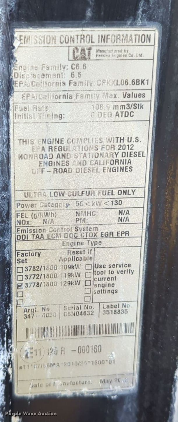 2012 Caterpillar 938K wheel loader. Hours: 19,882 on meter, Serial: 8938KPSWL00679, Unit #: 206260. Engine Caterpillar C6.6, Serial: C8N04632, Displacement: 6.6L, Cylinders: 6, Fuel type: Diesel. Transmission Powershift, 4F - 3R. Operators station Enclosed cab, AC, Heat, Bucket controls: Joystick. Features Counter weights, Bucket Caterpillar, Width: 108", Self- leveling bucket, Cutting edge: Bolt-on. Tires Size: 20.5R25. Dolese Bros Co. 5600 West Reno Avenue. Oklahoma City, OK 73127