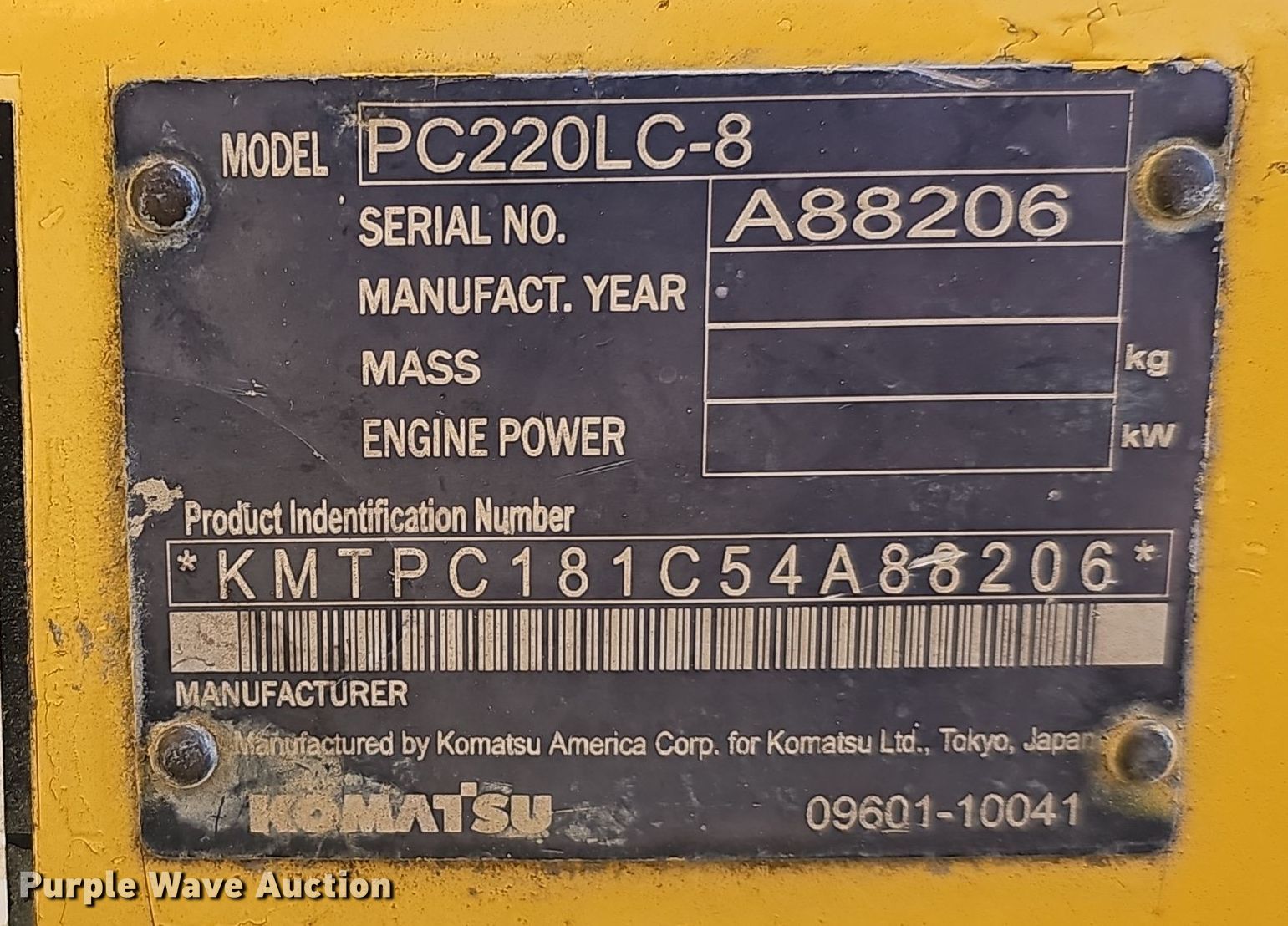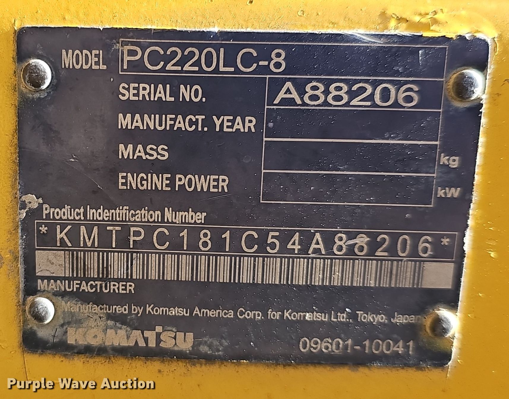 Purple Wave is selling a used Hydraulic Excavator in Kansas. This item is a 2007 Komatsu PC220LC-8 excavator with the following: Hours: 8,373 on meter, Serial: KMTPC181C54A88206