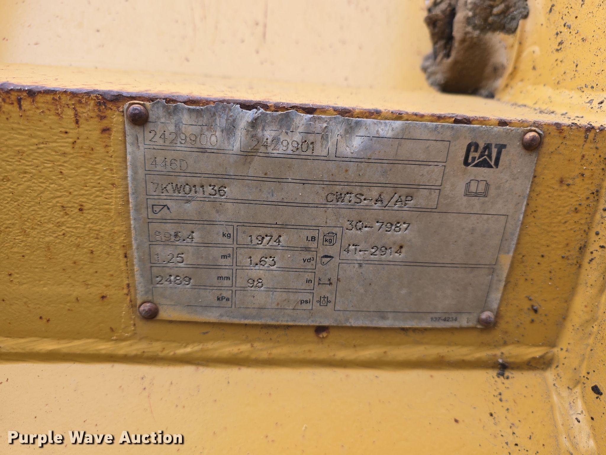 2004 Caterpillar 446D backhoe. Hours: 2,964 on meter, Serial: CAT0446DCDBL00284. Engine Caterpillar 3114, Serial: 2FG08166, Cylinders: 4, Fuel type: Diesel, HP: 102, kW: 76. Transmission Powershift, 4F - 3R. Chassis Four wheel drive, Differential lock. Operators station Enclosed cab, AC, Heat, Backhoe controls: Pilot control. Features Loader Bucket Caterpillar, Bucket leveler, Four-in-one, Capacity: 1.63 cu.yd., Width: 96", Cutting edge: Bolt-on, Backhoe Extendable stick, Auxiliary hydraulics, Bucket Width: 36", Teeth: 5.. Tires Front: 15-19.5NHS, Rear: 21L-24. Wahlert Soil Conservation. Audubon, IA 50025