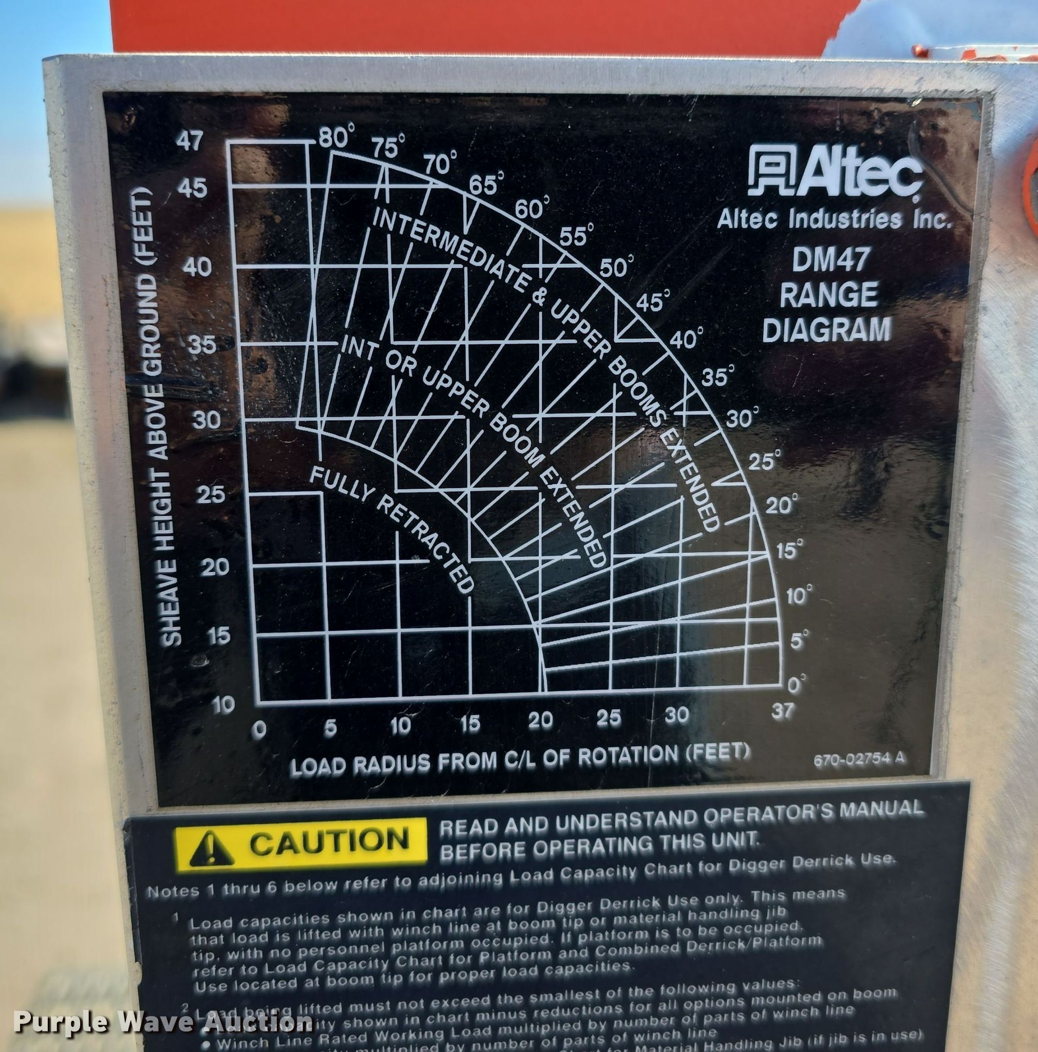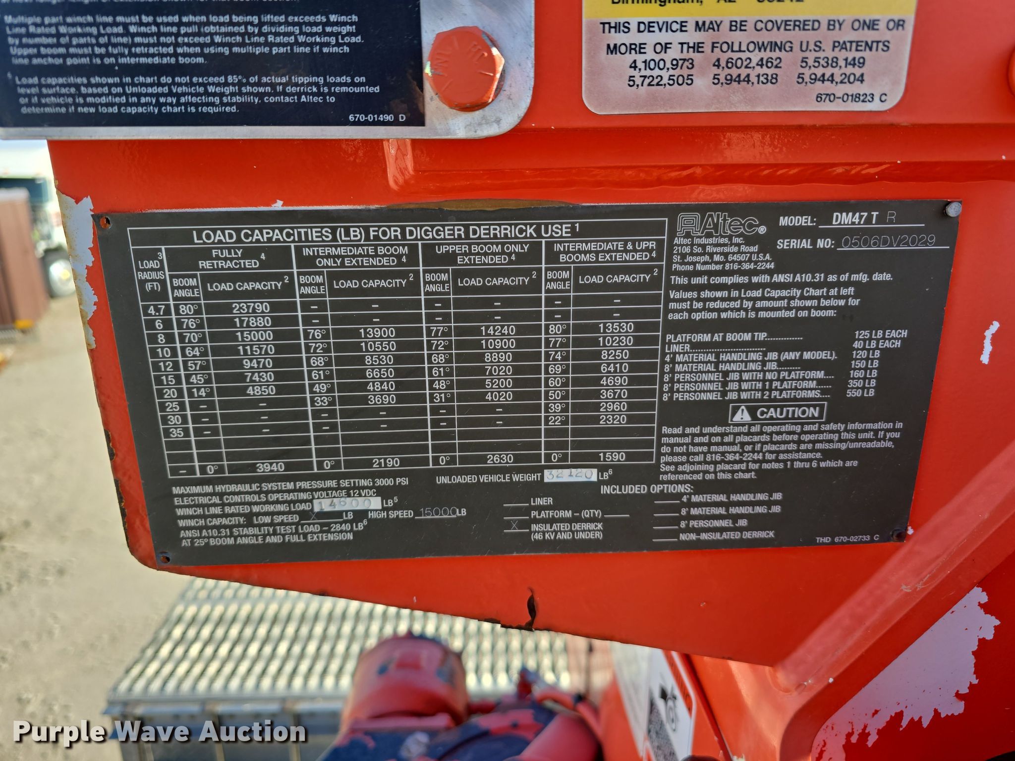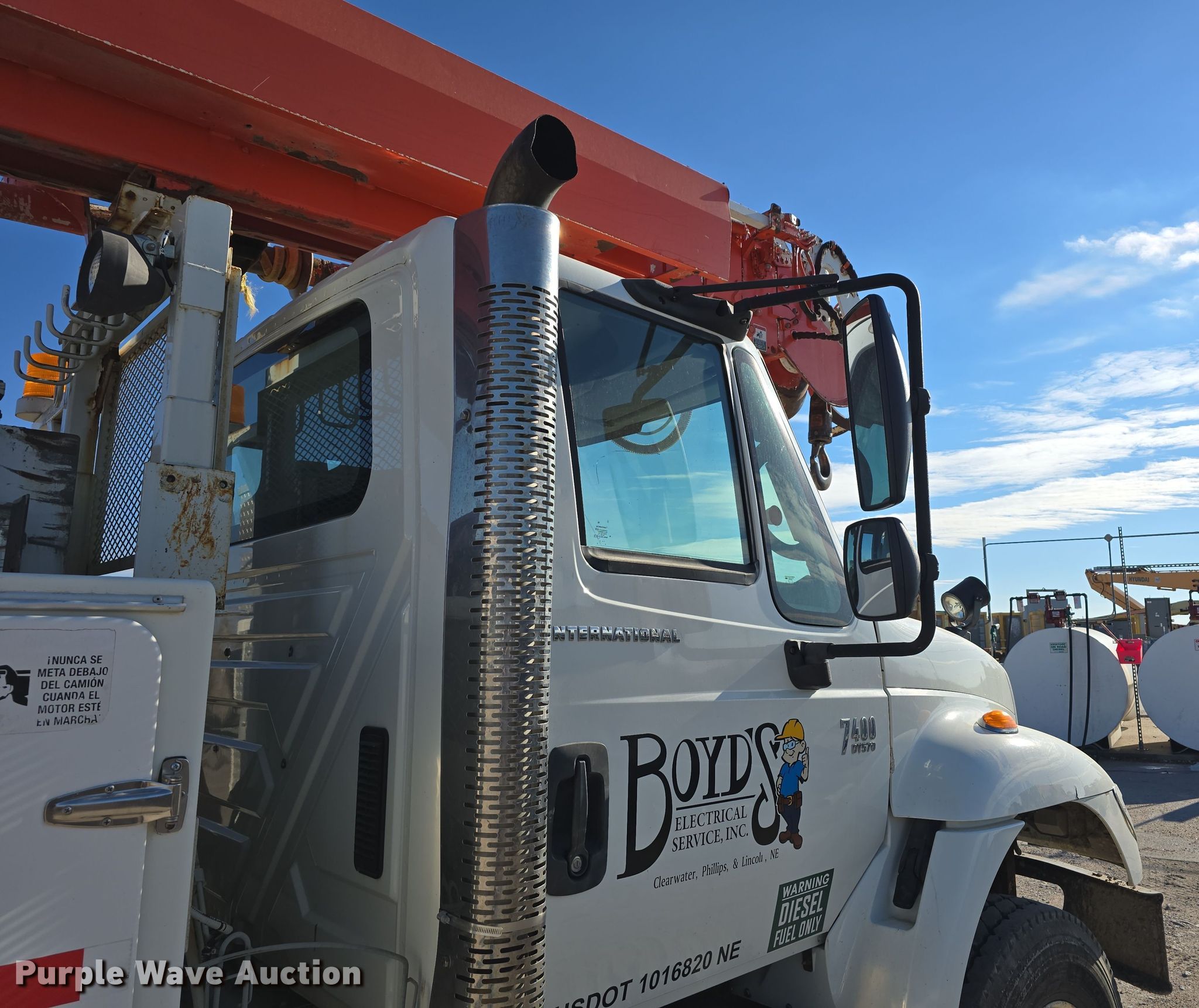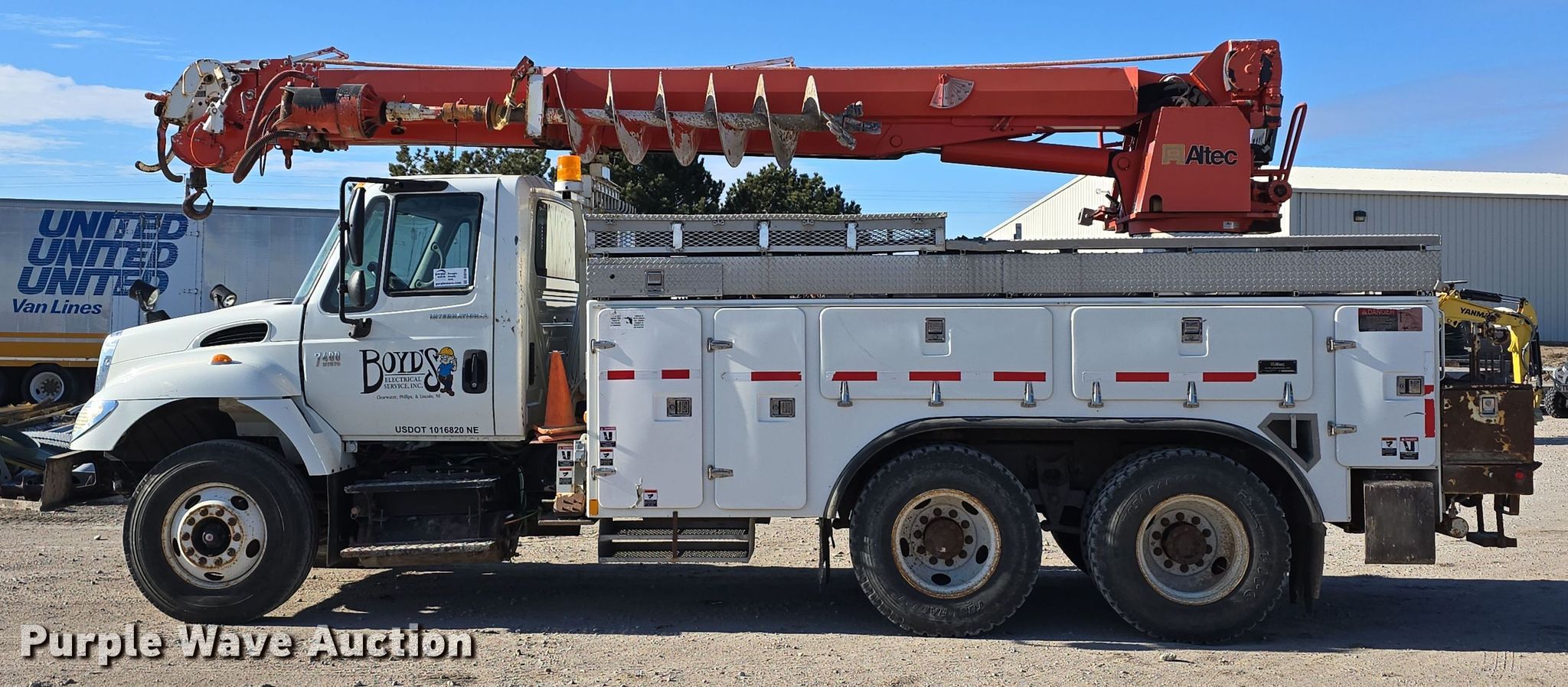 2007 International 7400 digger derrick truck. Miles: 79,033 on odometer, Hours: 10,025 on meter, Miles or hours may vary, unit still in use, VIN: 1HTWGAZR57J380635. Engine International DT466, Cylinders: 6, Fuel type: Diesel. Transmission Allison, Automatic. Chassis Axles: Tandem, Suspension: Spring, Brakes: Air, PTO, GVWR: 53,220 lbs, Wheelbase: 475". Interior AC, Heat, Heated mirrors, Cruise control, Brake controller. Features Bed Altec Astoria, Serial: 37-5643616, 15' L x 96" W, Boom 2007 Altec DM47 T R, Serial: 0506DV2029, Boom length: 35', Maximum lift capacity: 23,790 lbs, Maximum lift height: 47', Boom type: Insulated, Telescopic, Boom controls Platform/ basket, Remote control, Material handler, Pole guide, Auger Diameter: 20".. Tires Size: 11R22.5. Notes Windshield chipped or cracked, Bed contents not included, Engine issues, oil leak. Nebraska title. Title distribution may be delayed up to 14 days from verification of funds. Boyd's Electrical Service Inc. Phillips, NE 68865