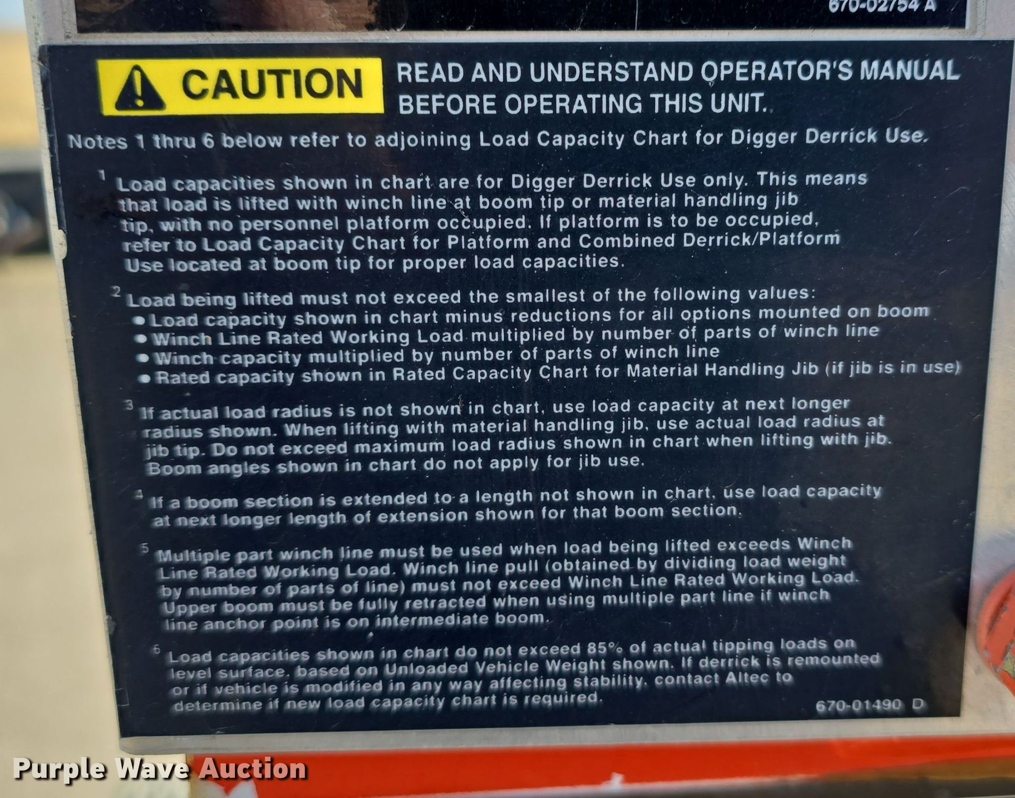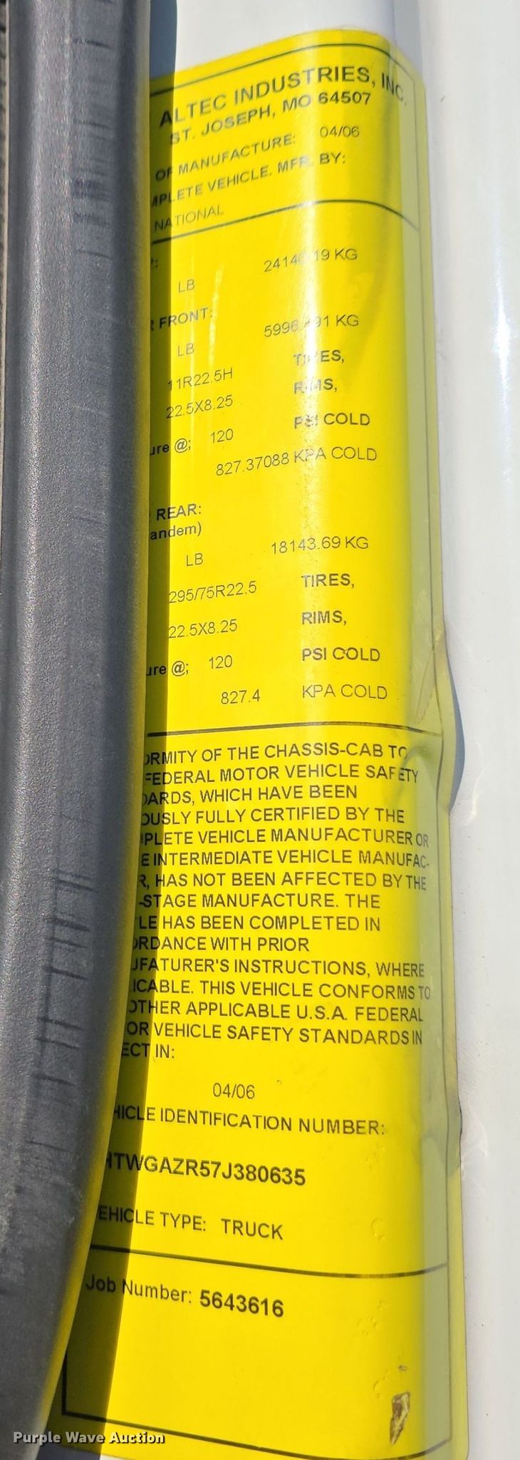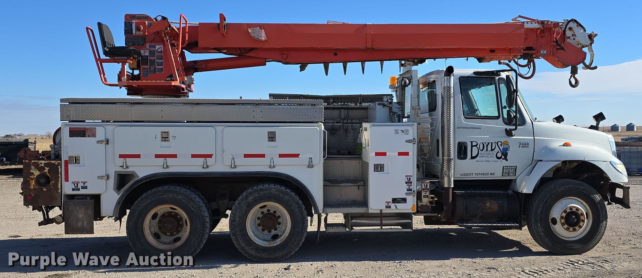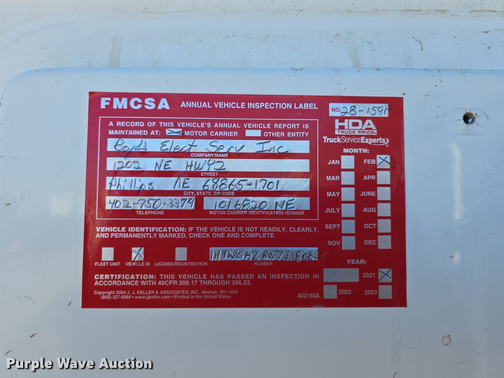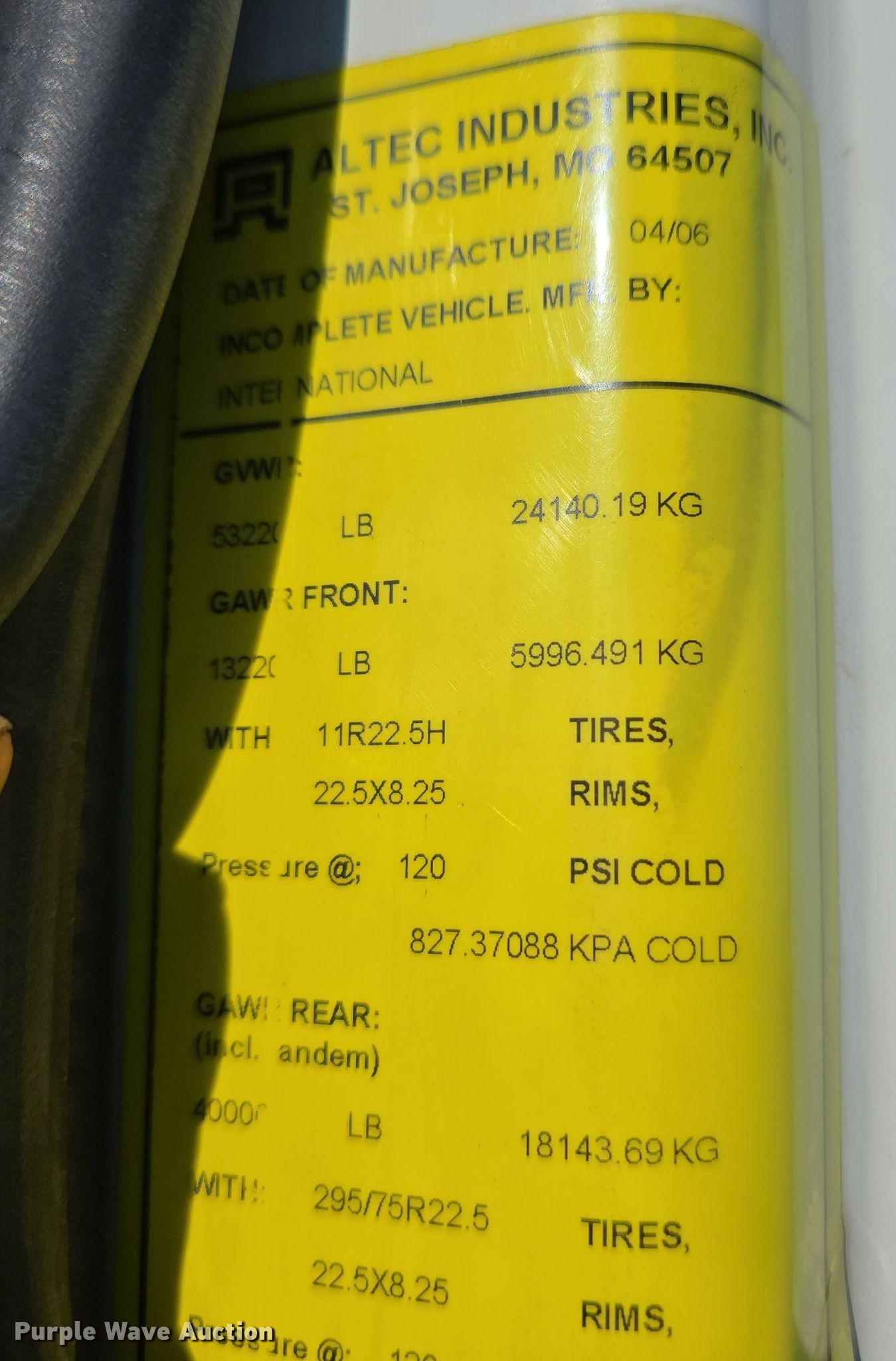 2007 International 7400 digger derrick truck. Miles: 79,033 on odometer, Hours: 10,025 on meter, Miles or hours may vary, unit still in use, VIN: 1HTWGAZR57J380635. Engine International DT466, Cylinders: 6, Fuel type: Diesel. Transmission Allison, Automatic. Chassis Axles: Tandem, Suspension: Spring, Brakes: Air, PTO, GVWR: 53,220 lbs, Wheelbase: 475". Interior AC, Heat, Heated mirrors, Cruise control, Brake controller. Features Bed Altec Astoria, Serial: 37-5643616, 15' L x 96" W, Boom 2007 Altec DM47 T R, Serial: 0506DV2029, Boom length: 35', Maximum lift capacity: 23,790 lbs, Maximum lift height: 47', Boom type: Insulated, Telescopic, Boom controls Platform/ basket, Remote control, Material handler, Pole guide, Auger Diameter: 20".. Tires Size: 11R22.5. Notes Windshield chipped or cracked, Bed contents not included, Engine issues, oil leak. Nebraska title. Title distribution may be delayed up to 14 days from verification of funds. Boyd's Electrical Service Inc. Phillips, NE 68865