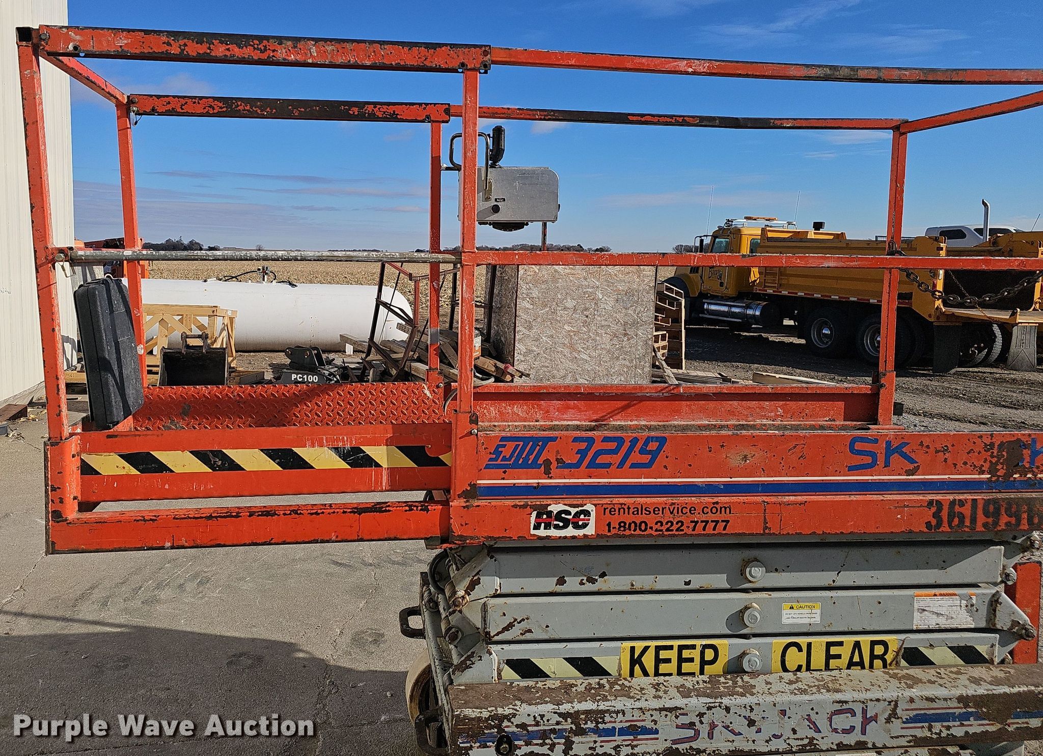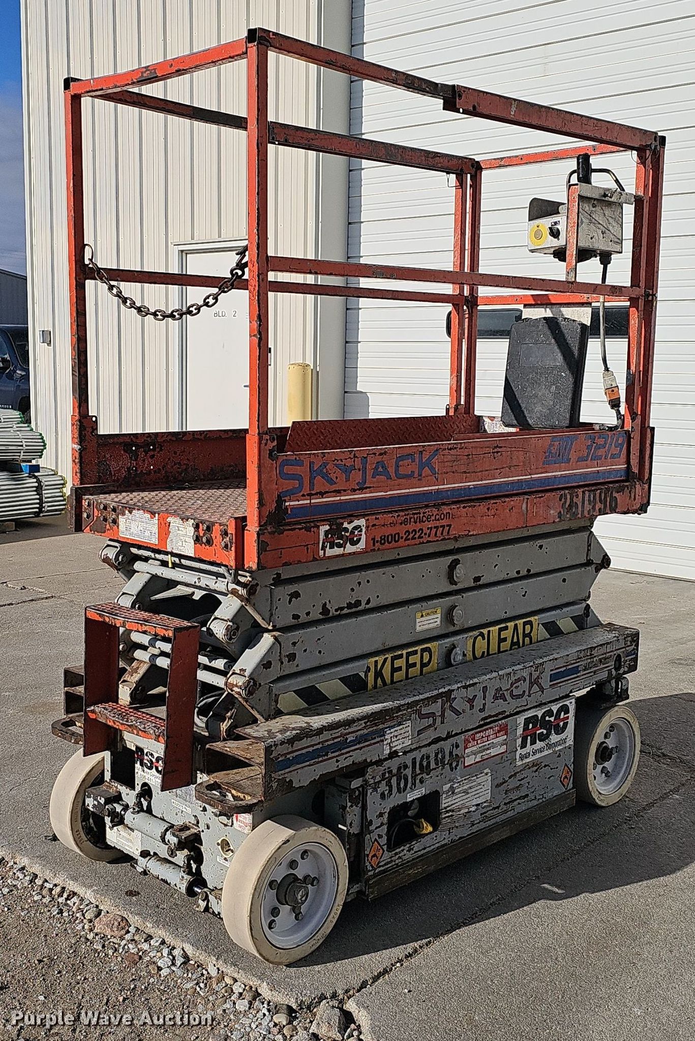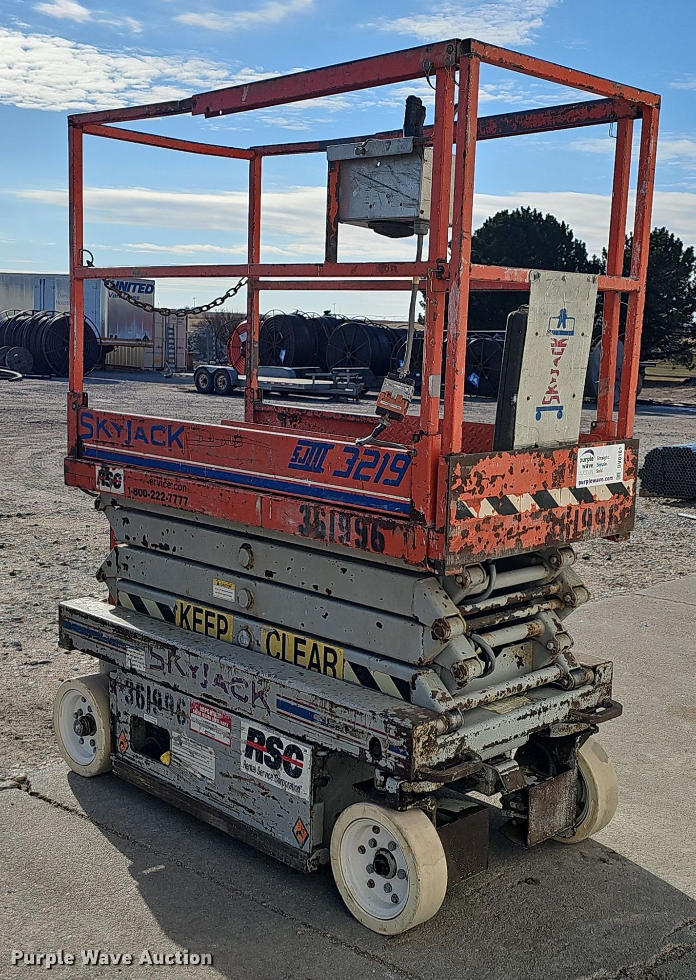 Purple Wave is selling a used Scissor or Vertical Lift in Nebraska. This item is a 2000 Skyjack SJIII 3219 scissor lift with the following: Hours: 613 on meter, Serial: 230803