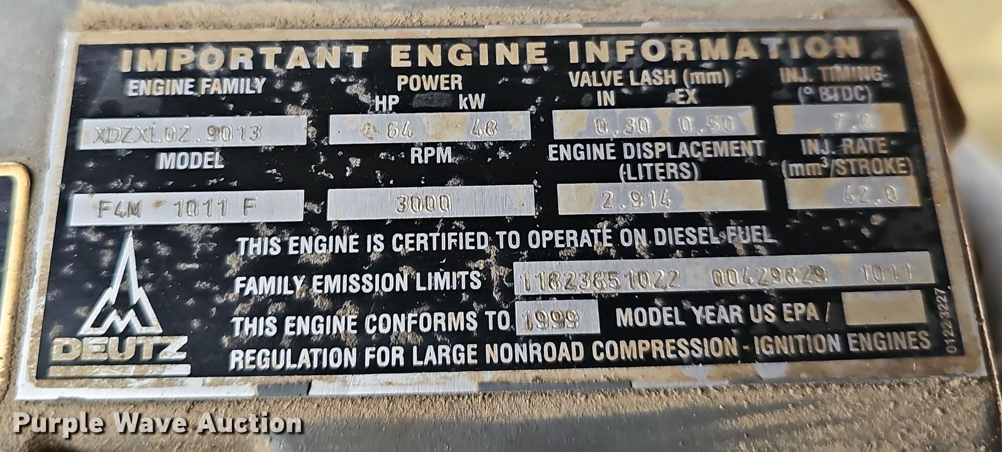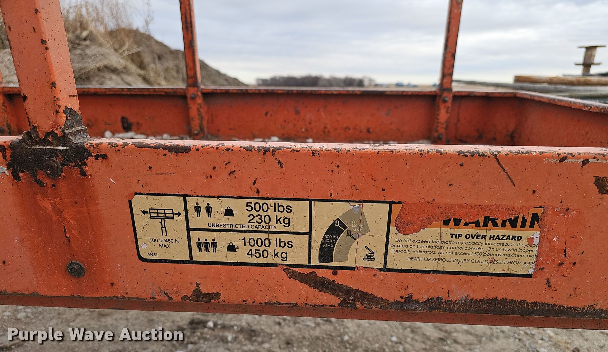 2000 JLG 600A boom lift. Hours: 538 on meter, Miles or hours may vary, unit still in use, Serial: 113926 0300048229. Engine Deutz F4M 1011F, Cylinders: 4, Fuel type: Diesel, HP: 64. Chassis Four wheel drive. Features Rough terrain, Boom type: Telescopic, Maximum lift capacity: 1,000 lbs, Maximum reach length: 60', Maximum lift height: 39.61', Hydraulic leveling, Platform: 96" L x 36" W, AC power outlet, Controls: Platform, Ground, Platform rotation: Hydraulic. Tires Tire size: 14-17.5NHS, Foam filled. Boyd's Electrical Service Inc. Phillips, NE 68865