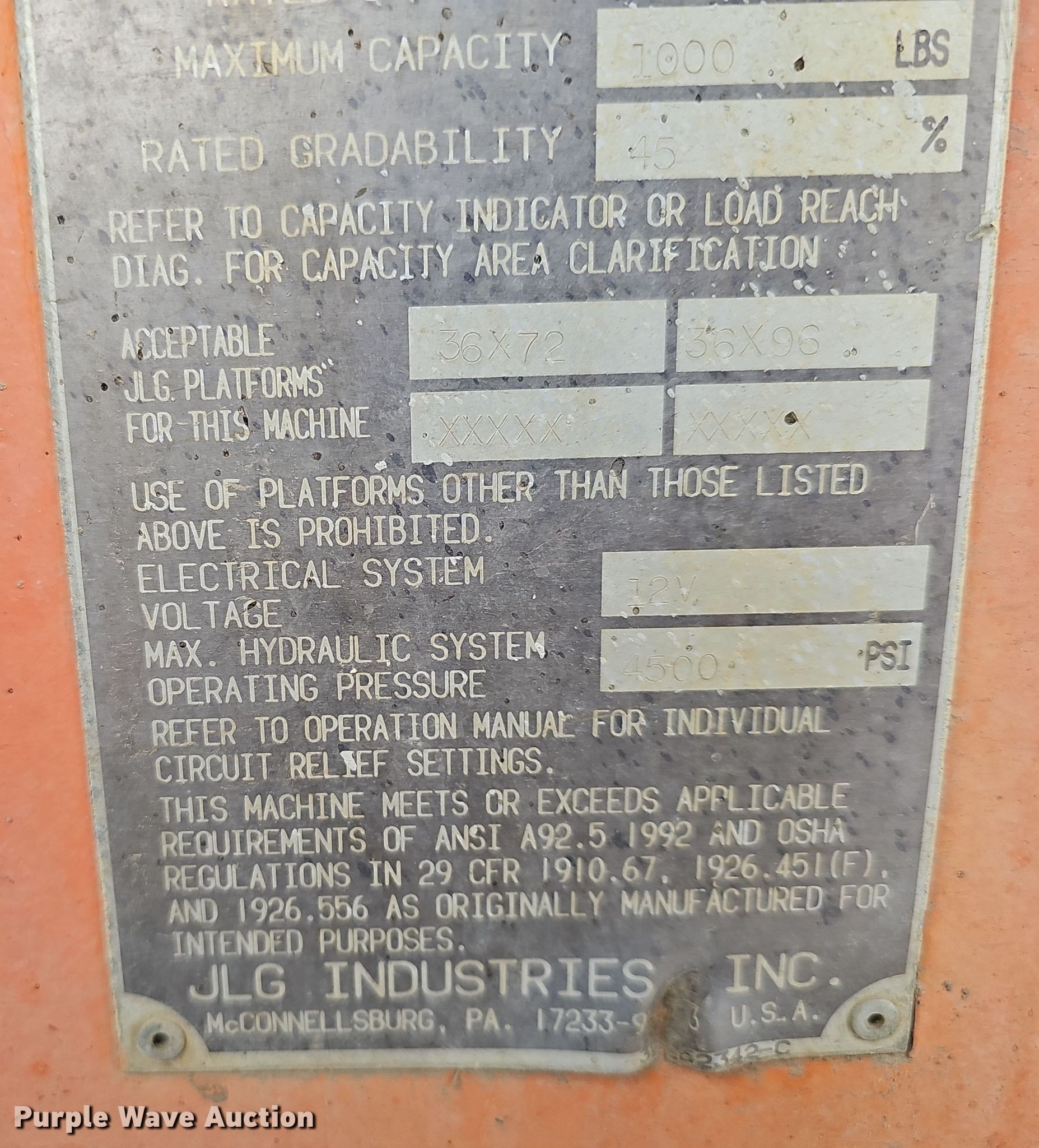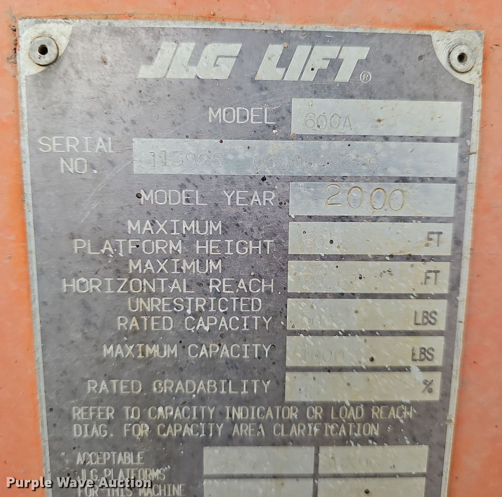 Purple Wave is selling a used Boom Lift in Nebraska. This item is a 2000 JLG 600A boom lift with the following: Hours: 538 on meter, Miles or hours may vary, unit still in use, Serial: 113926 0300048229