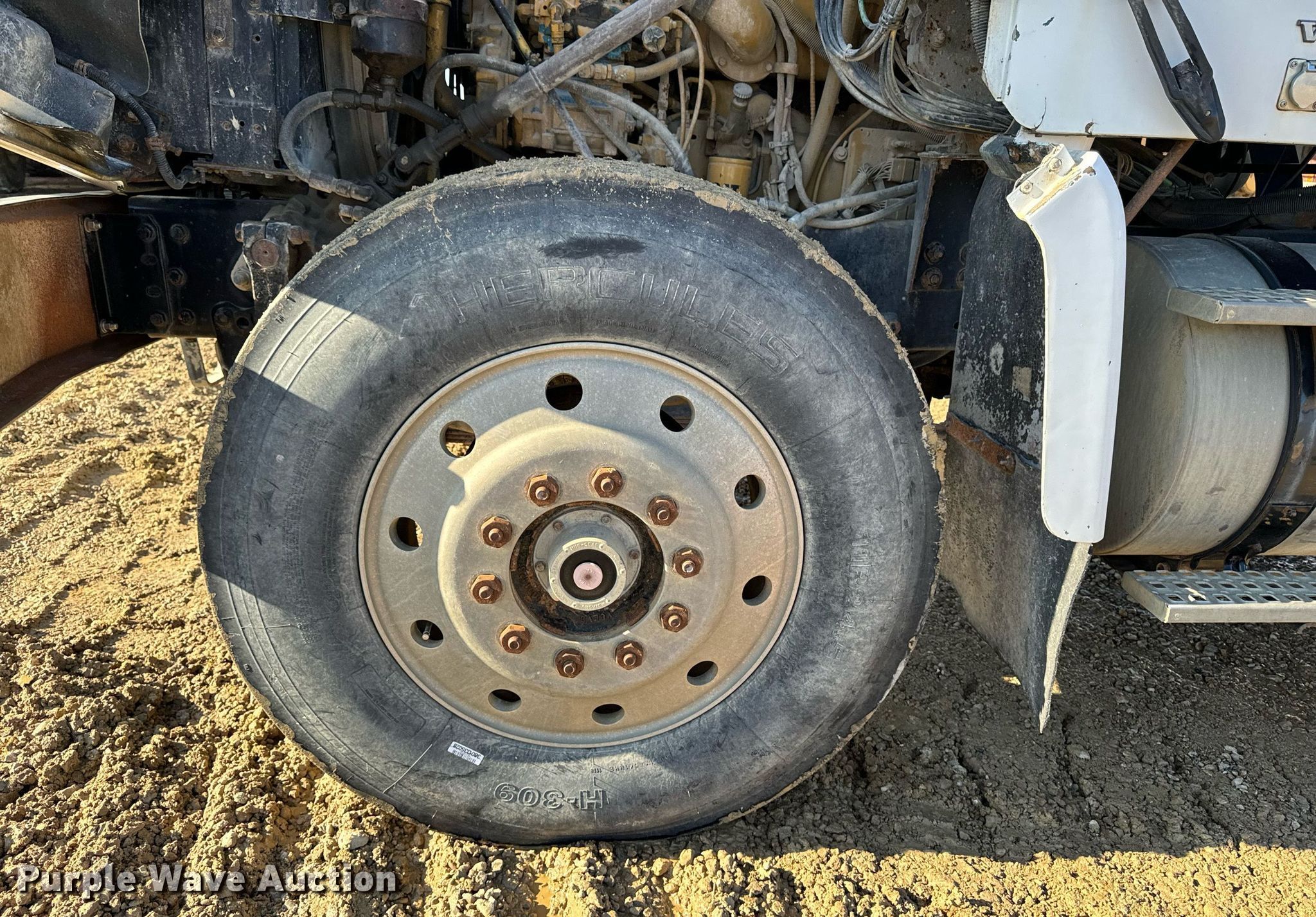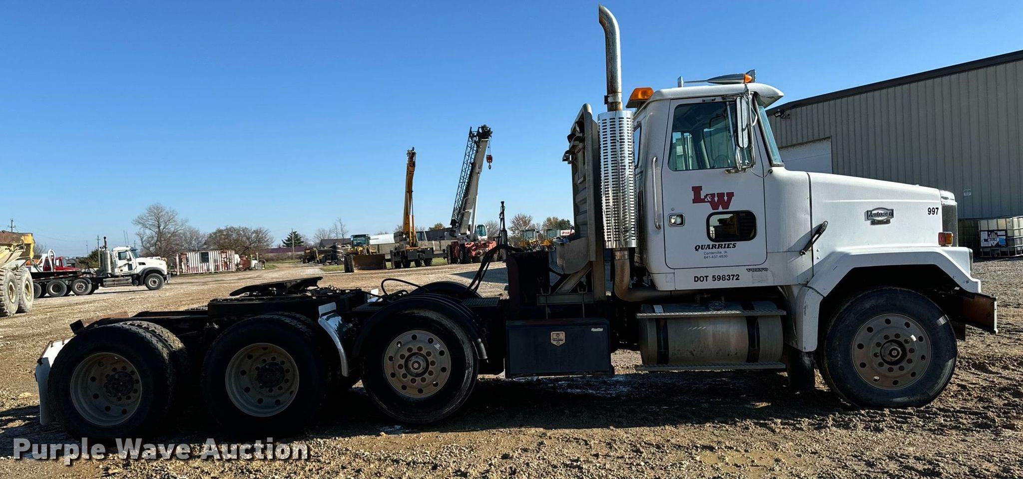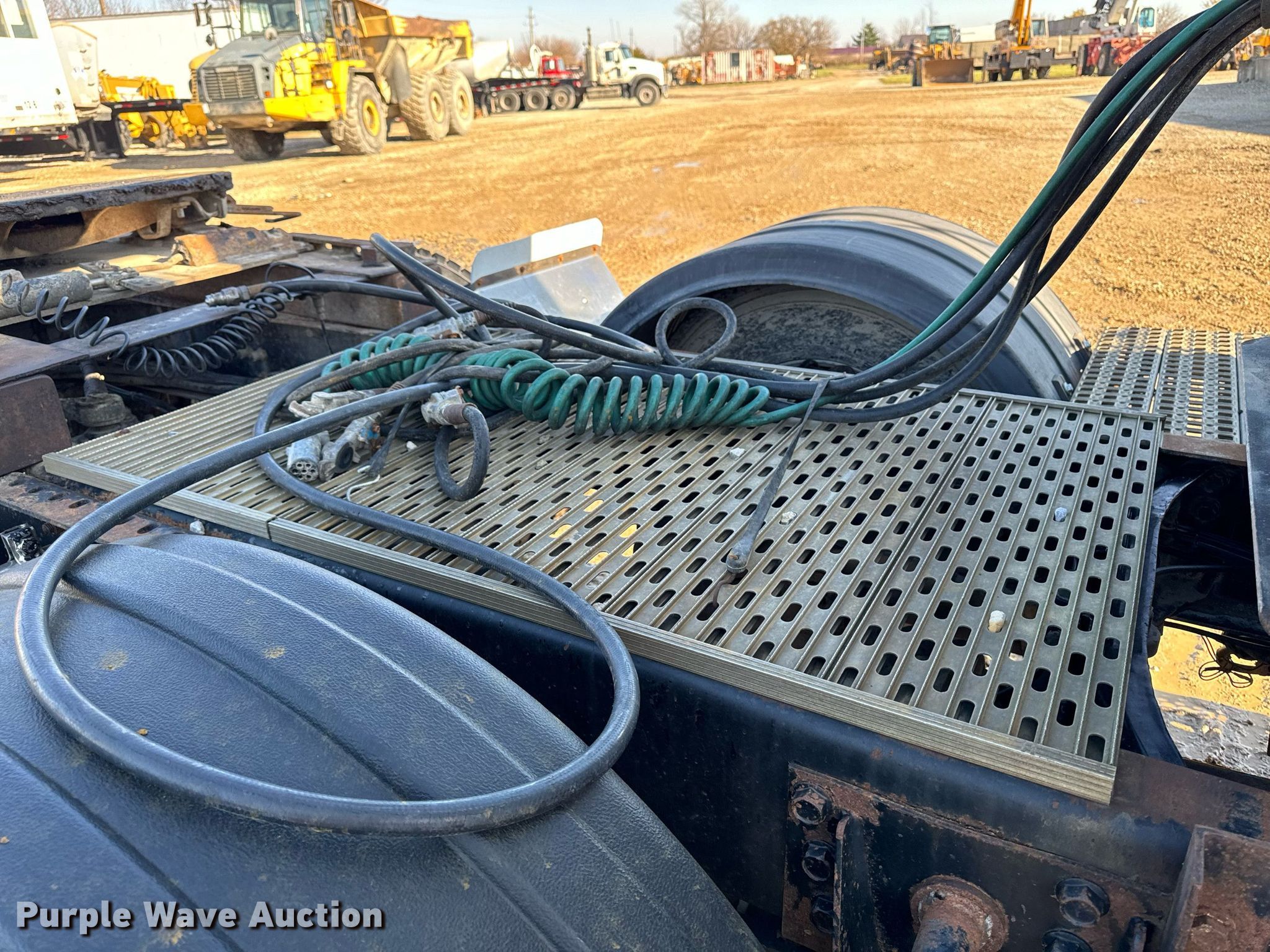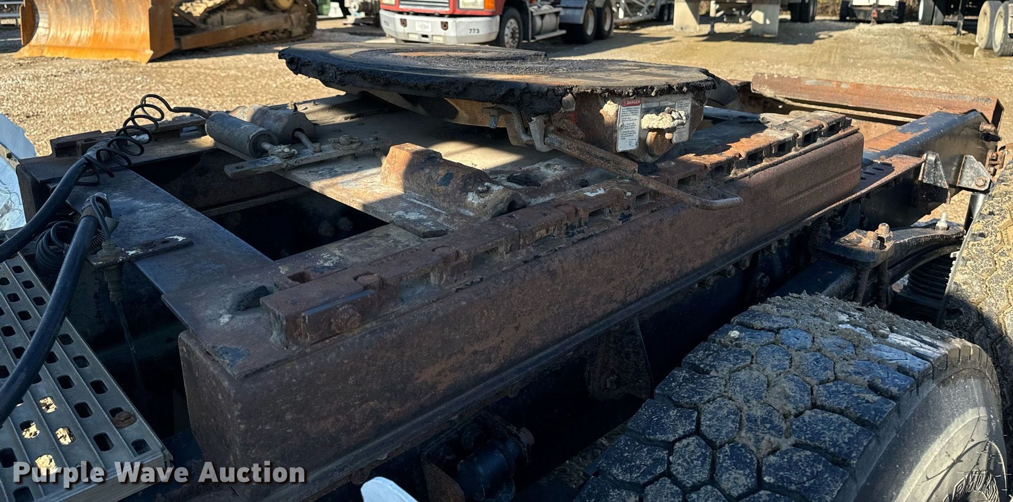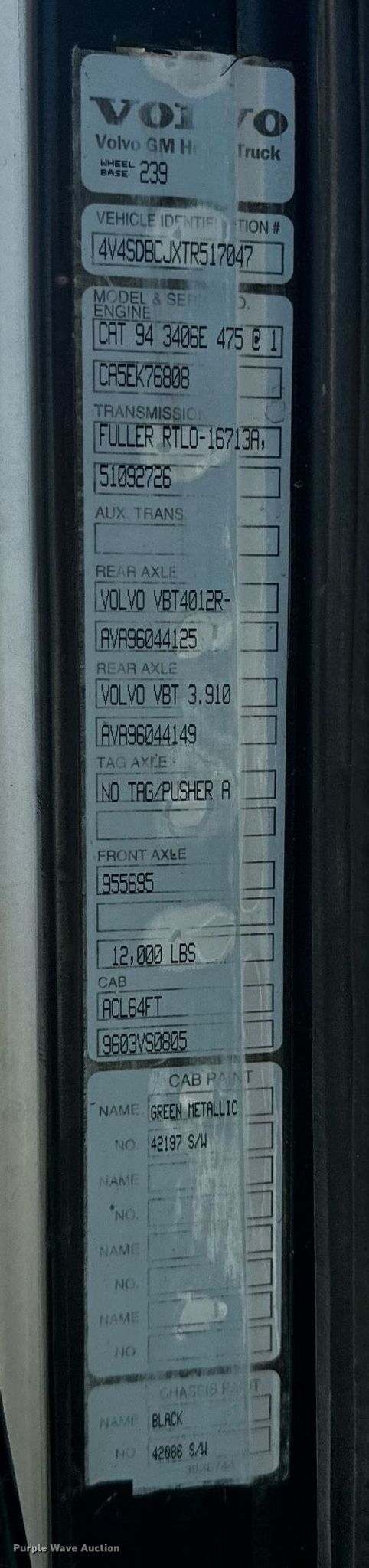 1996 Volvo Autocar semi truck. Miles: 6,191 on odometer, Hours: 8,323 on meter, Miles: Unknown, VIN: 4V4SDBCJXTR517047. Engine Caterpillar 3406E, Displacement: 14.6L, Cylinders: 6, Fuel type: Diesel. Transmission Eaton Fuller RTLO-16713A, Manual, Speed: 13. Chassis Axles: Triple, Pusher axle, Differential lock: Full, Suspension: Spring over walking beam, Brakes: Air, PTO, Wet kit, GVWR: 52,000 lbs FAWR: 12,000 lbs, IAWR: 20,000 lbs, RAWR: 20,000 lbs, Wheelbase: 239". Interior AC, Heat, Heated mirrors, Cruise control. Features Deck plate: Aluminum, Fifth wheel type: Air operated, Sliding, Fuel tank: Dual. Tires Size: 11R24.5, Lift axle: 11R22.5. Notes Windshield chipped or cracked. Titles will be distributed after confirmation of payment and removal. Iowa title. Mileage has not been verified. Exempt will be written in the odometer disclosure on the title. Title distribution may be delayed up to 30 days from verification of funds. Rasmussen Group. West Burlington, IA 52655