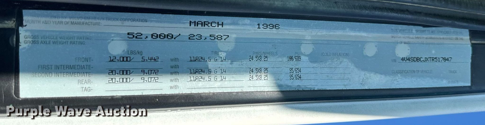 Purple Wave is selling a used Truck Tractor in Iowa. This item is a 1996 Volvo Autocar semi truck with the following: Miles: 6,191 on odometer, Hours: 8,323 on meter, Miles: Unknown, VIN: 4V4SDBCJXTR517047