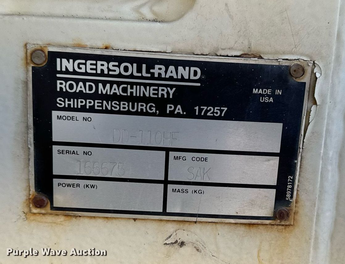 2001 Ingersoll Rand DD-110HF double drum vibratory roller. Hours: 6,046 on meter, Serial: 166675. Engine Cummins B3.9-C, Serial: 46060397, Displacement: 3.9L, Cylinders: 4, Fuel type: Diesel, HP: 125. Transmission Hydrostatic. Operators station OROPS, Vandal cover. Features Drum: Smooth, Vibratory system: Double, Independent drum controls, Two speed, Front drum Width: 78", Diameter: 54", Rear drum Width: 78", Diameter: 54", Drum scrapers: Front, Rear, Water spray applicator: Front, Rear, Dual propel system. Rock Island, IL 61201