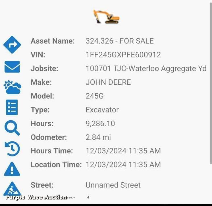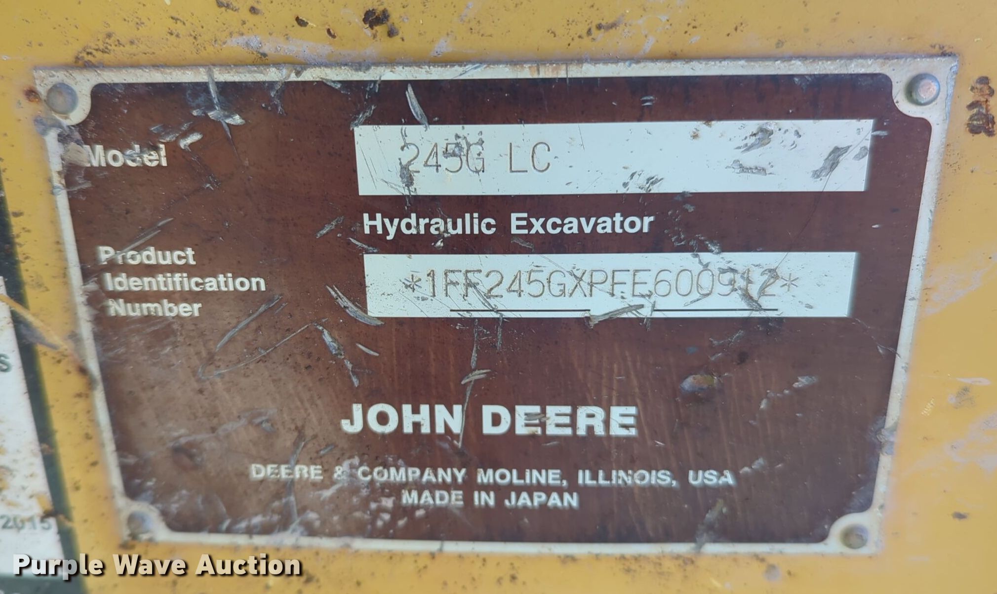 Purple Wave is selling a used Hydraulic Excavator in Oklahoma. This item is a 2016 John Deere 245G LC excavator with the following: Hours: 68,792 on meter, ECM hours: 9,286, Serial: 1FF245GXPFE600912, Unit #: 324.326