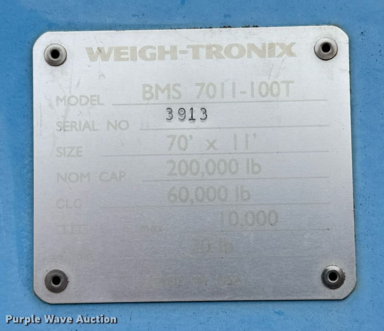 Weigh-Tronix BMS 7011-100T truck scale. Serial: 3913, Overall: 70� x 11�, Capacity: 200,000 lbs. Notes Trailer not included. Concordia, KS 66901