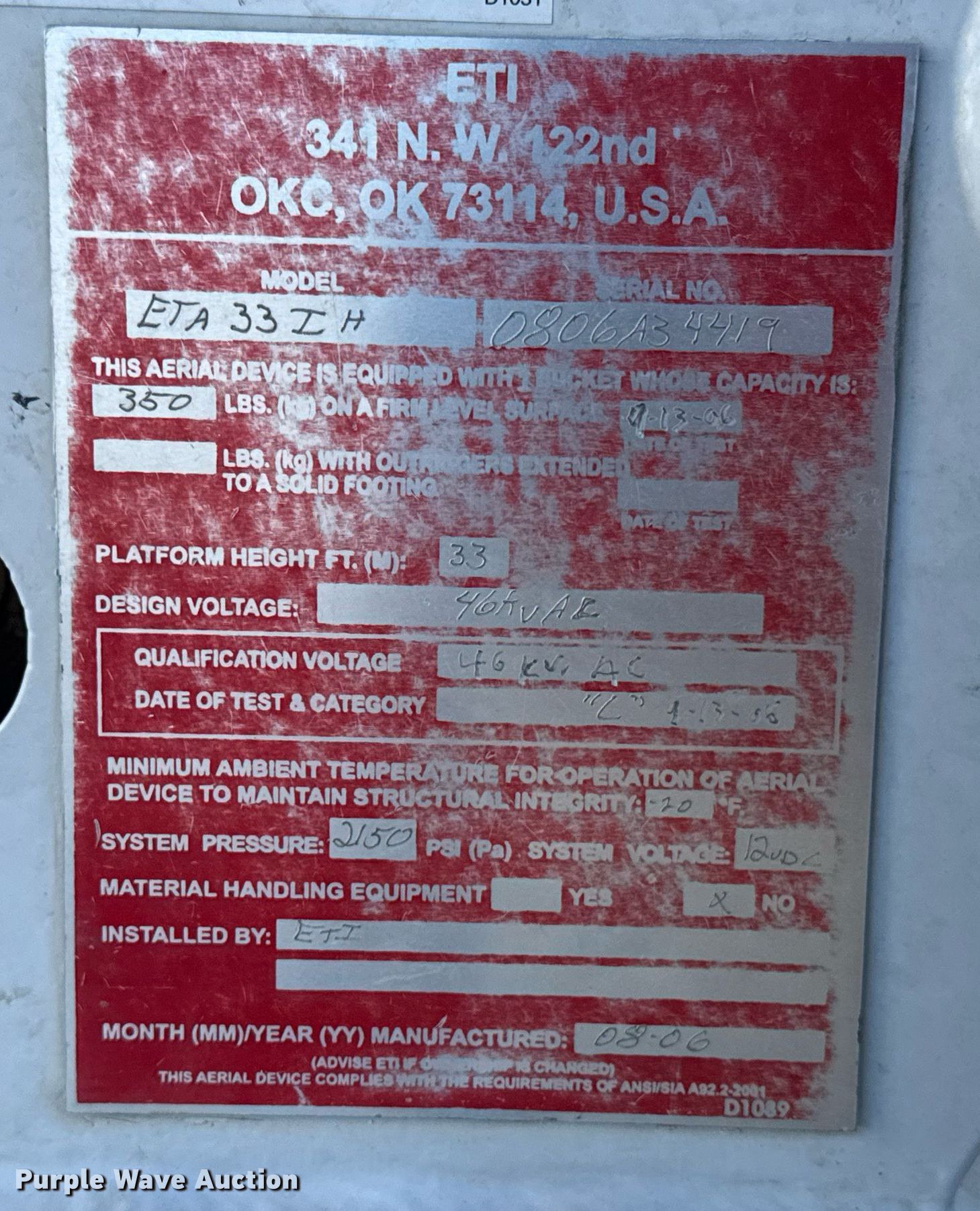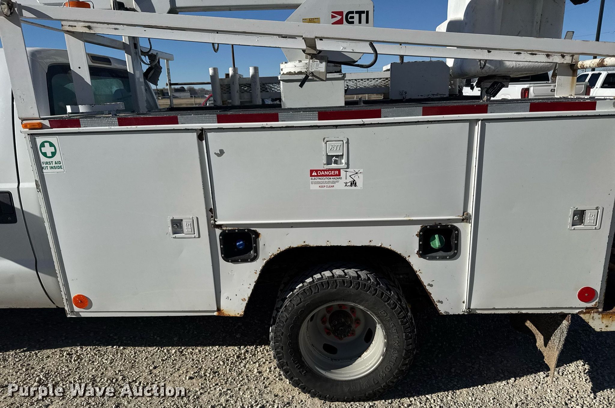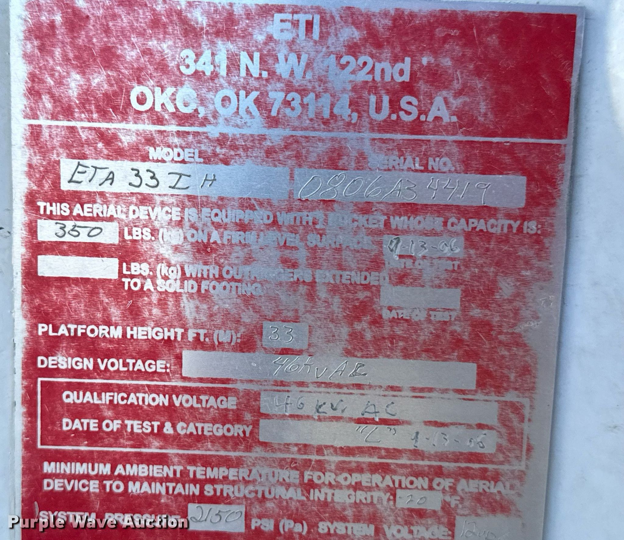 2015 Ford F350 Super Duty bucket truck. Miles: 200,086 on odometer, VIN: 1FDRF3HT3FEA83002. Engine Displacement: 6.7L V8 OHV, Cylinders: 8, Fuel type: Diesel. Transmission Automatic. Chassis Four wheel drive, Axles: Single, Suspension: Spring, Brakes: Hydraulic, PTO, GVWR: 14,000 lbs, Wheelbase: 141". Interior AC, Heat, Cruise control, Auxiliary controls. Features Bed ETI, 10' L x 96" W, Boom ETI ETA 33 IH, Mast height: 33', Maximum lift capacity: 350 lbs, Boom type: Articulating, Insulated, Man basket, Boom controls Ground, Platform/ basket.. Tires Size: 245/75R17. Notes Dash warning indicator: Check engine. Kansas title. Rolling Hills Electrical Coop. Beloit, KS 67420
