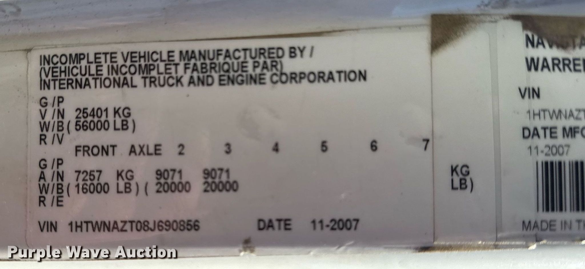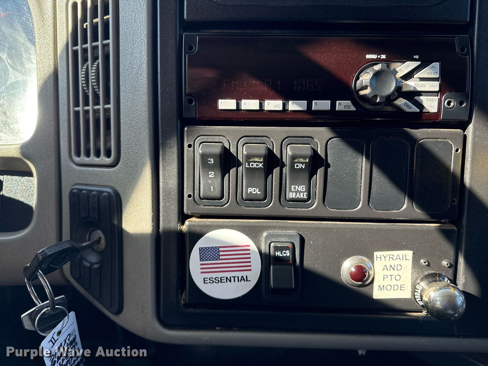 2008 International 7500 Crew Cab crane truck. Miles: 177,879 on odometer, Hours: 18,538 on meter, VIN: 1HTWNAZT08J690856. Engine Displacement: 9.3L, Cylinders: 6, Fuel type: Diesel, Engine brake. Transmission Eaton Fuller 8LL, Manual, Speed: 10. Chassis Hi-rail system, Axles: Tandem, Suspension: Air, Brakes: Air, PTO, GVWR: 56,000 lbs FAWR: 16,000 lbs, IAWR: 20,000 lbs, RAWR: 20,000 lbs. Interior AC, Heat, Heated mirrors, Cruise control, Auxiliary controls. Features Utility bed 15' L x 96" W, Crane 2007 Palfinger PK5002 Serial: 100063241, Telescopic, Knuckle.. Tires Front: 315/80R22.5, Rear: 11R22.5. Notes Hi-rail system wheels missing. Oklahoma title. Title distribution may be delayed up to 14 days from verification of funds. Collinsville, OK 74021