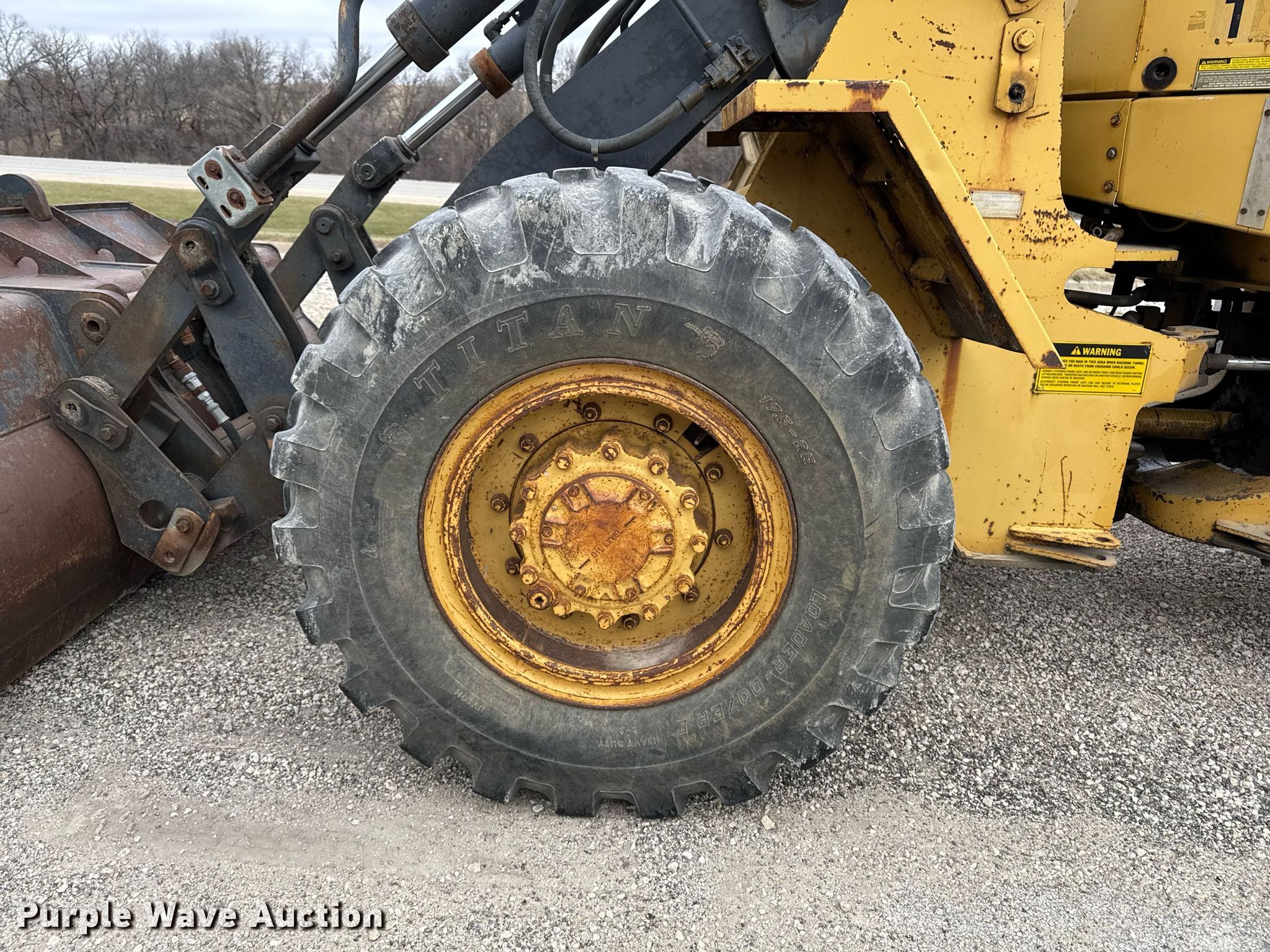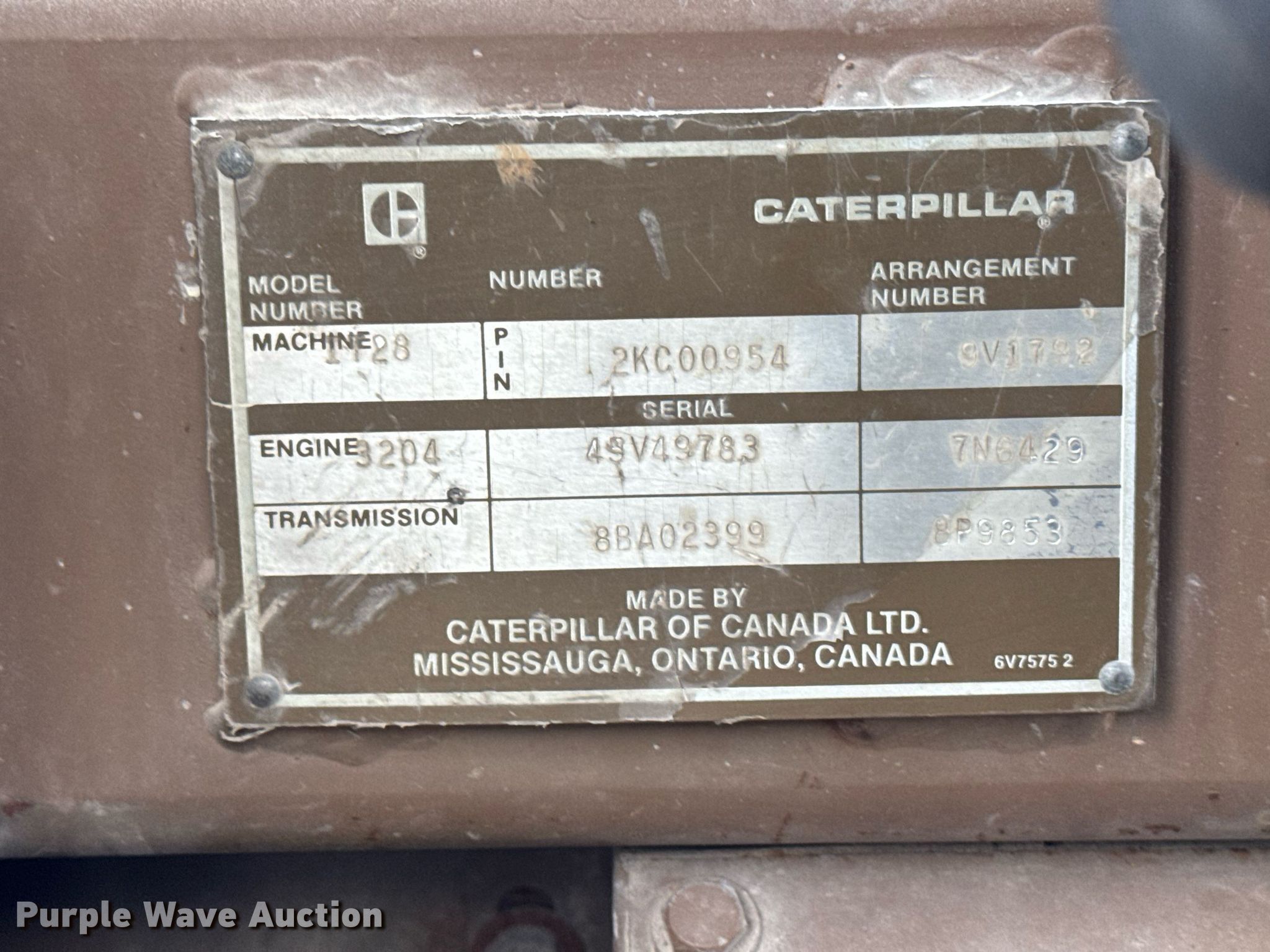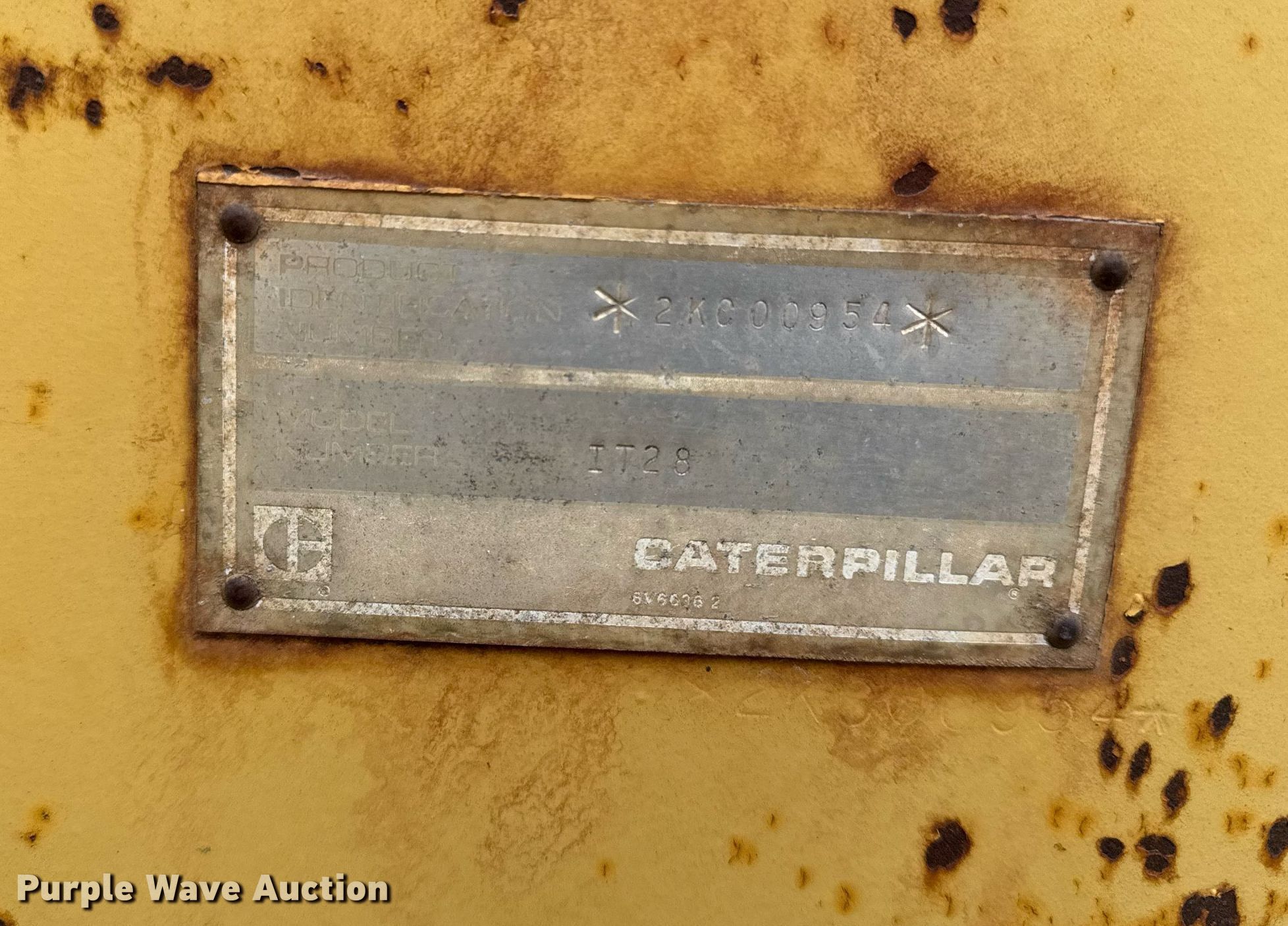 1985 Caterpillar IT28 wheel loader. Hours: 12,977 on meter, Serial: 2KC00954. Engine Caterpillar 3204, Cylinders: 4, Fuel type: Diesel. Transmission Powershift, 4F - 4R. Chassis Differential lock. Operators station Enclosed cab, Heat, Bucket controls: Two-lever. Features Auxiliary hydraulics: Front, Quick coupler: Hydraulic, Bucket Caterpillar, Width: 94", Self- leveling bucket, Cutting edge: Bolt-on, Forks Length: 48". Tires Size: 17.5-24. Notes Warning indicator: Alternator, Non-operational brakes. Wicks Construction. Decorah, IA 52101