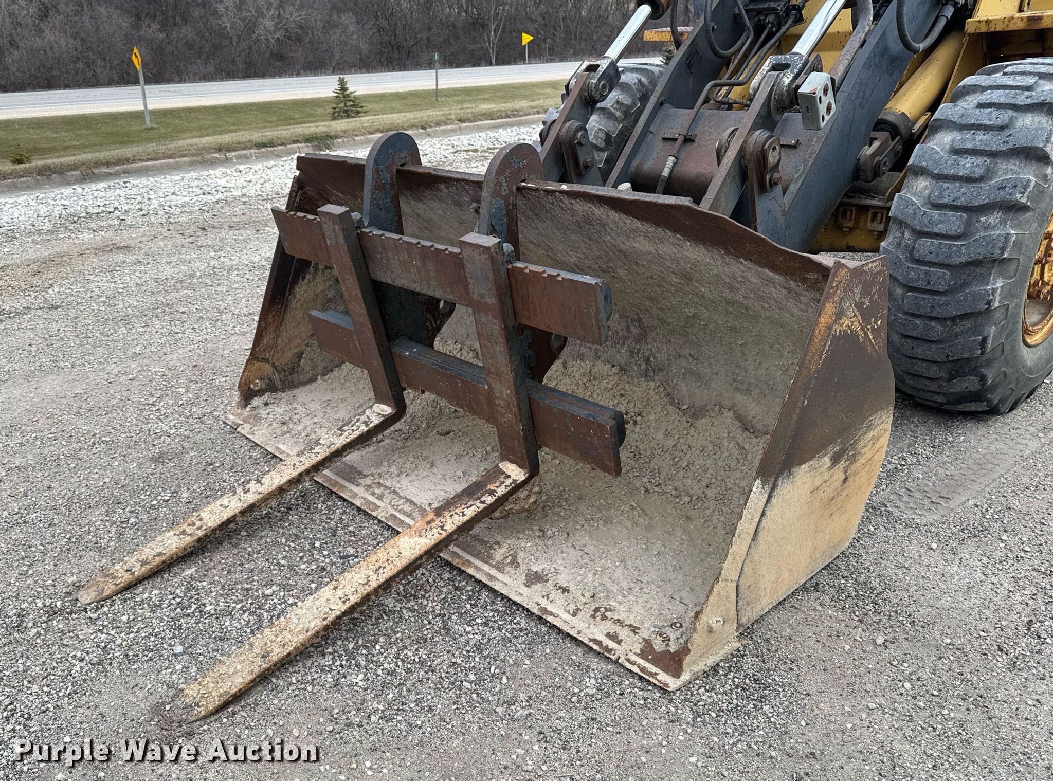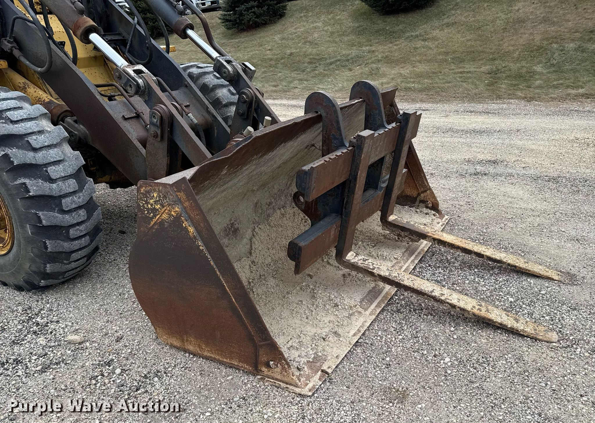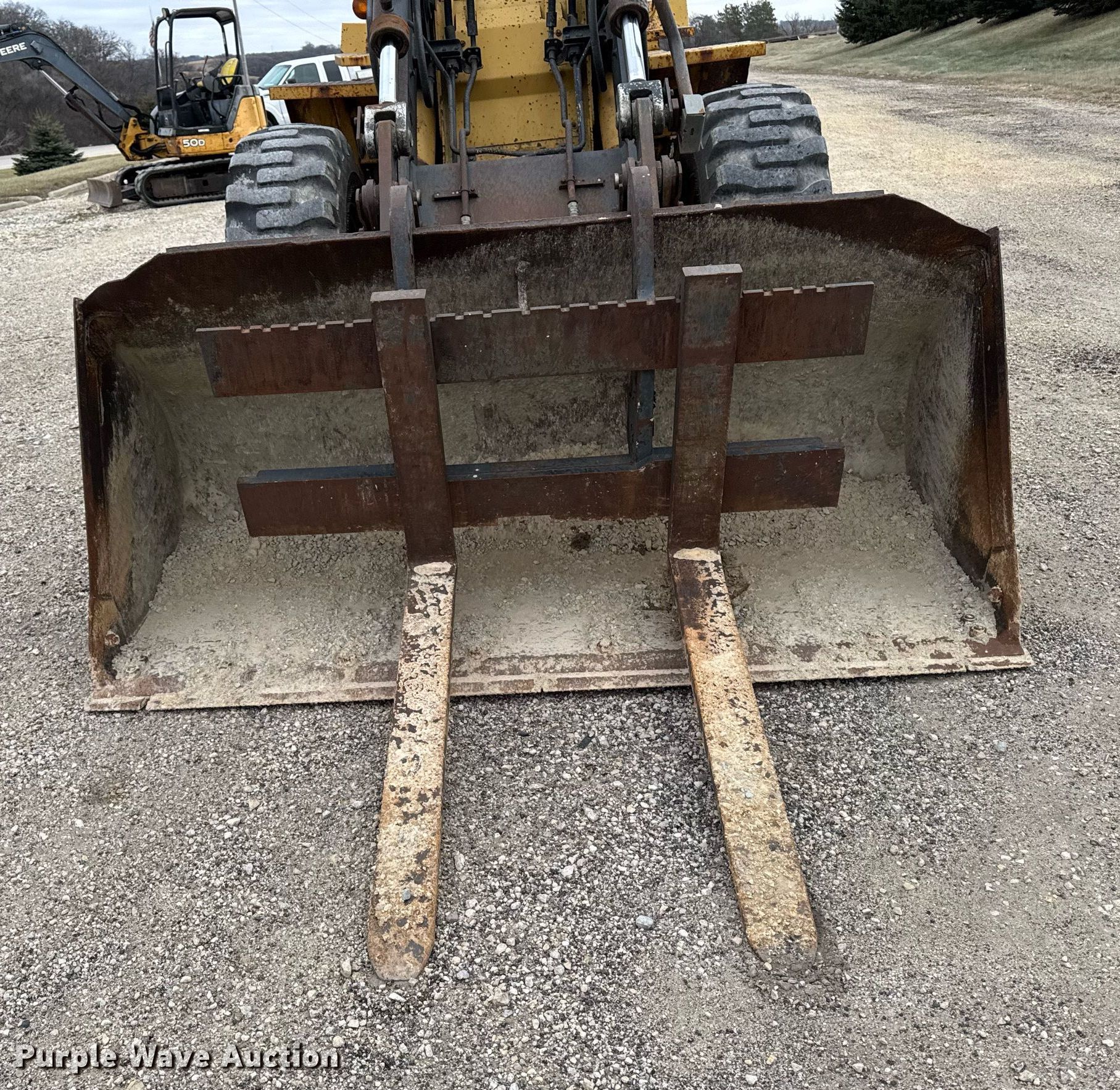 1985 Caterpillar IT28 wheel loader. Hours: 12,977 on meter, Serial: 2KC00954. Engine Caterpillar 3204, Cylinders: 4, Fuel type: Diesel. Transmission Powershift, 4F - 4R. Chassis Differential lock. Operators station Enclosed cab, Heat, Bucket controls: Two-lever. Features Auxiliary hydraulics: Front, Quick coupler: Hydraulic, Bucket Caterpillar, Width: 94", Self- leveling bucket, Cutting edge: Bolt-on, Forks Length: 48". Tires Size: 17.5-24. Notes Warning indicator: Alternator, Non-operational brakes. Wicks Construction. Decorah, IA 52101