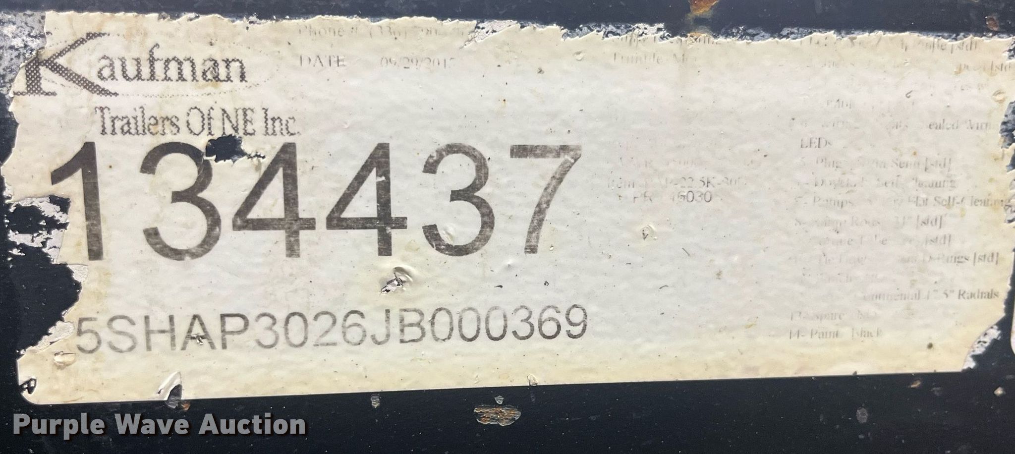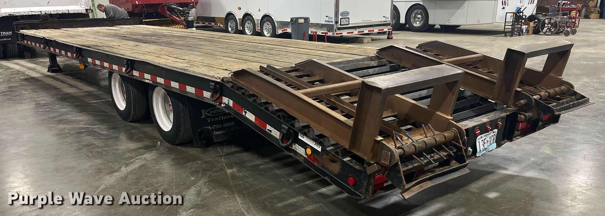 2018 Kaufman equipment trailer. VIN: 5SHAP3026JB000369. Dimensions Overall: 36' 5" L x 101" W, Deck: 24' 8" L x 100.75" W, Tail length: 62", Ramps: Manual Length: 60". Features Deck type: Wood. Chassis Hitch: Pintle, Landing gear: Dual, Suspension: Spring, Brakes: Air, Axles: Tandem. Tires Steel wheels, Size: 215/75R17.5. Missouri title. Title distribution may be delayed up to 14 days from verification of funds. Shaw Excavating and Grading. Trimble, MO 64492