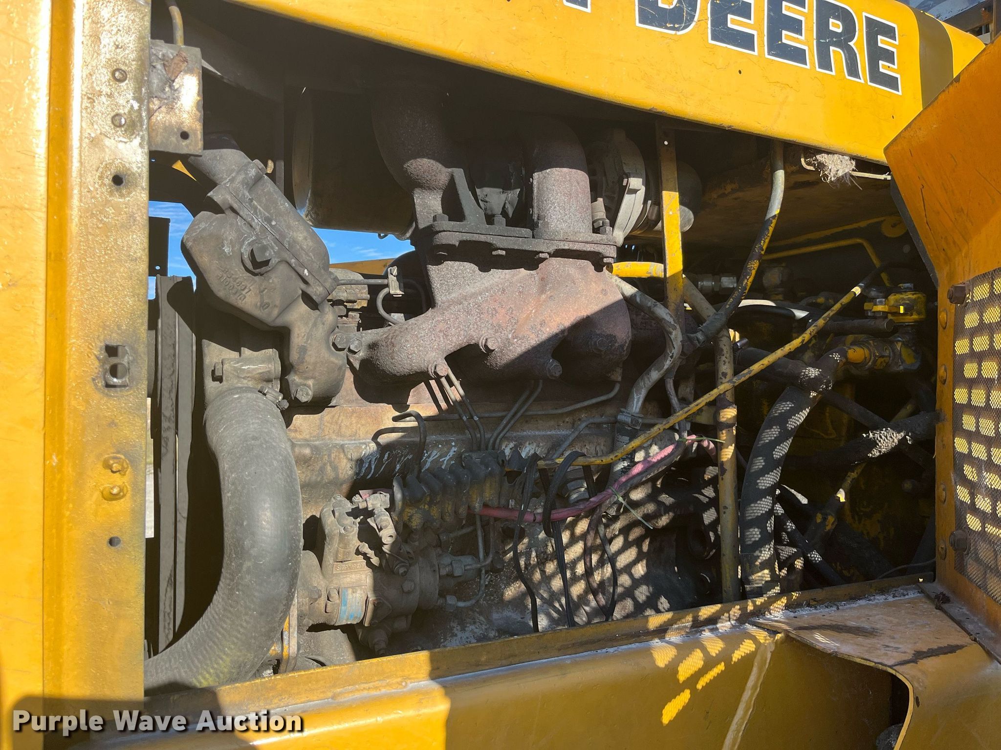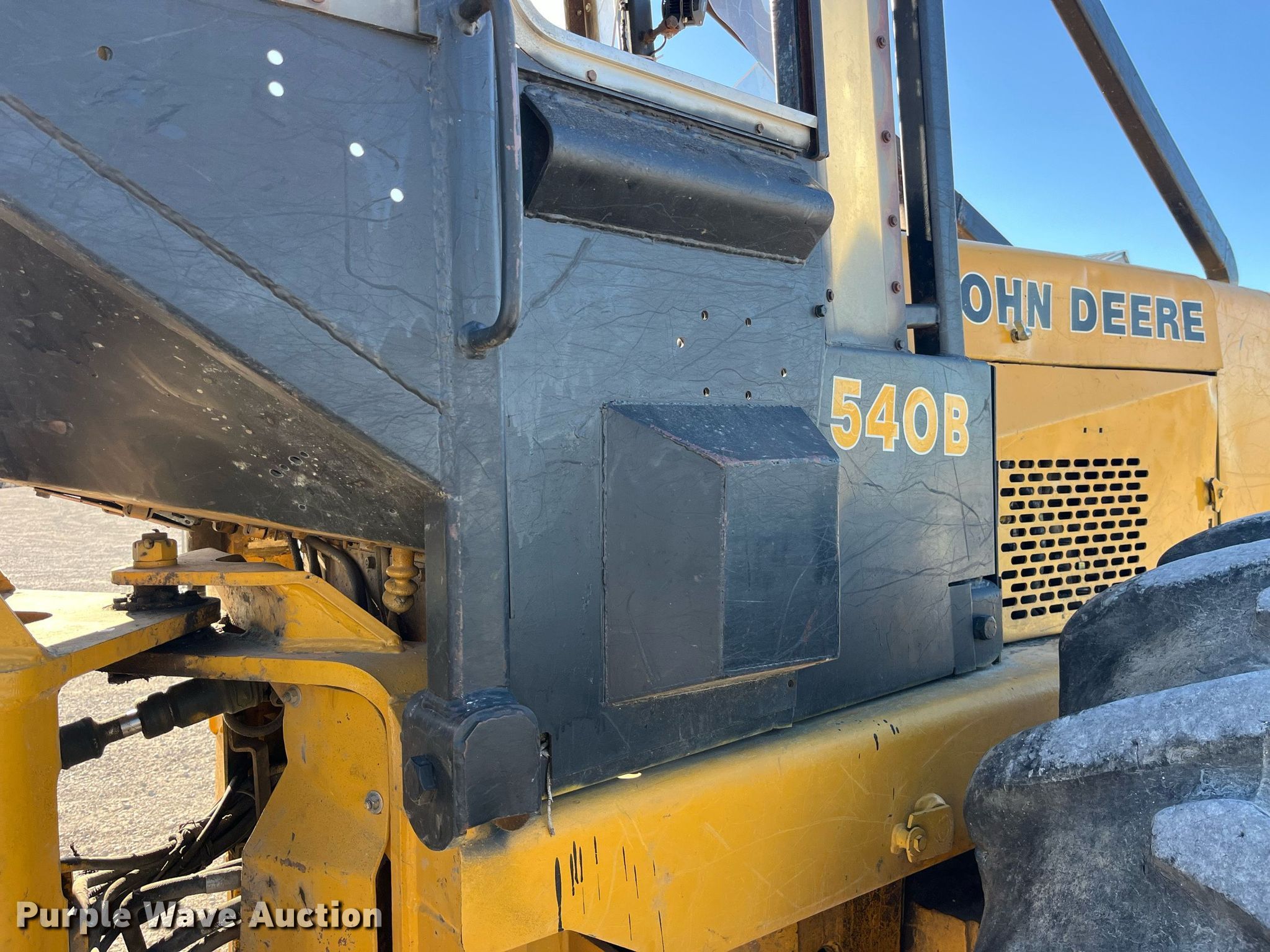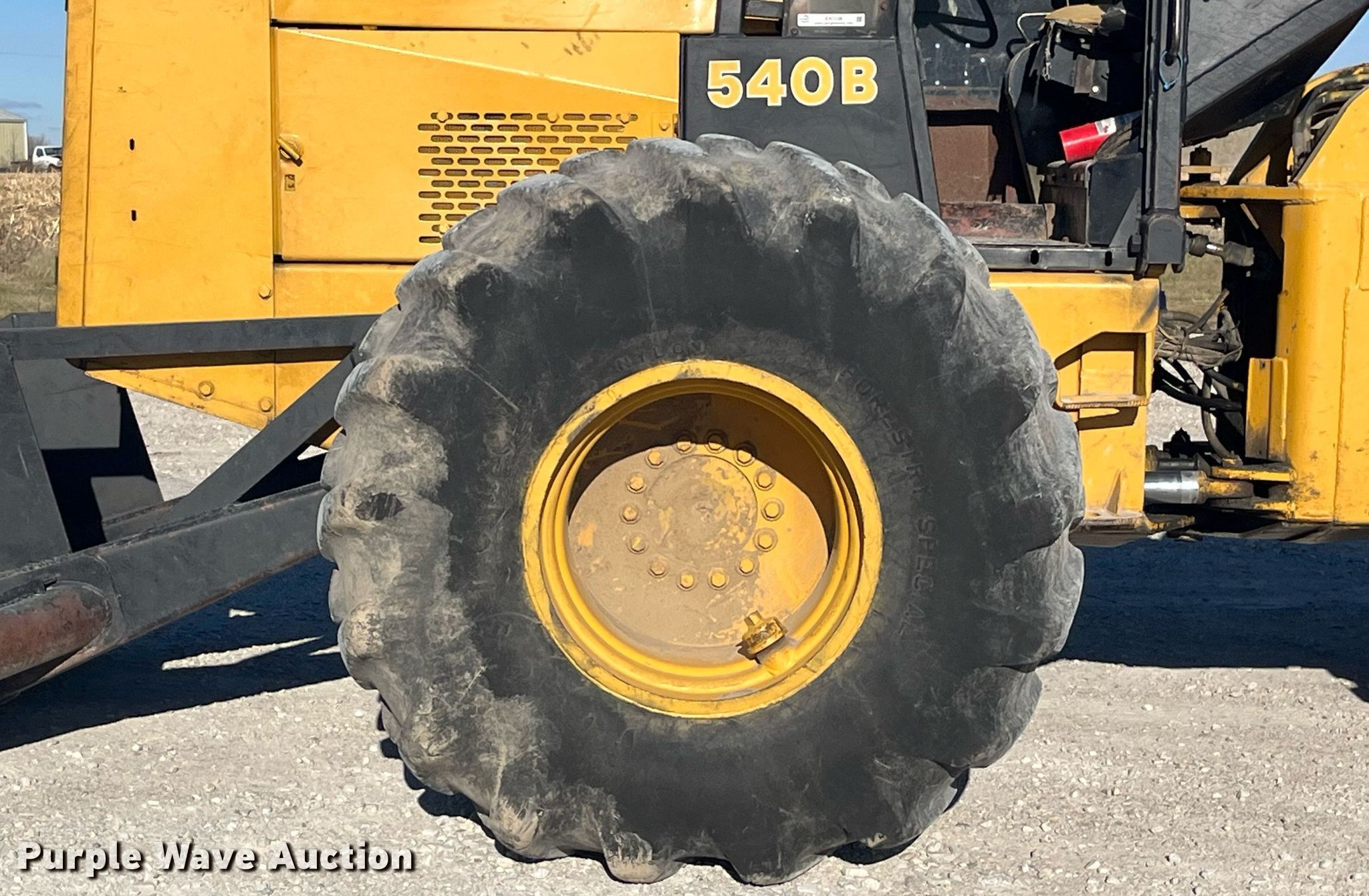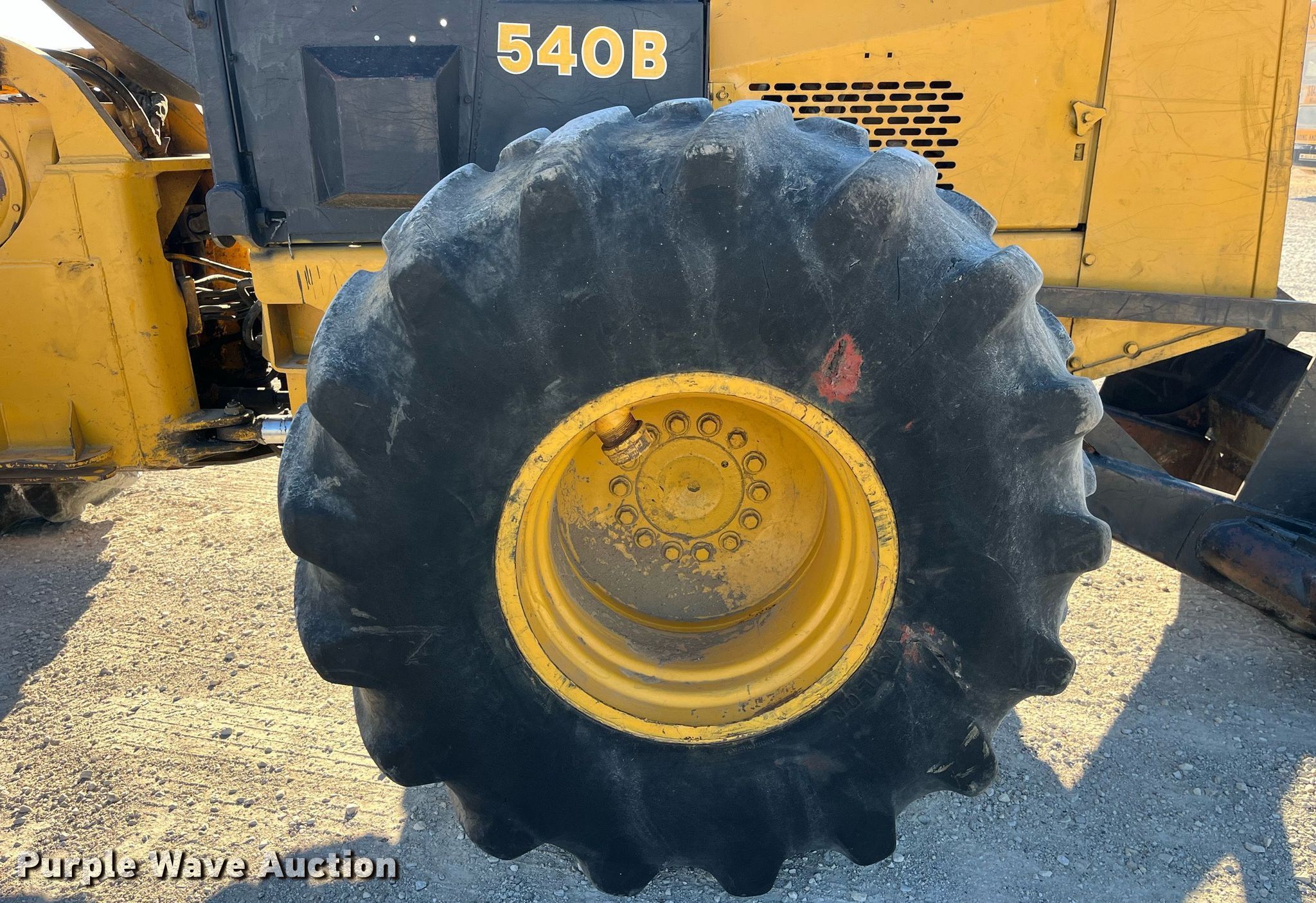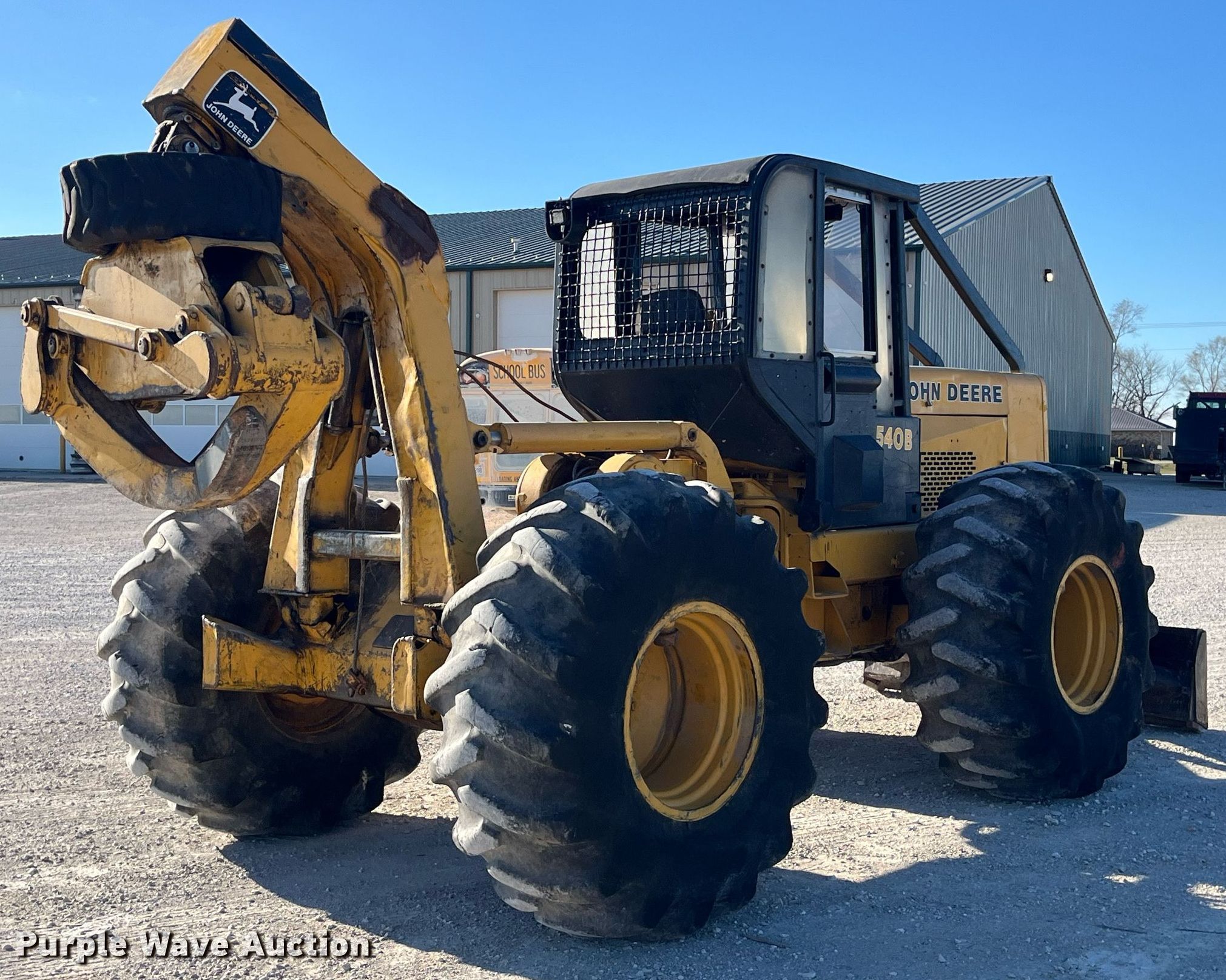 John Deere 540B skidder. Hours: 913 on meter. Engine John Deere 4045TF001, Serial: T04045T481546, Cylinders: 4, Fuel type: Diesel. Transmission Powershift, 8F - 4R. Chassis Four wheel drive, Differential lock. Operators station Canopy. Features Grapple Maximum opening: 73", Blade Width: 84", Winch Cable diameter: 0.5". Tires Size: 25.1-26. Notes Plexi glass broken. Durham, MO 63438