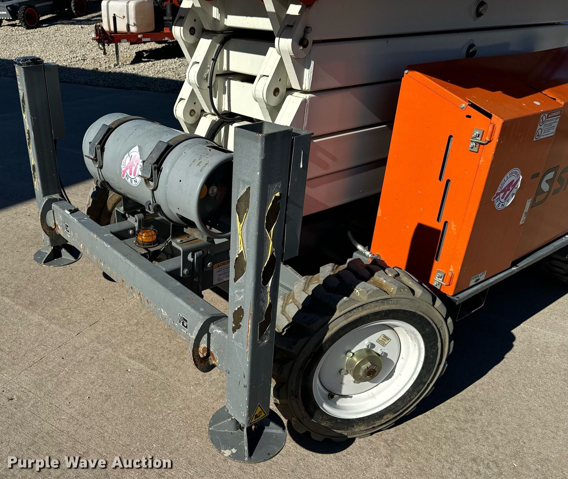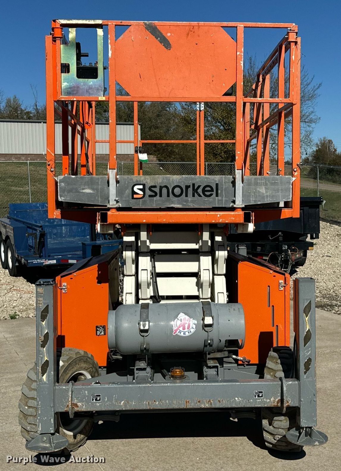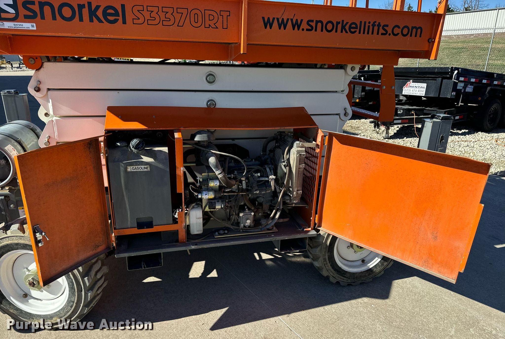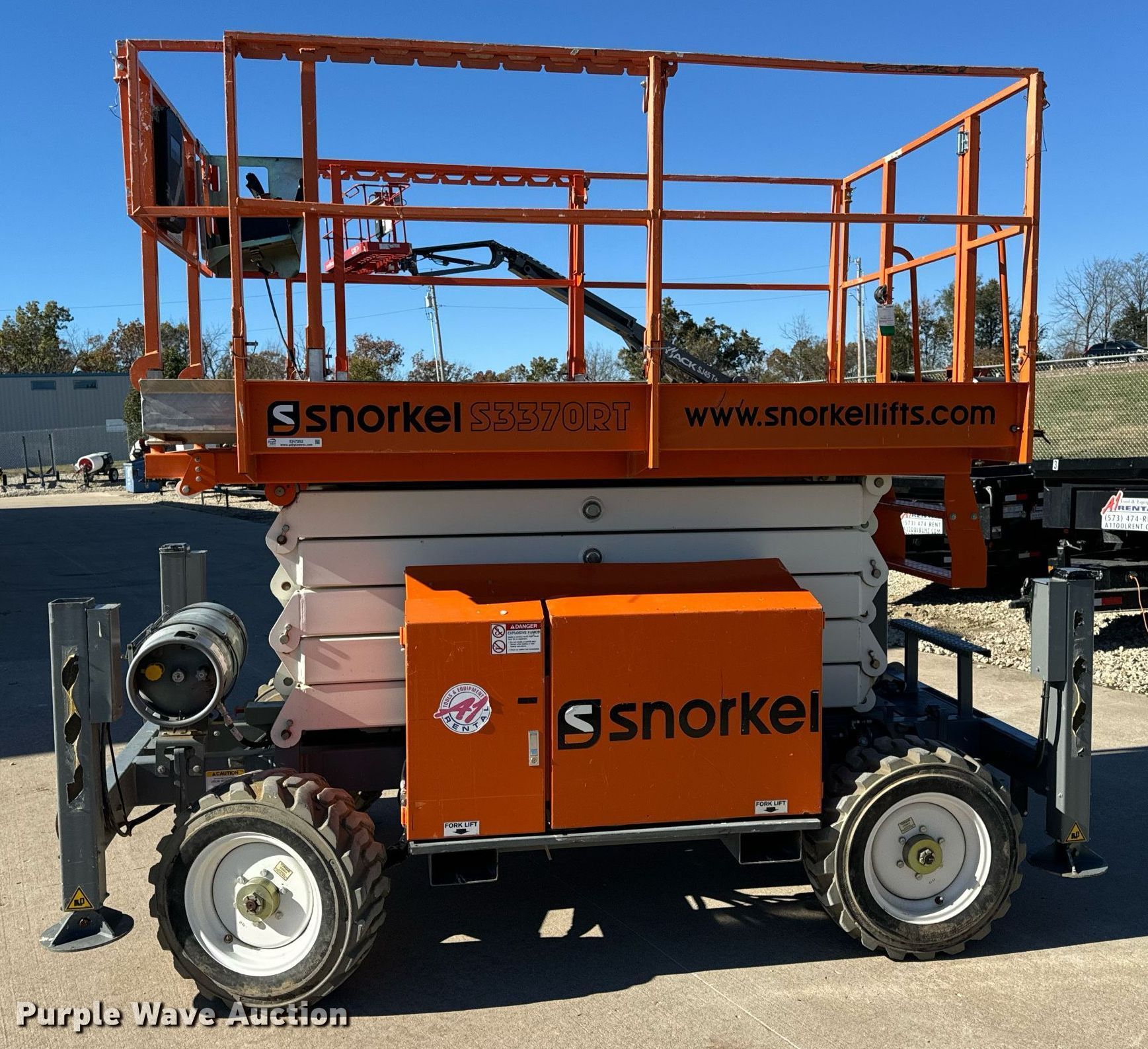 2017 Snorkel S3370RTV6 scissor lift. Hours: 655 on meter, Serial: S3370RT-07-170700327. Engine Kubota WG752-GL-ET, Displacement: 740.5 cc, Cylinders: 3, Fuel type: Dual fuel. Chassis Four wheel drive. Features Rough terrain, Maximum lift capacity: 990 lbs, Maximum lift height: 33', Hydraulic outriggers, Hydraulic leveling, Platform: 105" L x 62" W, AC power outlet, Controls: Platform, Ground, Platform extensions: Manual, Safety alarm. Tires Tire size: 27X10.50-15, Foam filled. A-1 Tool & Equipment Rental. Columbia, MO 65201