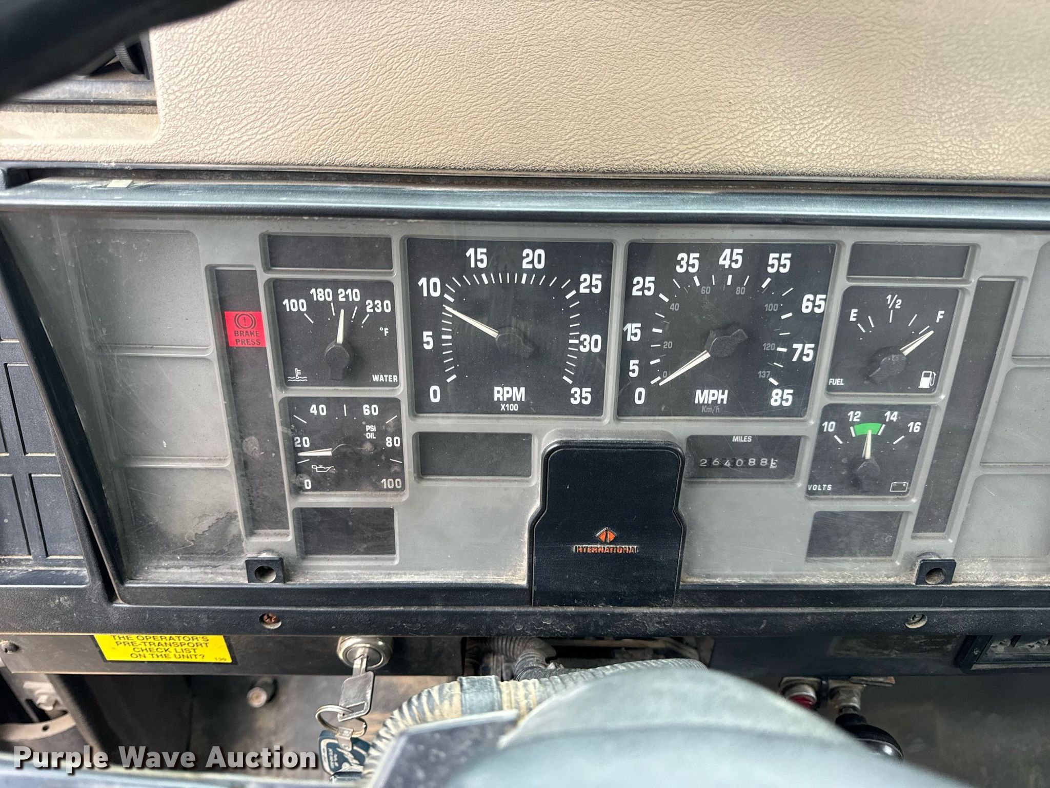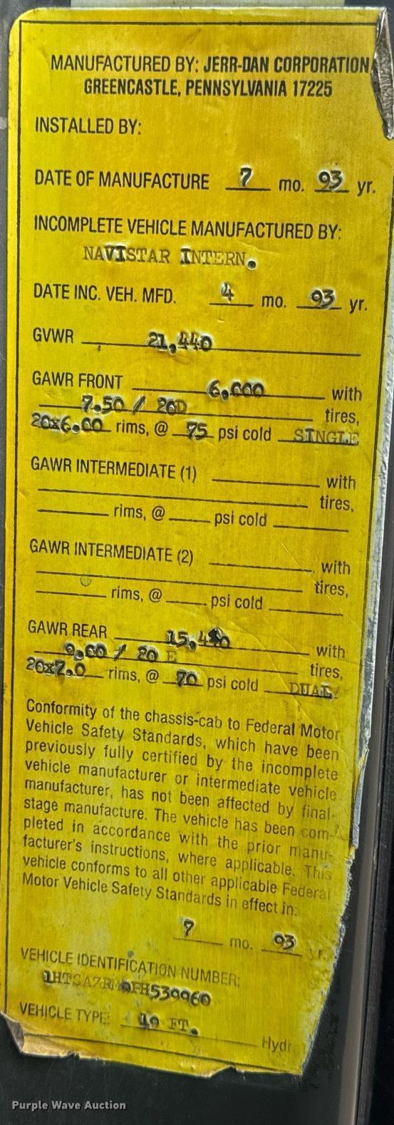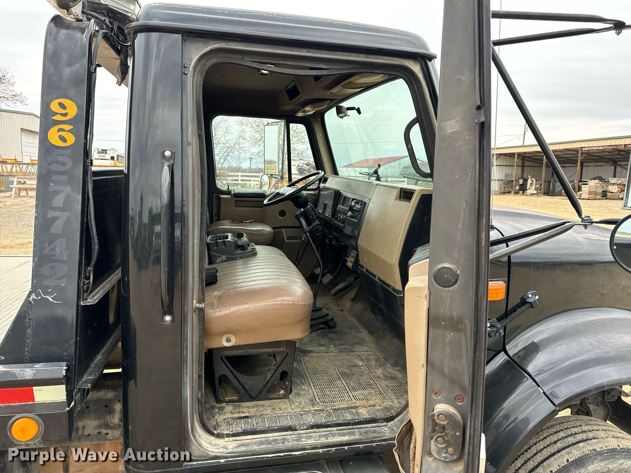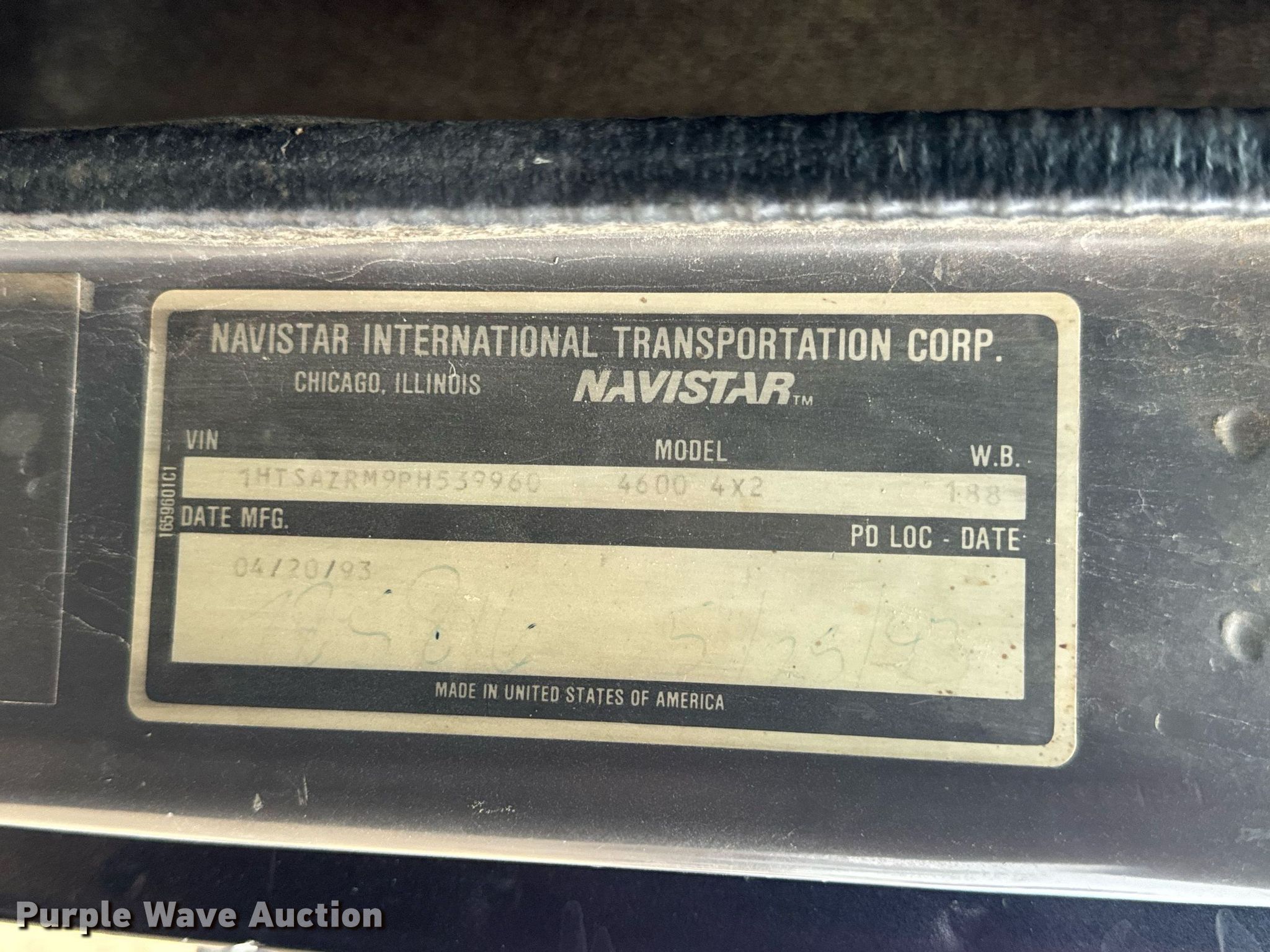 1993 International 4600 rollback truck. Miles: 264,089 on odometer, VIN: 1HTSAZRM9PH539960. Engine International, Cylinders: 8, Fuel type: Diesel. Transmission Spicer, Manual, Speed: 5. Chassis Axles: Single, Suspension: Spring, Brakes: Hydraulic, PTO, GVWR: 21,440 lbs. Interior AC, Heat, Power windows, Auxiliary controls. Features Rollback bed Jerr-Dan Corp. 19AEL, Serial: 27047, 19' L x 90" W, Ram: Double, Winch, Underlift. Notes Dash warning indicator: Brake. Missouri title. Title distribution may be delayed up to 14 days from verification of funds. S&A Equipment & Builders. Fulton, MO 65251