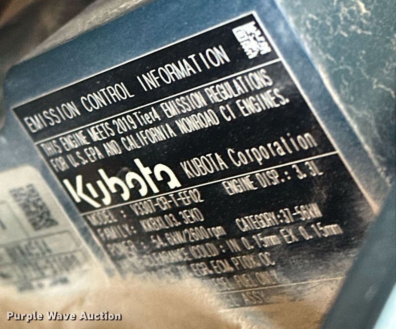 2020 Kubota SSV75 skid steer loader. Hours: 1,565 on meter, Serial: KBCZ141CLLJC25928. Engine Kubota V3307, Serial: 8KW4594, Displacement: 3.3L, Cylinders: 4, Fuel type: Diesel. Transmission Hydrostatic, Two speed travel. Operators station OROPS, Bucket control: Hand. Features Auxiliary hydraulics, Quick coupler: Hydraulic, Counter weights, Bucket Width: 65", Low profile, Cutting edge: Bolt-on. Tires Size: 33x6x11, Solid. Stewart Martin Equipment. Okmulgee, OK 74447