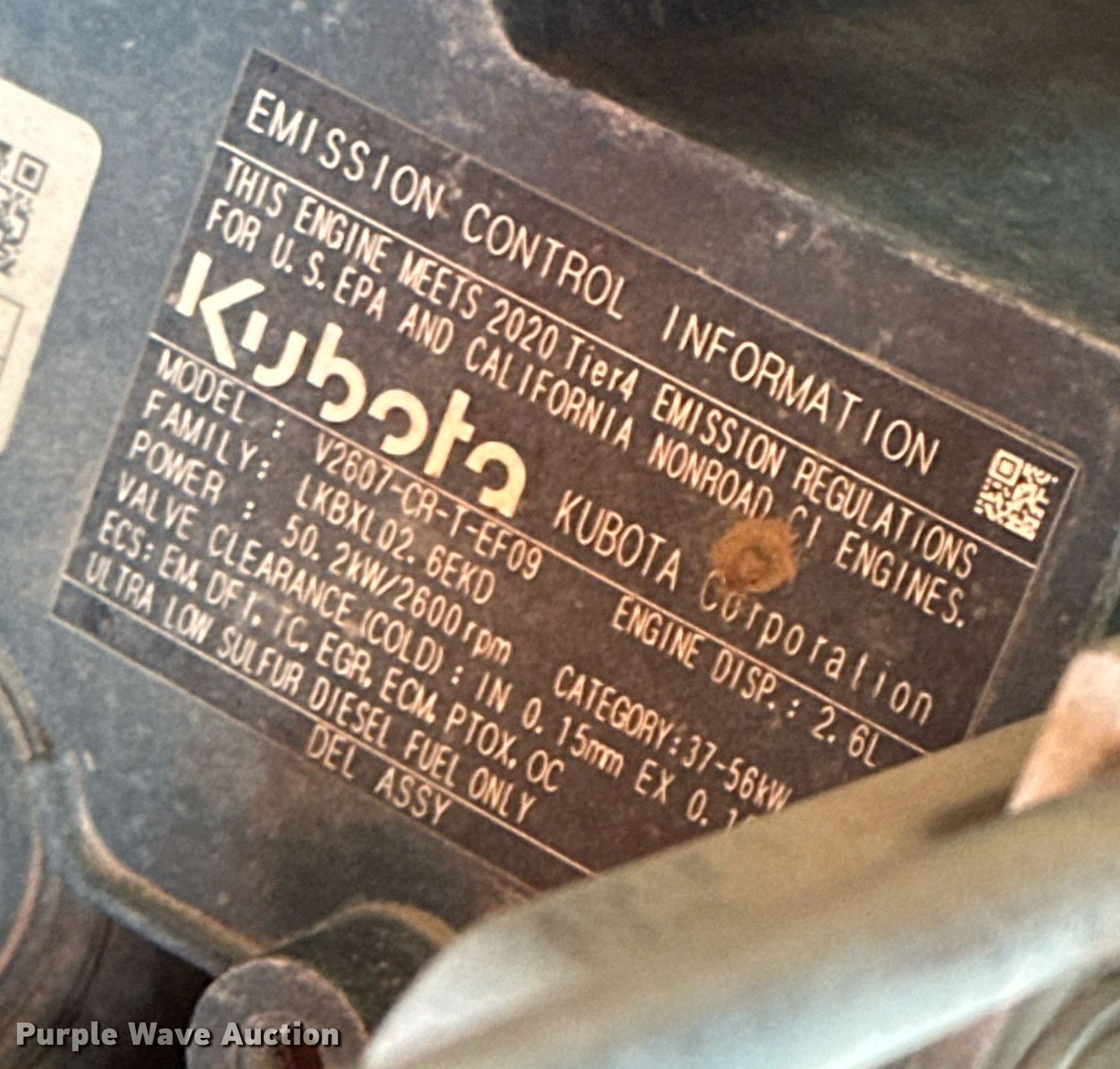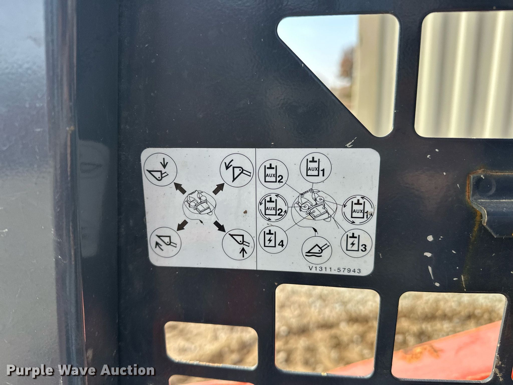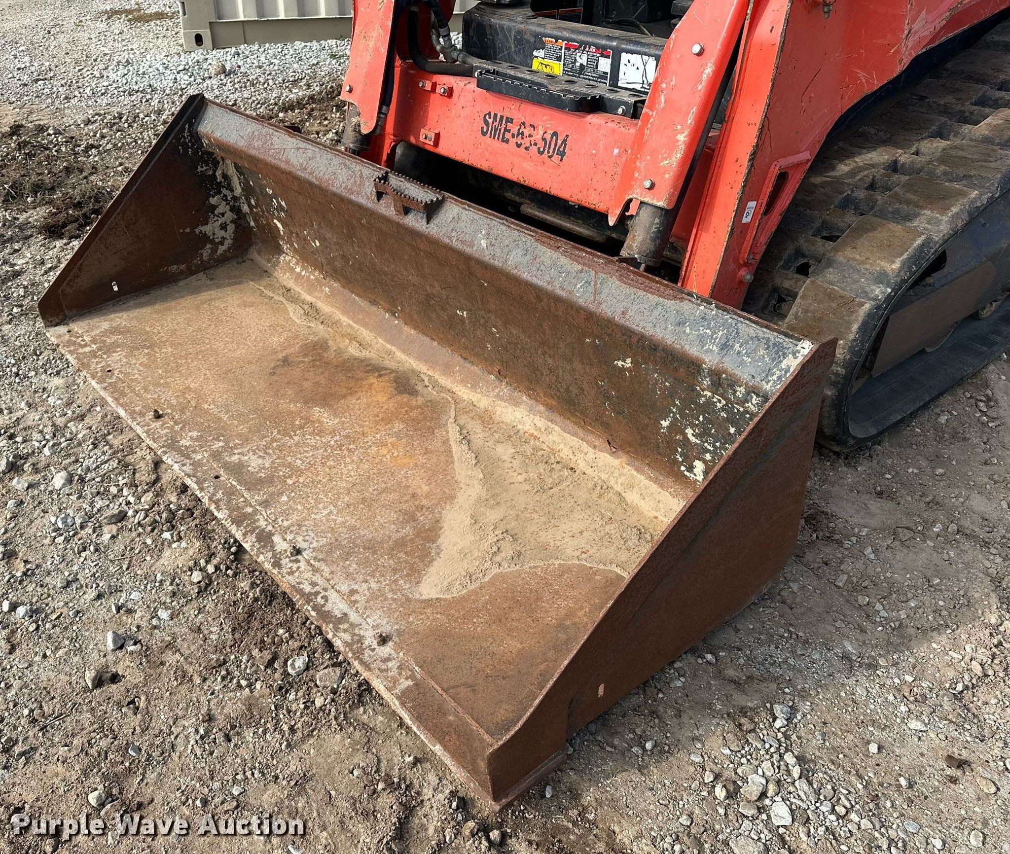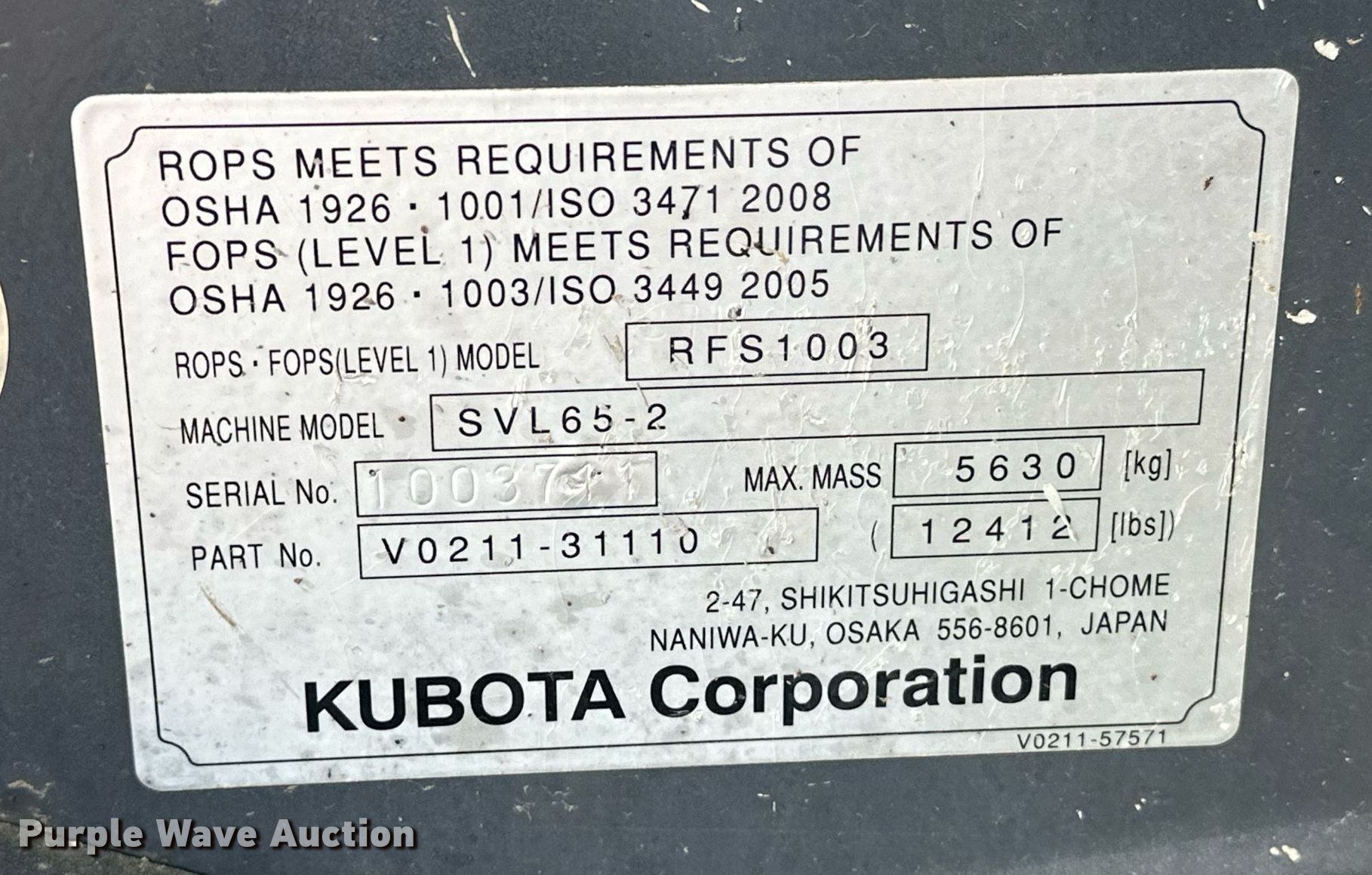 2017 Kubota SVL65-2 tracked skid steer loader. Hours: 1,336 on meter, Serial: KBCZ021CJL1B13504. Engine Kubota V2607, Serial: 8LA1573, Displacement: 2.6L, Cylinders: 4, Fuel type: Diesel. Transmission Hydrostatic, Two speed travel. Operators station OROPS, Bucket control: Hand. Features Auxiliary hydraulics, Auxiliary electrical outlet, Quick coupler: Manual, Bucket Width: 80", Low profile. Tracks Width: 15". Notes Bucket cracked. Stewart Martin Equipment. Okmulgee, OK 74447