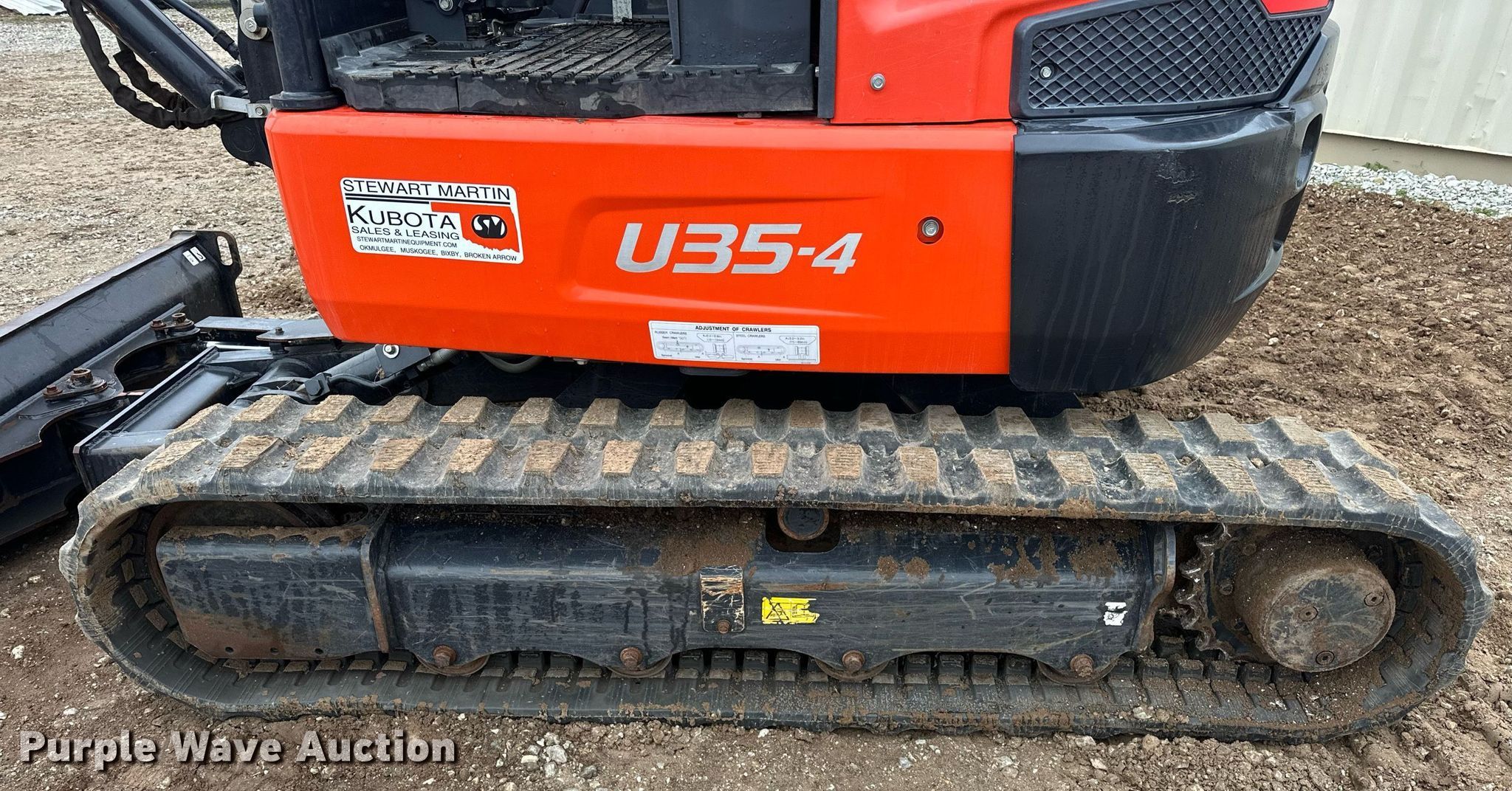 2021 Kubota U35-4 mini excavator. Hours: 453 on meter, Serial: KBCCZ78CVL3K18904. Engine Kubota D1703, Serial: 7LU1890, Displacement: 1.7L, Cylinders: 3, Fuel type: Diesel. Transmission Hydrostatic, Two speed travel. Operators station OROPS, Pattern changer. Features Auxiliary hydraulics Standard, Two-way, Counter weights, Removable, Backfill blade Width: 67", Boom Swing, Stick Stick length: 4' 4", Quick coupler: Mechanical, Thumb: Hydraulic, Bucket Width: 24", Teeth: 5. Tracks Width: 12", Rubber. Stewart Martin Equipment. Okmulgee, OK 74447