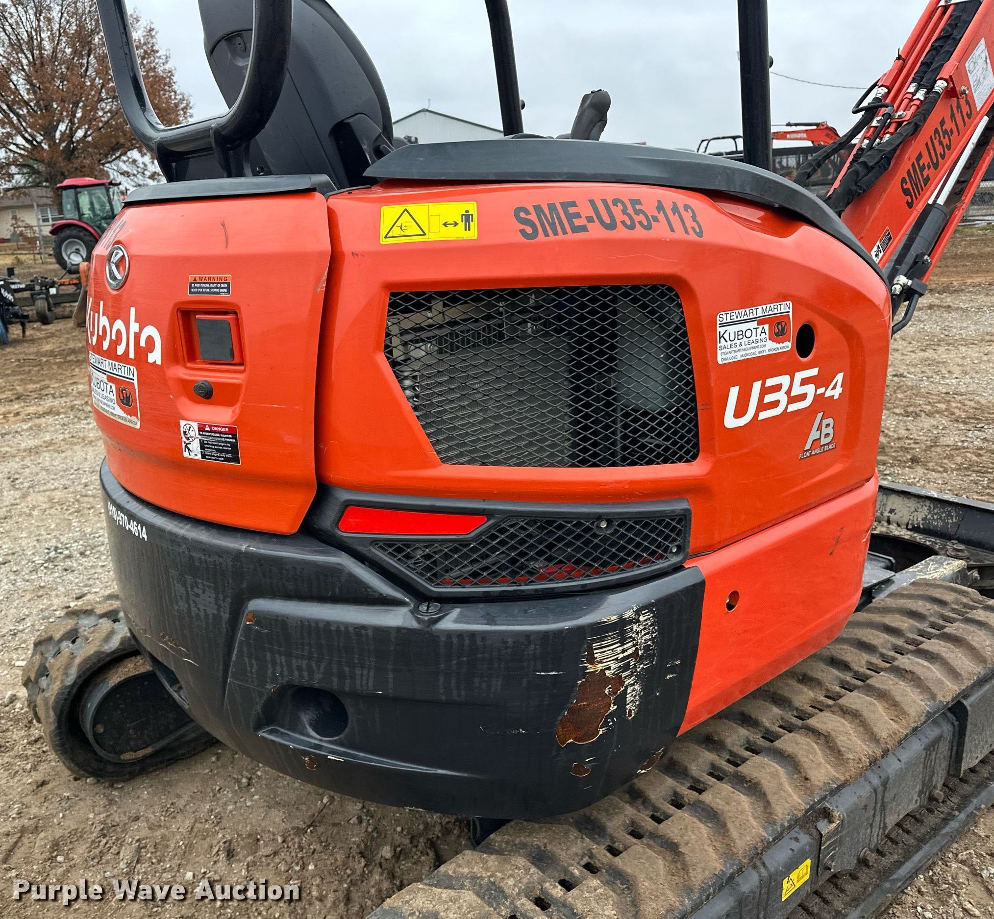 2022 Kubota U35-4 mini excavator. Hours: 668 on meter, Serial: KBCCZ78CAN3F22113. Engine Kubota D1703, Serial: 7NJ4153, Displacement: 1.6L, Cylinders: 3, Fuel type: Diesel. Transmission Hydrostatic, Two speed travel. Operators station OROPS, Pattern changer. Features Auxiliary hydraulics Standard, Two-way, Counter weights, Removable, Backfill blade Width: 67", Boom Swing, Stick Stick length: 4' 4", Quick coupler: Mechanical, Thumb: Hydraulic, Bucket Width: 18", Teeth: 4. Tracks Width: 12", Rubber. Stewart Martin Equipment. Okmulgee, OK 74447