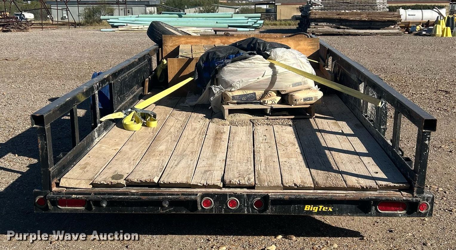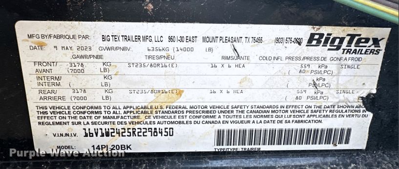 2024 Big Tex 14PI-20BK utility trailer. VIN: 16V1W2425R2298450. Dimensions Length: 20', Ramps: Manual Length: 4'. Features Deck type: Wood. Chassis Ball hitch: 2 5/16", Landing gear: Single, Suspension: Spring, Brakes: Electric, Axles: Tandem, GVWR: 14,000 lbs. Tires Size: 235/80R16. Notes Contents not included. Texas title. Title has a lien that will be released following the close of the auction. Title distribution may be delayed up to 30 days from verification of funds. Flow Tx Energy West Texas Region. Cotulla, TX 78014
