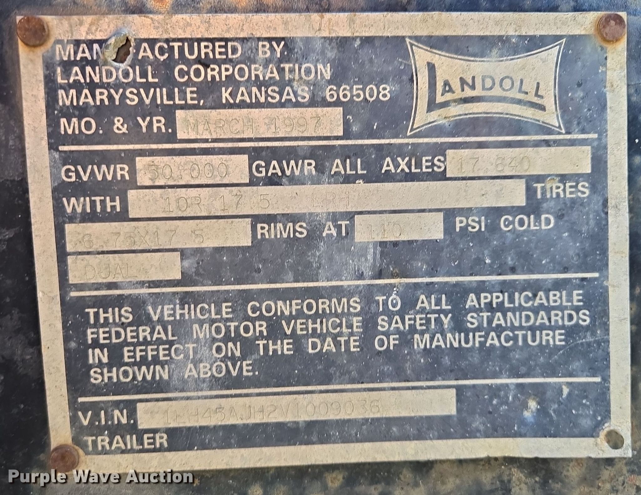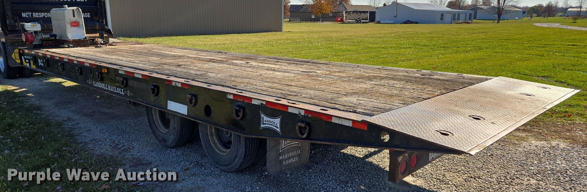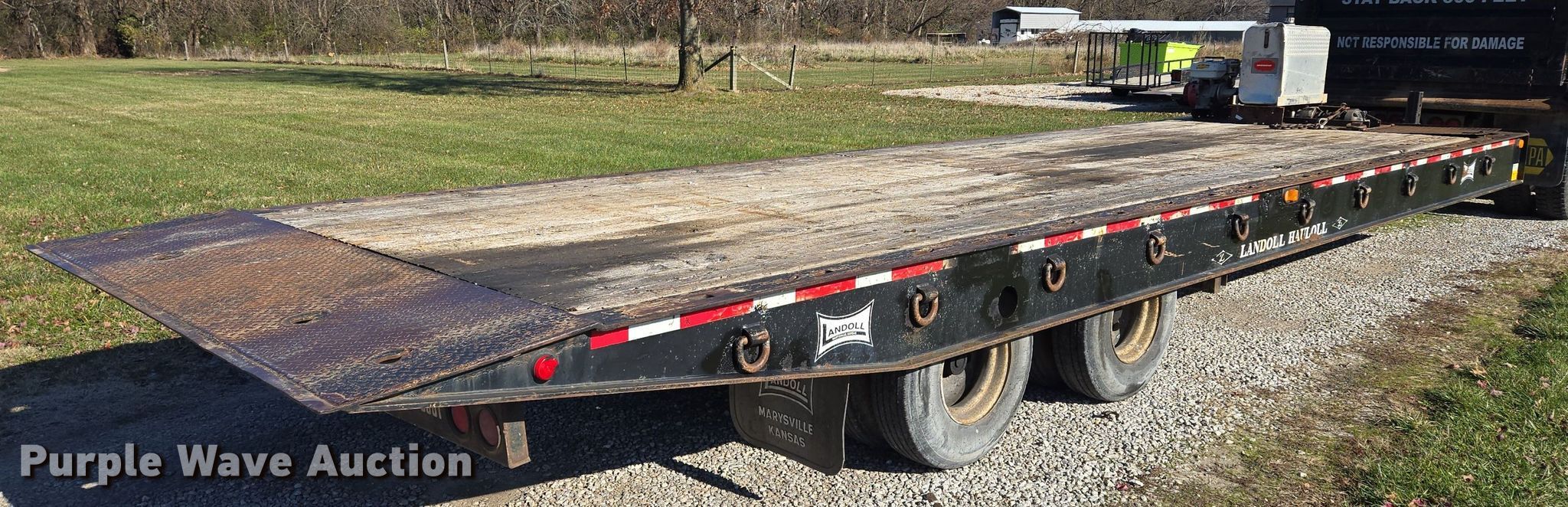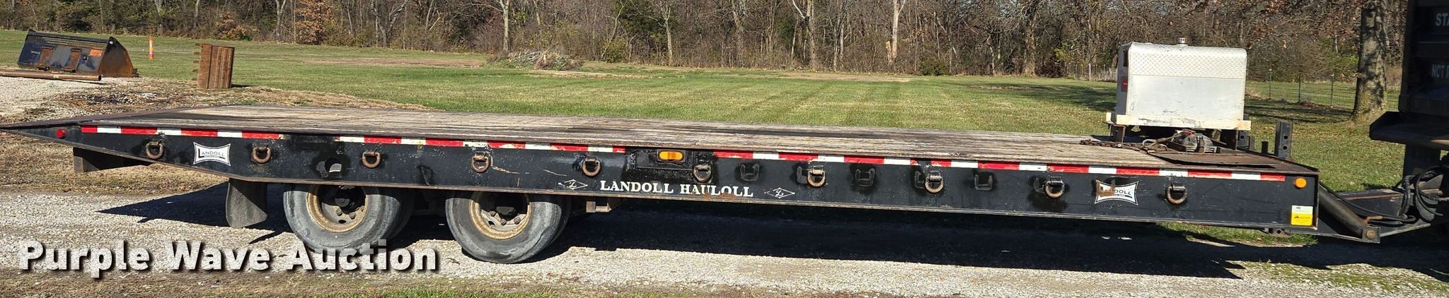 1997 Landoll tilt deck equipment trailer. VIN: 1LH45AJH2V1009036. Dimensions Overall: 36' 6" L x 102" W, Deck: 31' L x 102" W, Deck height: 38". Features Deck type: Wood, Self-contained hydraulics, Winch Braden, Hydraulic controls: Manual. Chassis Hitch: Pintle, Landing gear: Dual, Suspension: Spring, Brakes: Air, Axles: Tandem Sliding, GVWR: 50,000 lbs. Tires Steel wheels, Size: 10R17.5. Notes Truck not included. Missouri title. Title distribution may be delayed up to 14 days from verification of funds. Lone Jack, MO 64070