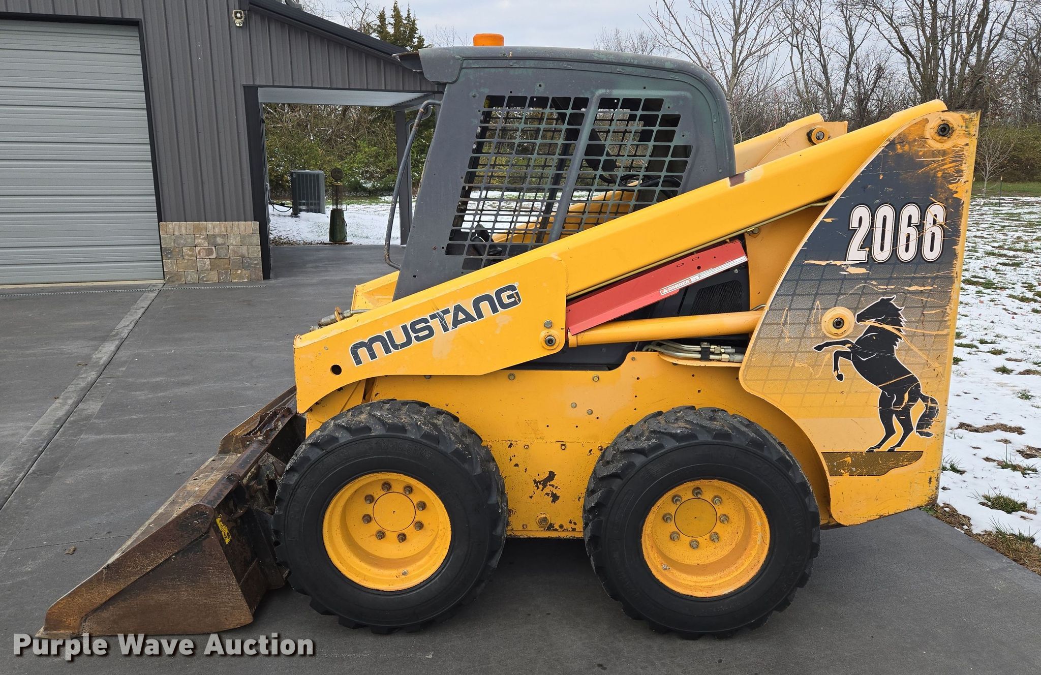 2008 Mustang 2066 skid steer loader. Hours: 5,039 on meter, Serial: MMC02066A00005682. Engine Yanmar 3TNNA, Displacement: 3.319L, Cylinders: 3, Fuel type: Diesel. Transmission Hydrostatic. Operators station Enclosed cab, Bucket control: Foot. Features Auxiliary hydraulics, Quick coupler: Manual, Bucket Width: 66". Tires Size: 12-16.5. Notes Belly pan removed, but included. KC Mowers. Oak Grove, MO 64075