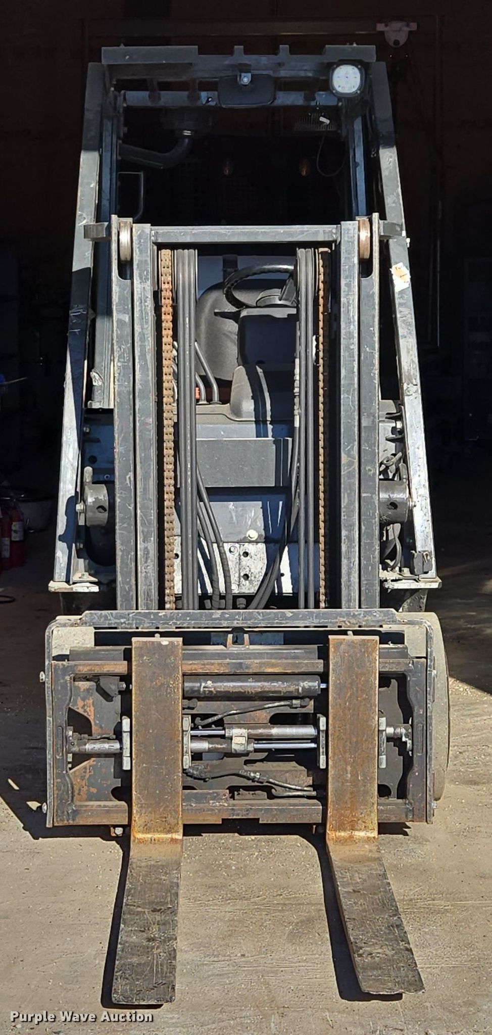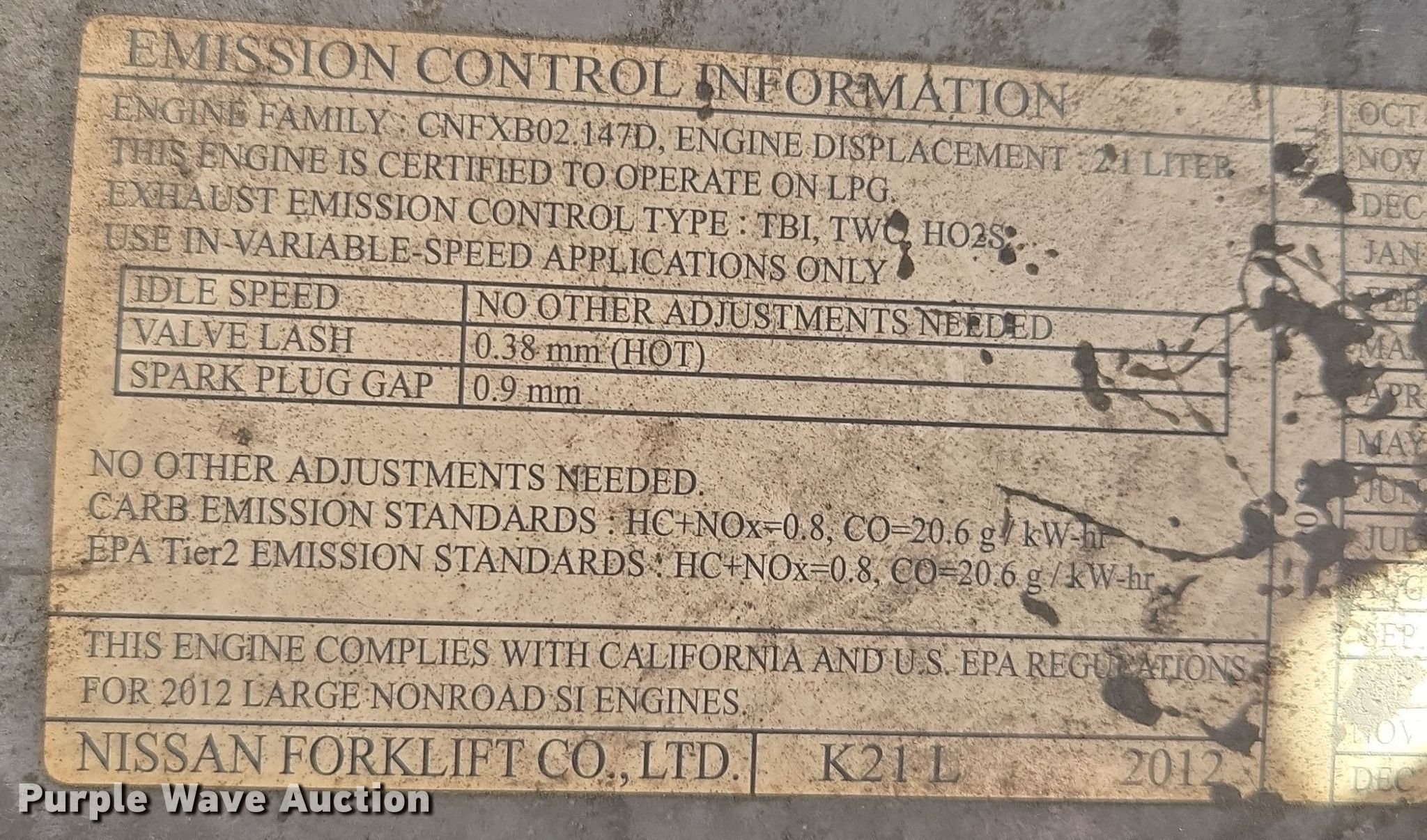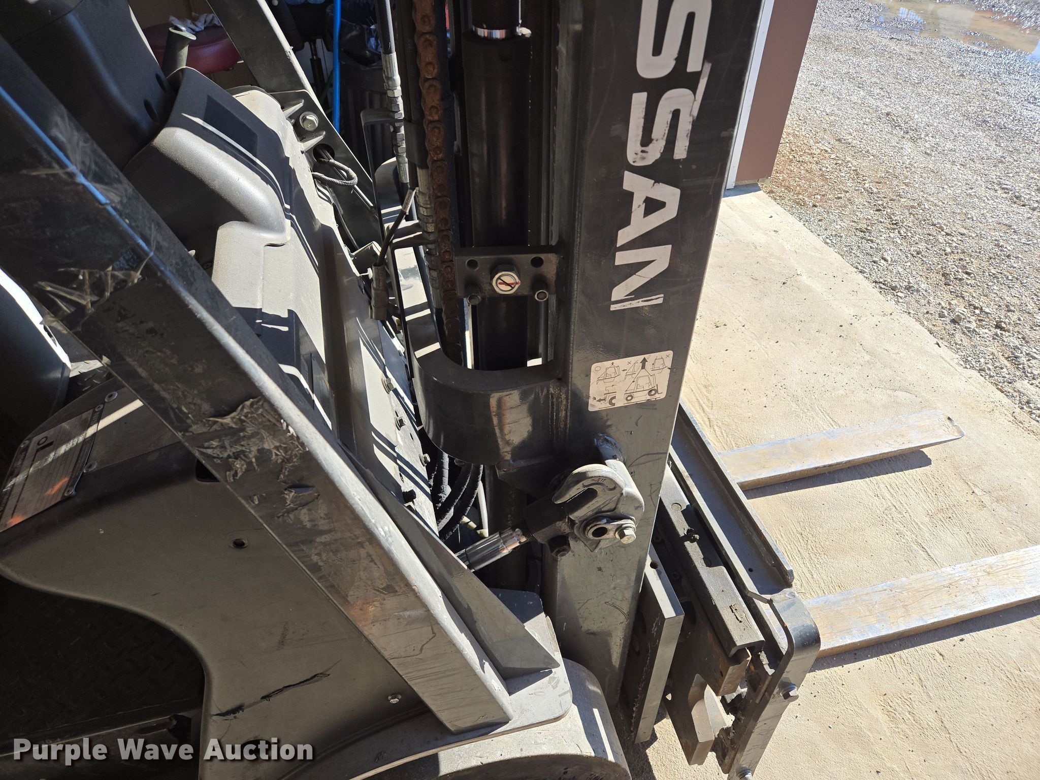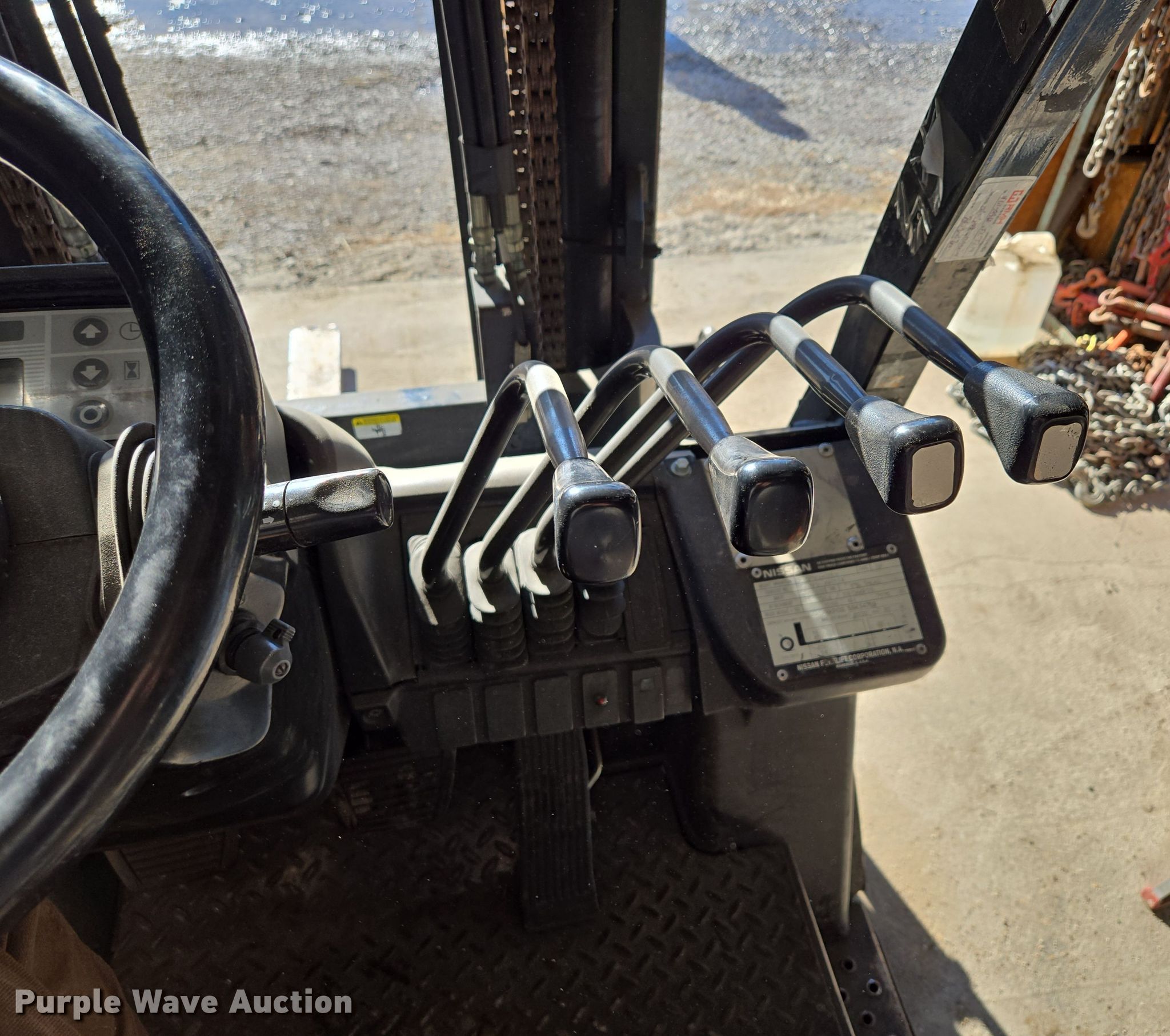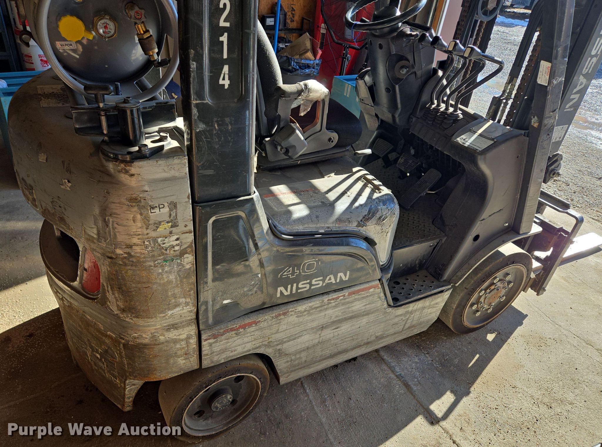 Nissan 40 forklift. Hours: 15,263 on meter, Serial: G409681. Engine Nissan CNFXB02.147D, Displacement: 2.1L, Cylinders: 4, Fuel type: LPG LP bottle: Not included. Transmission Powershift. Operators station Canopy, Onboard scale system. Features Maximum lift capacity: 4,000 lbs, Maximum lift height: 80", Mast stages: 2, Side shift, Mast tilt, Fork length: 40". Tires Front: 533/17-381, Rear: 16 1/4 x 6 x 11 1/4, Solid. Notes Scale monitor missing. Higginsville, MO 64037