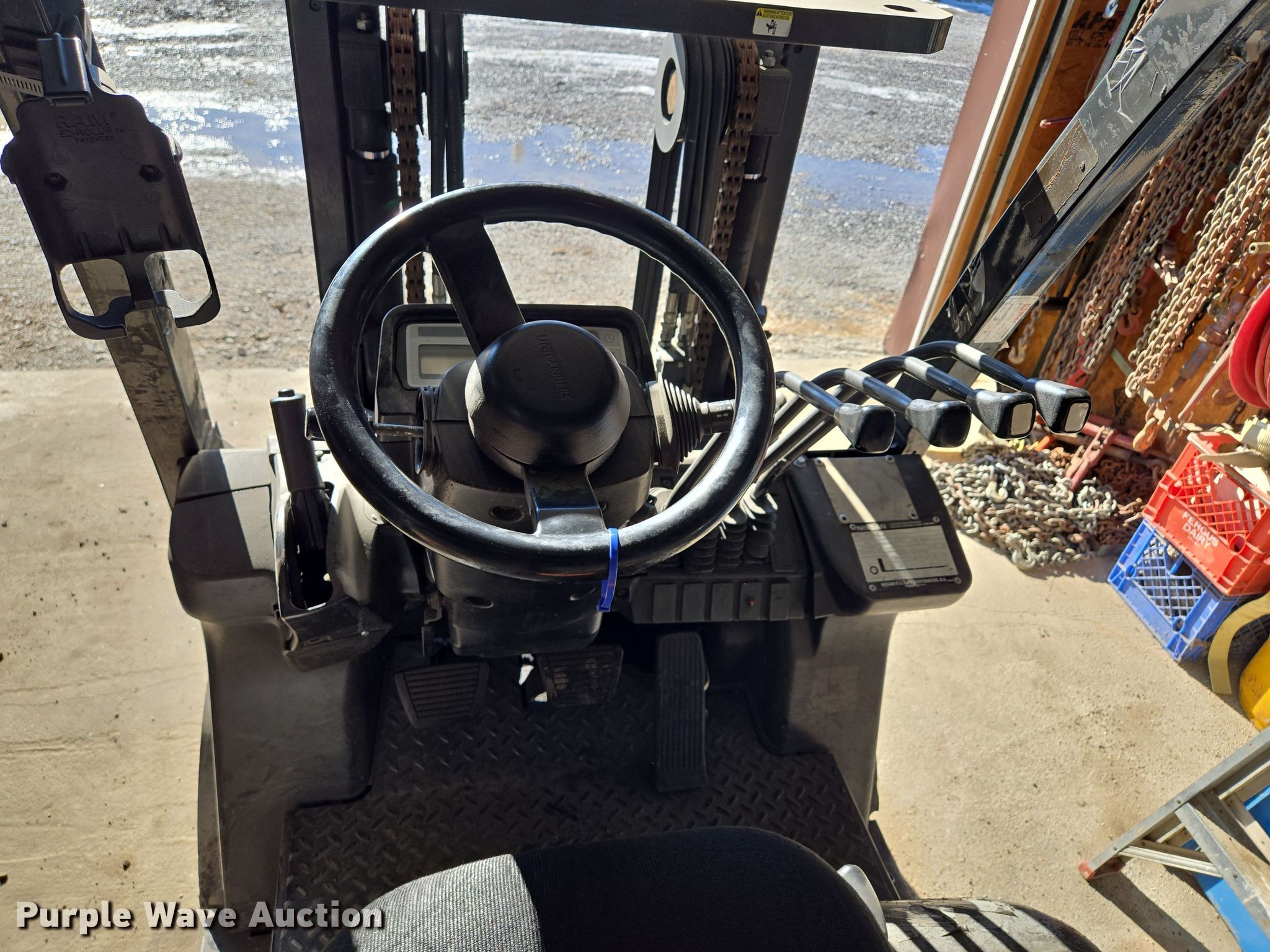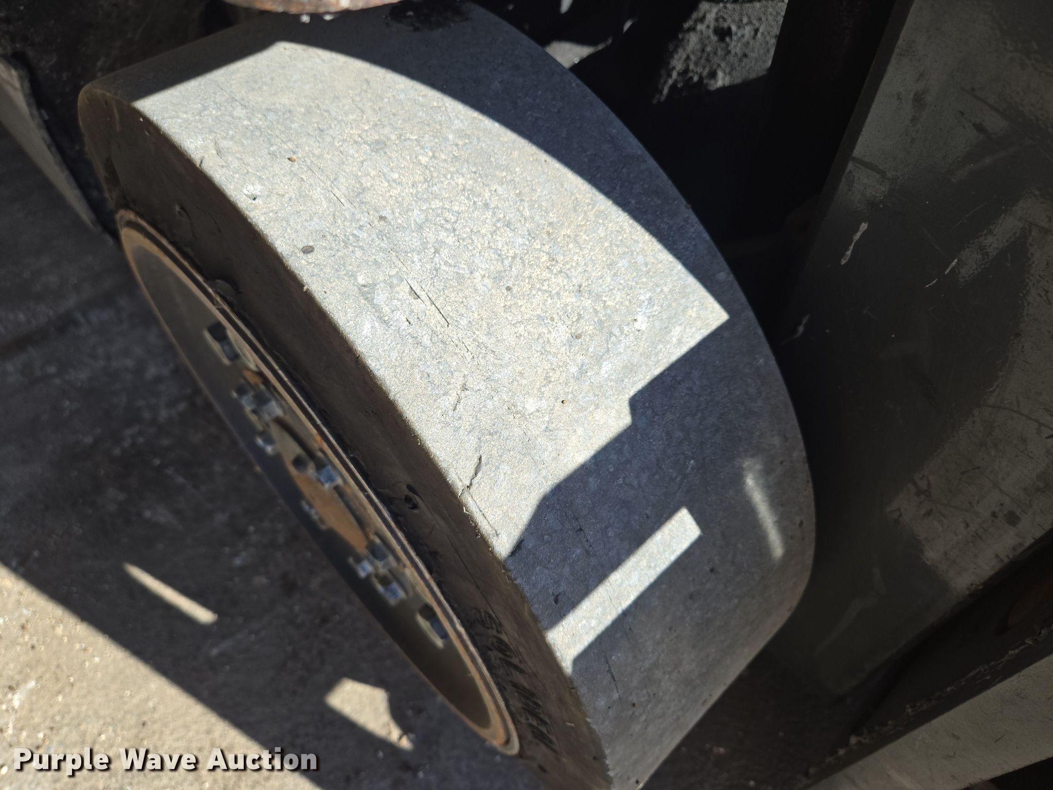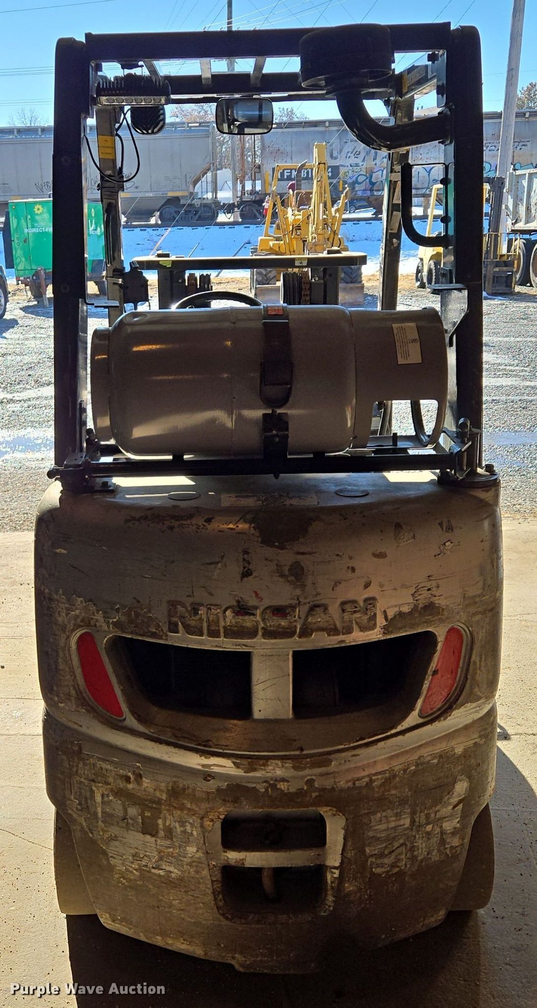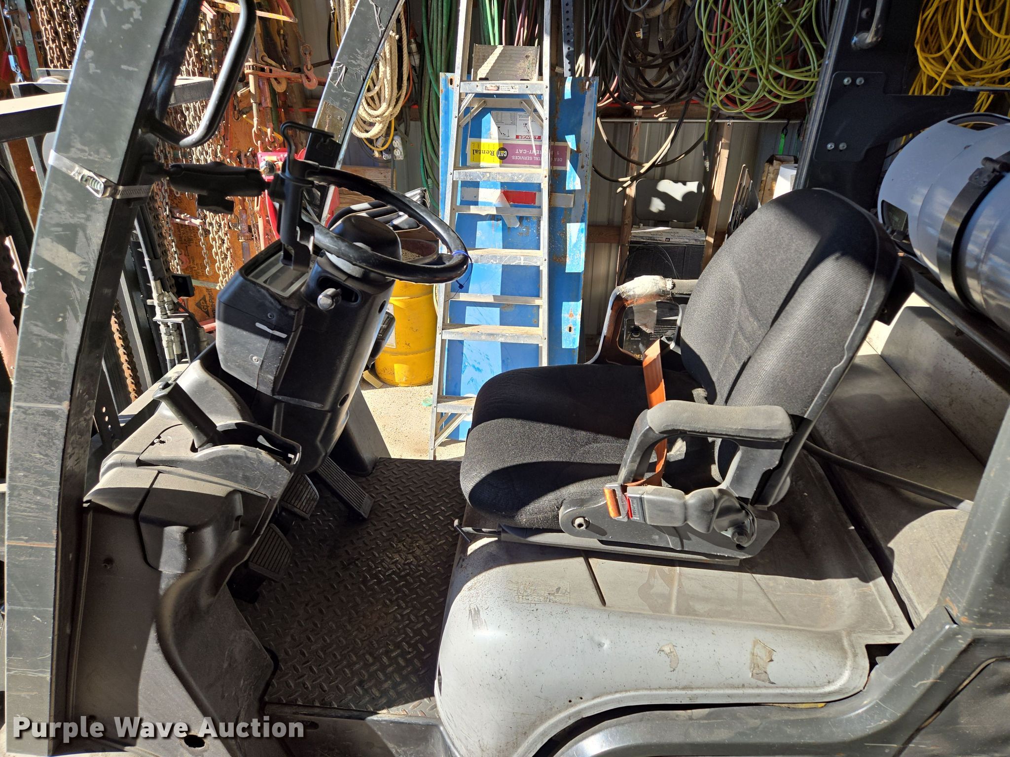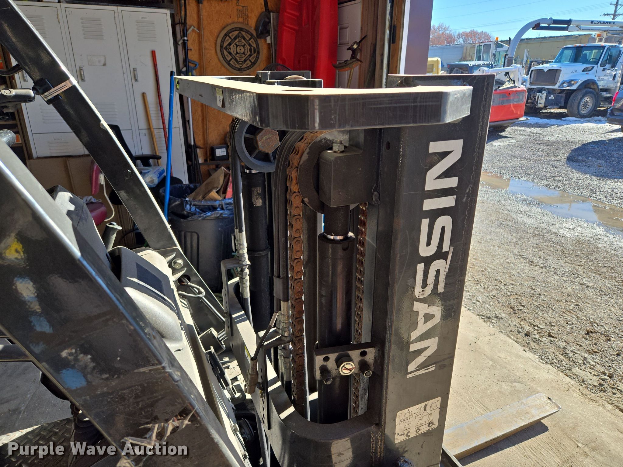 Nissan 40 forklift. Hours: 15,263 on meter, Serial: G409681. Engine Nissan CNFXB02.147D, Displacement: 2.1L, Cylinders: 4, Fuel type: LPG LP bottle: Not included. Transmission Powershift. Operators station Canopy, Onboard scale system. Features Maximum lift capacity: 4,000 lbs, Maximum lift height: 80", Mast stages: 2, Side shift, Mast tilt, Fork length: 40". Tires Front: 533/17-381, Rear: 16 1/4 x 6 x 11 1/4, Solid. Notes Scale monitor missing. Higginsville, MO 64037