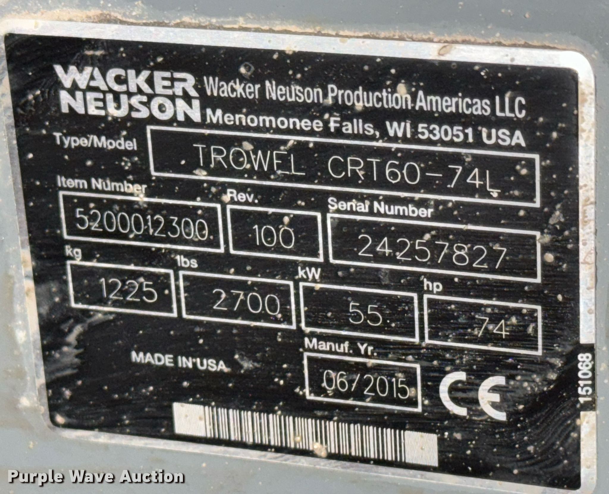Purple Wave is selling a used Concrete Equip. or Acces. in Kansas. This item is a 2015 Wacker Neuson CRT60-74L Power trowel with the following: Hours: 901 on meter, Serial: 24257827, Unit #: PT2R