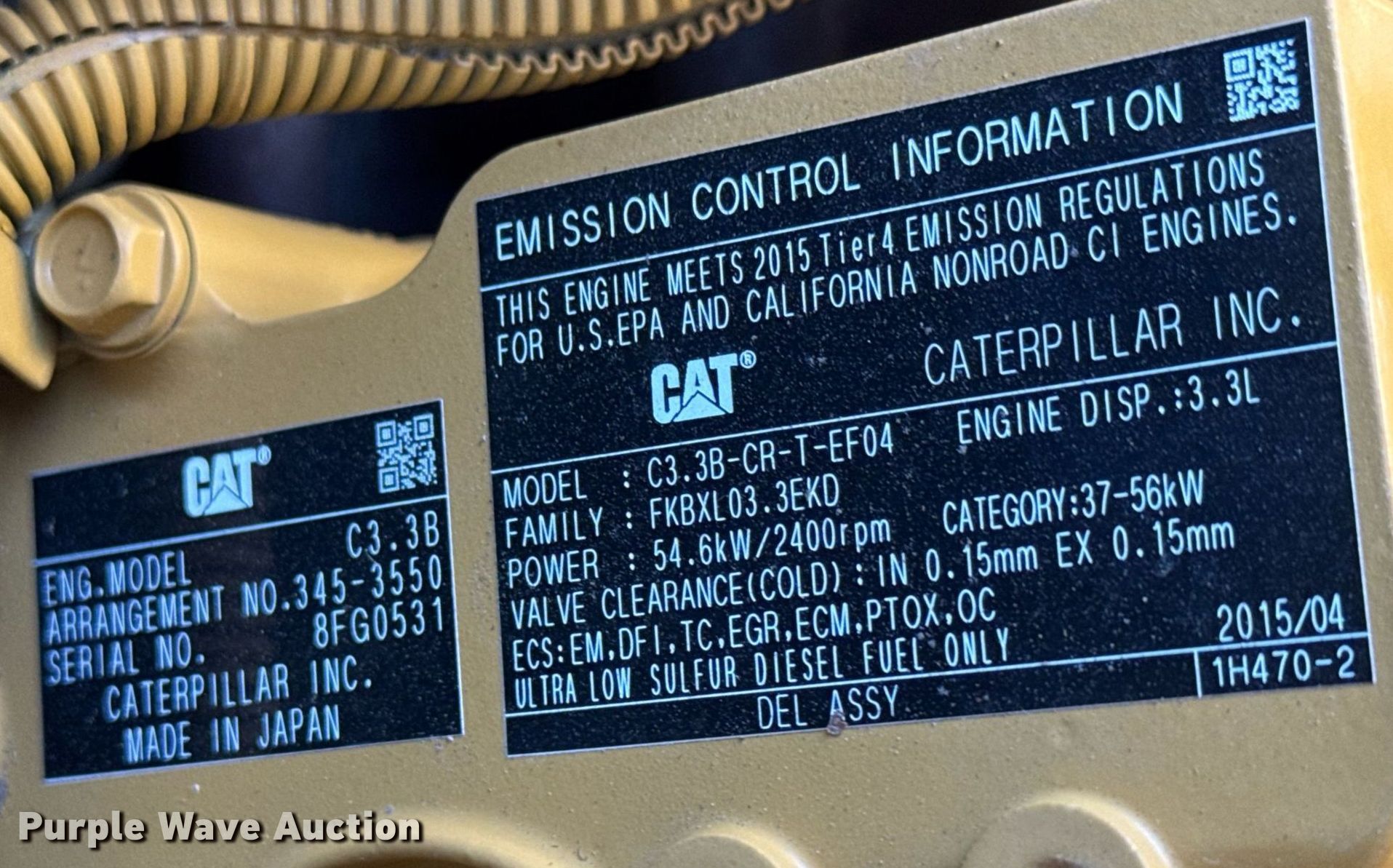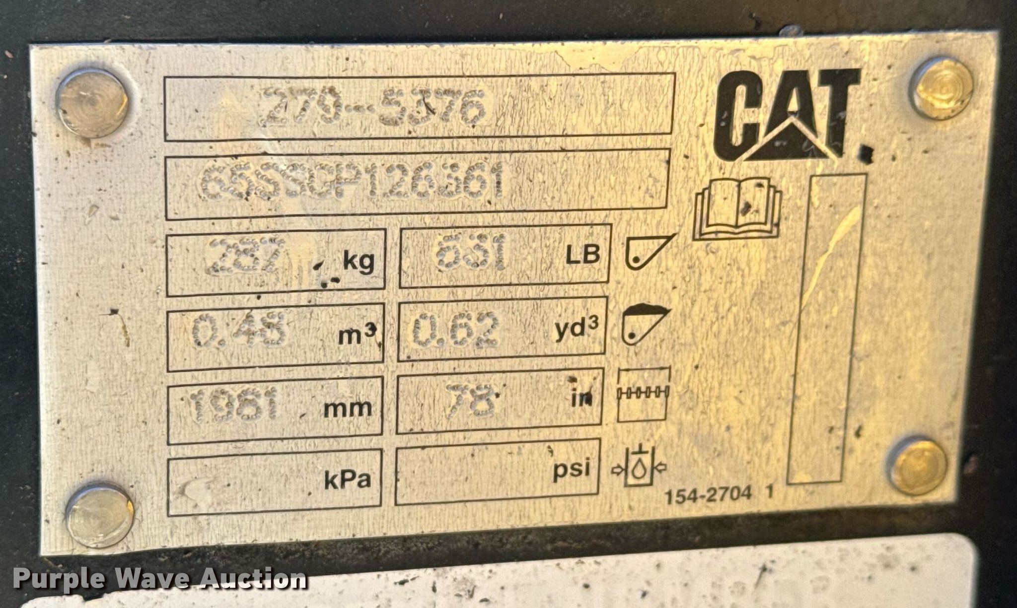 2015 Caterpillar 262D skid steer loader. Hours: 865 on meter, Serial: CAT026DPDTB03521. Engine Caterpillar C3.3B, Serial: 8FG0531, Displacement: 3.3L, Cylinders: 4, Fuel type: Diesel, kW: 54.6. Transmission Hydrostatic, Two speed travel. Operators station Enclosed cab, AC, Heat, Bucket control: Hand, Electronic Monitoring System panel. Features Auxiliary hydraulics, Auxiliary electrical outlet, Quick coupler: Hydraulic, Bucket Caterpillar 279-5376, Capacity: 0.62 cu.yd., Width: 80", Cutting edge: Bolt-on. Tires Size: 12-16.5. Item will be utilized during the removal process. Item will be available for load-out beginning January 14th. Derby, KS 67037