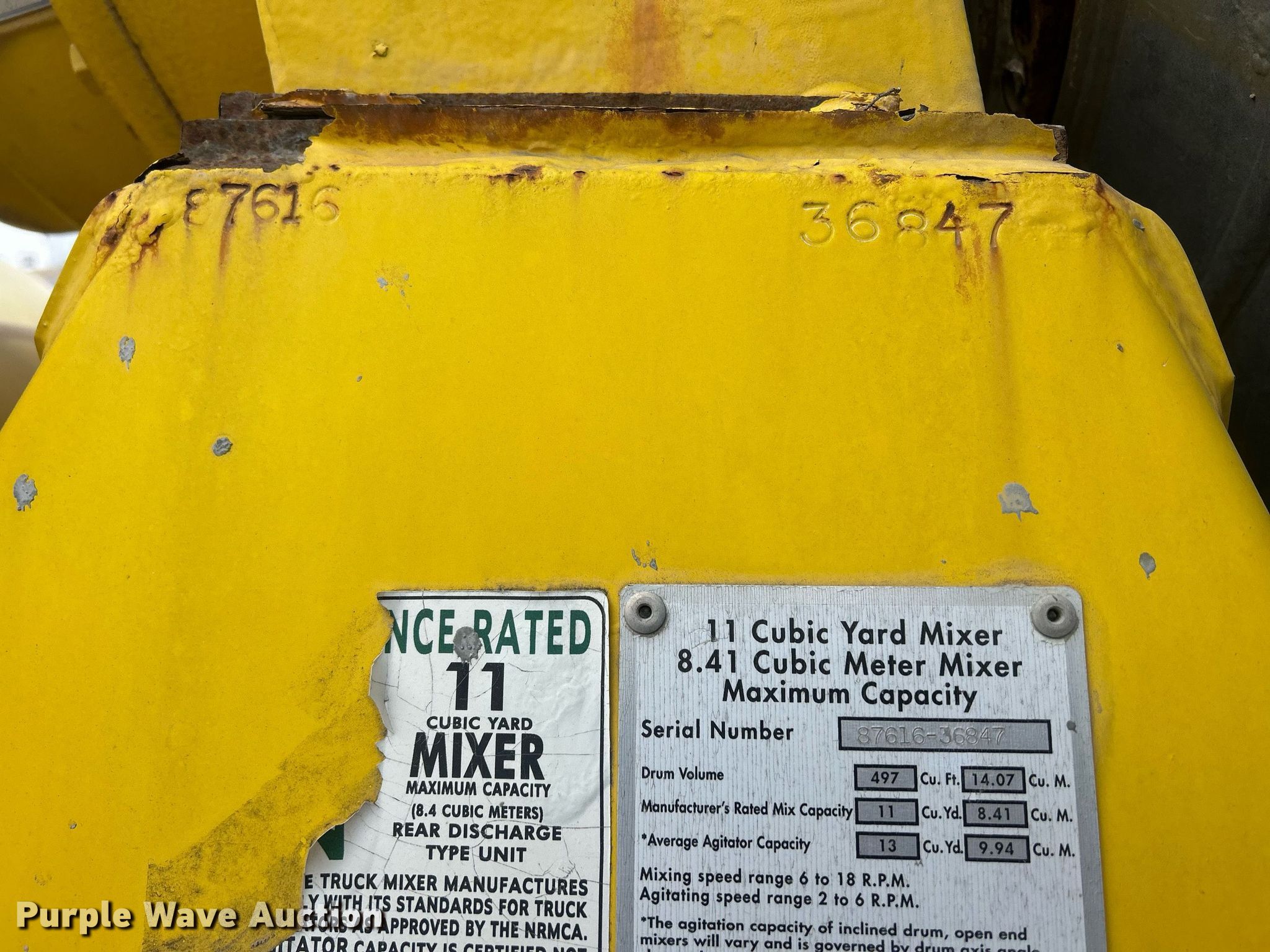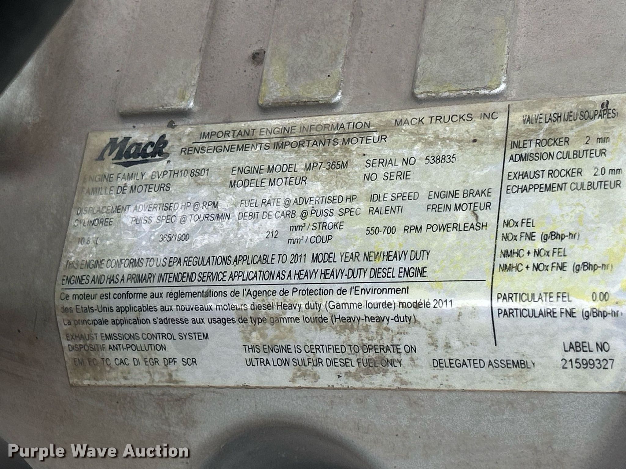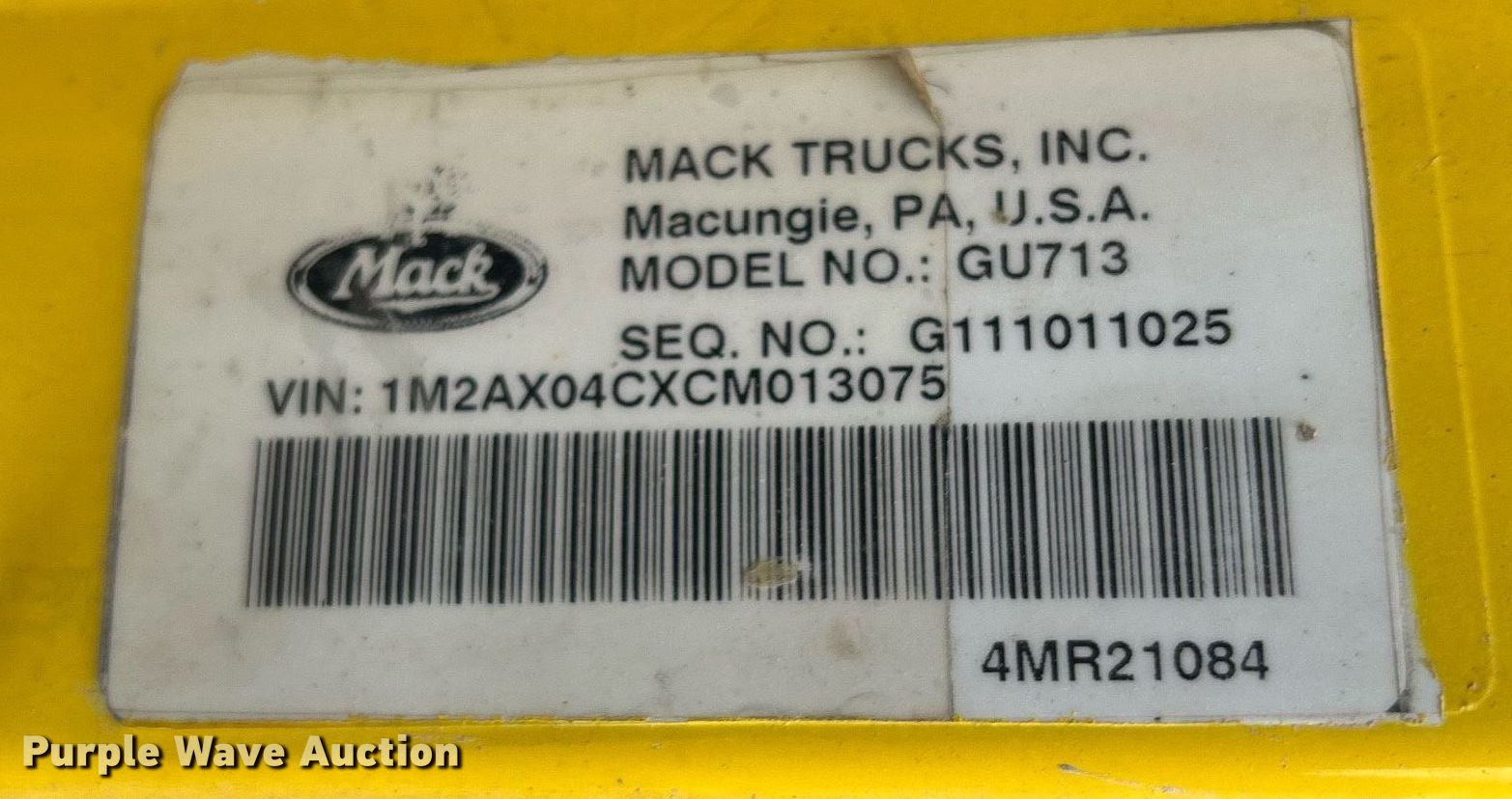 2012 Mack 700 GU ready mix truck. Miles: 139,219 on odometer, Hours: 7,824 on meter, VIN: 1M2AX04CXCM013075. Engine Mack MP7, Serial: 538835, Displacement: 10.8L, Cylinders: 6, Fuel type: Diesel. Transmission Eaton Fuller 9LL, Manual, Speed: 11. Chassis Axles: Triple, Steerable, Tag axle, Differential lock: Full, Suspension: Spring over walking beam, Brakes: Air, PTO, GVWR: 79,200 lbs, Wheelbase: 248". Interior AC, Heat, Heated mirrors, Power windows, Power locks, Cruise control. Features Mixer McNeilus, Serial: 87616-36847, Capacity: 11 cu.yd., Discharge: Rear, In-cab controls, Rear drum controls, Water tank capacity: 150 gallons, Chute Extensions: 3, Chute type: Aluminum.. Tires Front: 425/65R22.5, Rear: 11R22.5, Lift axle: 11R22.5. Notes Frame damage, rust. Illinois title. Title distribution may be delayed up to 14 days from verification of funds. Welch Ready Mix. Midlothian, IL 60445