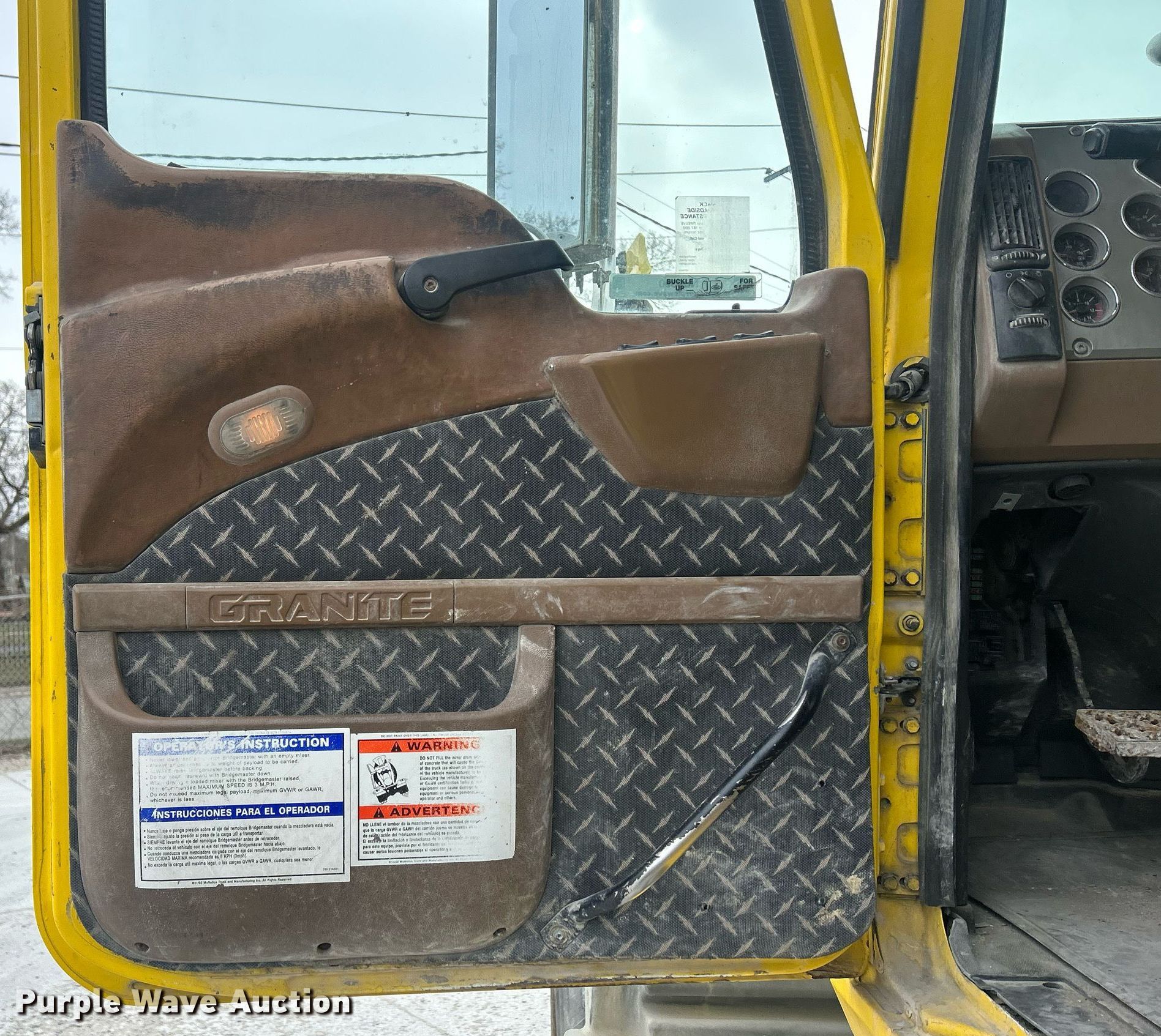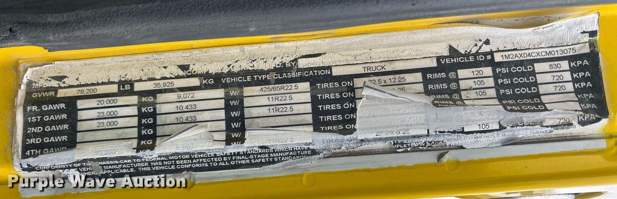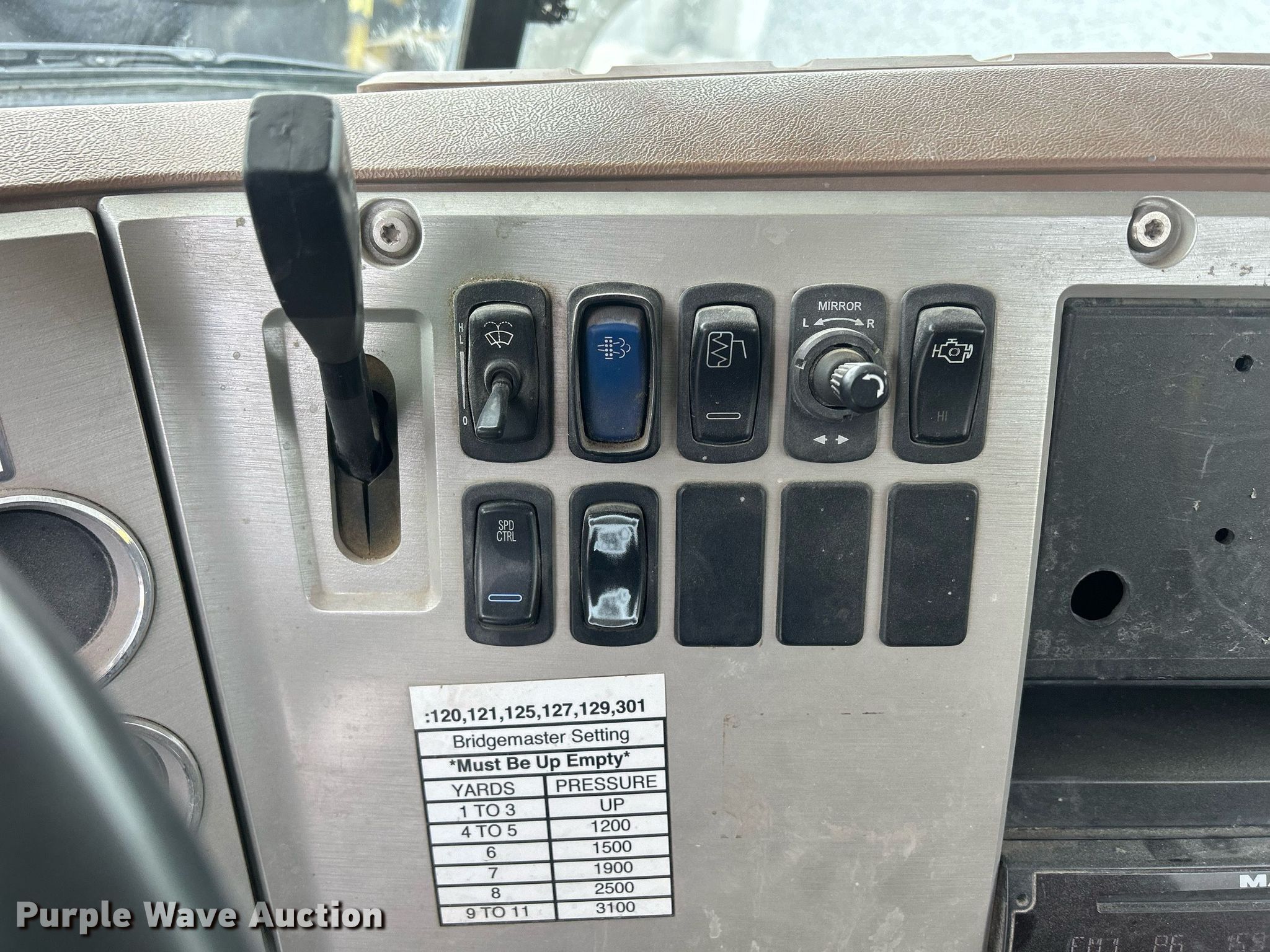 2012 Mack 700 GU ready mix truck. Miles: 139,219 on odometer, Hours: 7,824 on meter, VIN: 1M2AX04CXCM013075. Engine Mack MP7, Serial: 538835, Displacement: 10.8L, Cylinders: 6, Fuel type: Diesel. Transmission Eaton Fuller 9LL, Manual, Speed: 11. Chassis Axles: Triple, Steerable, Tag axle, Differential lock: Full, Suspension: Spring over walking beam, Brakes: Air, PTO, GVWR: 79,200 lbs, Wheelbase: 248". Interior AC, Heat, Heated mirrors, Power windows, Power locks, Cruise control. Features Mixer McNeilus, Serial: 87616-36847, Capacity: 11 cu.yd., Discharge: Rear, In-cab controls, Rear drum controls, Water tank capacity: 150 gallons, Chute Extensions: 3, Chute type: Aluminum.. Tires Front: 425/65R22.5, Rear: 11R22.5, Lift axle: 11R22.5. Notes Frame damage, rust. Illinois title. Title distribution may be delayed up to 14 days from verification of funds. Welch Ready Mix. Midlothian, IL 60445