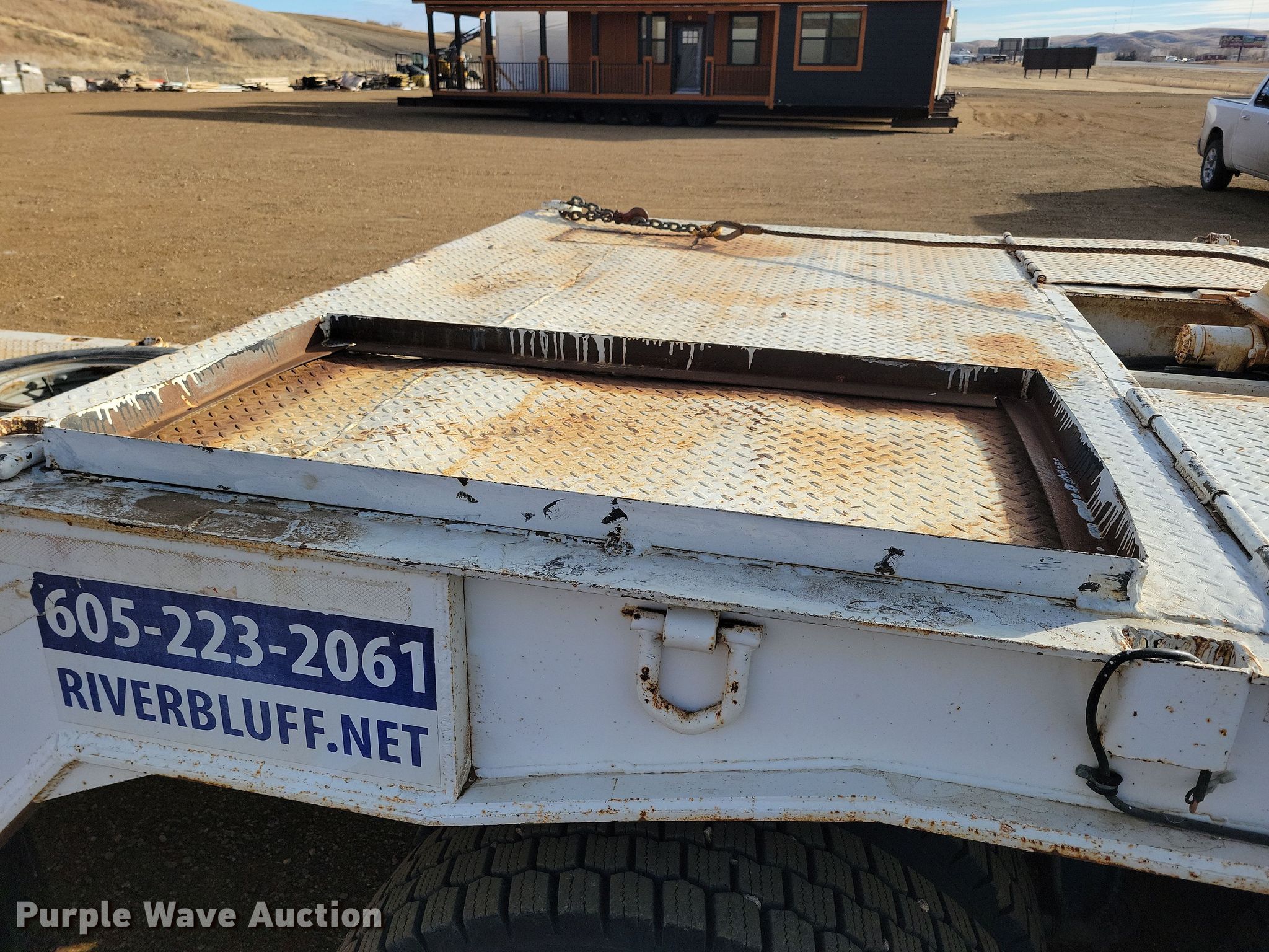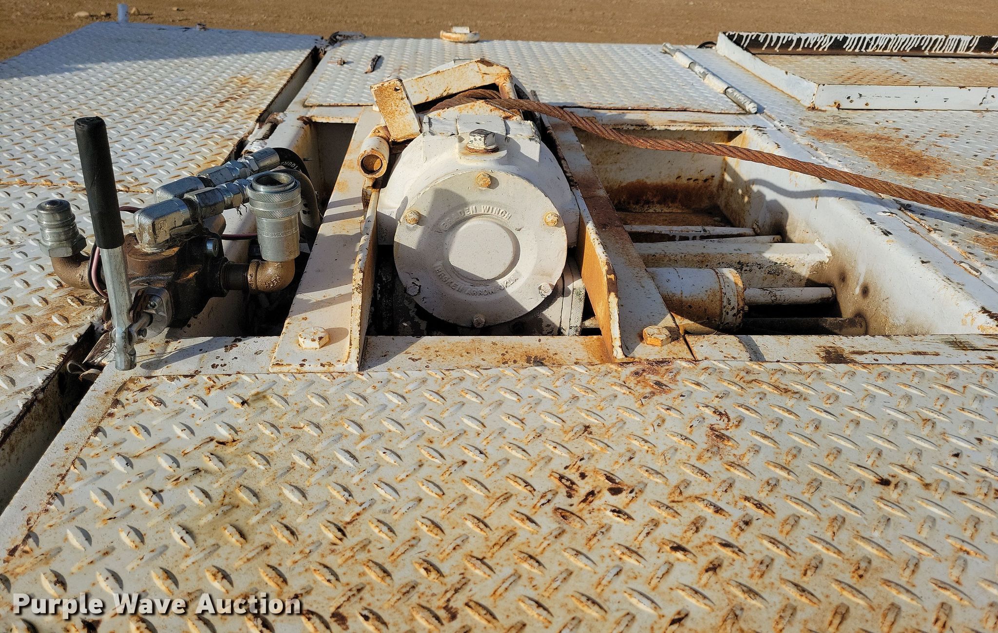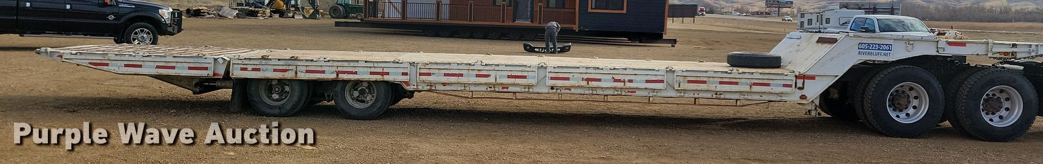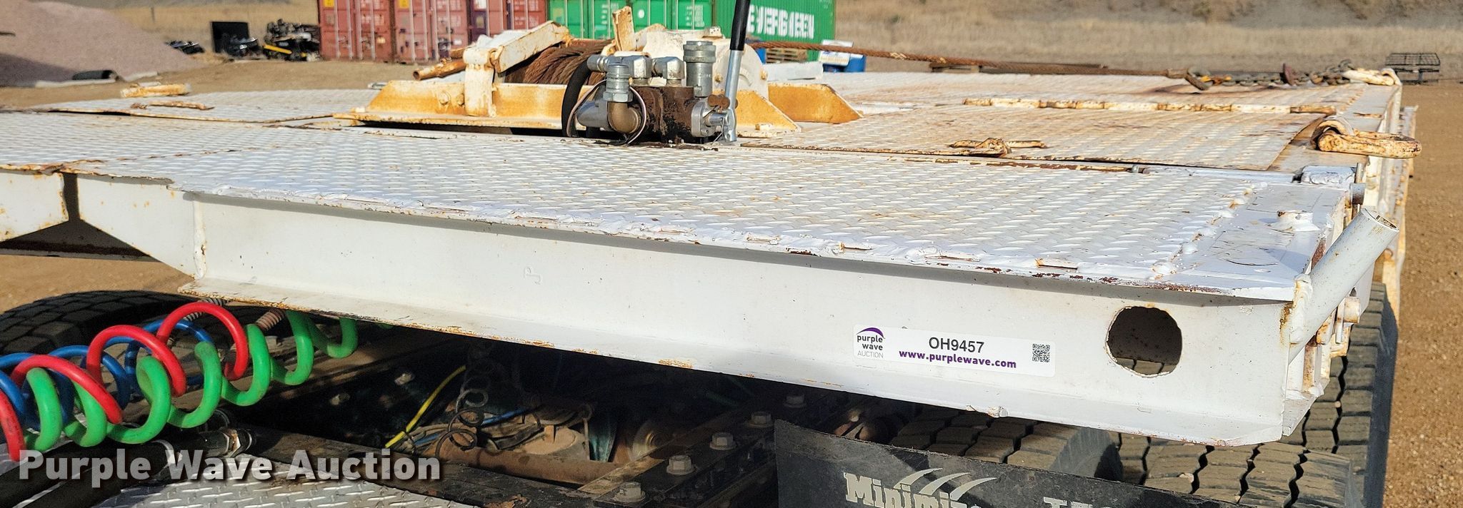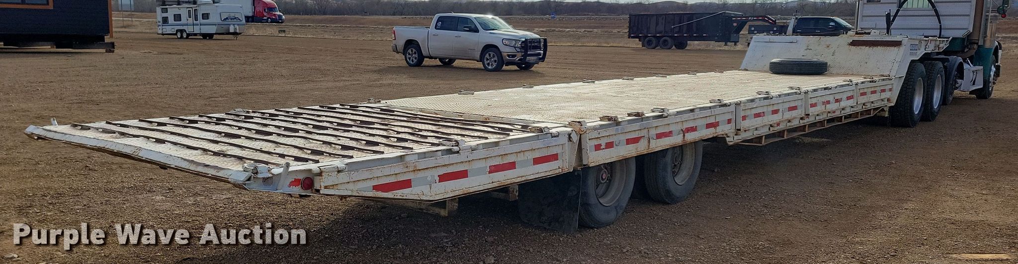 1975 Muv-All hydraulic tail equipment trailer. VIN: 3314. Dimensions Overall: 48' L x 96" W, Deck: 27' L x 94" W, Top deck length: 10', Deck height: 36", Hydraulic tail length: 9'. Features Deck type: Steel, Outriggers: Swing-out Board size: 10", Winch Braden, Hydraulic controls: Manual. Chassis Landing gear: Dual, Hydraulic, Suspension: Spring, Brakes: Air, Axles: Tandem. Tires Steel wheels, Size: 9R17.5. Notes Semi truck not included. South Dakota title. Title distribution may be delayed up to 30 days from verification of funds. River Bluff Custom Homes. Fort Pierre, SD 57532